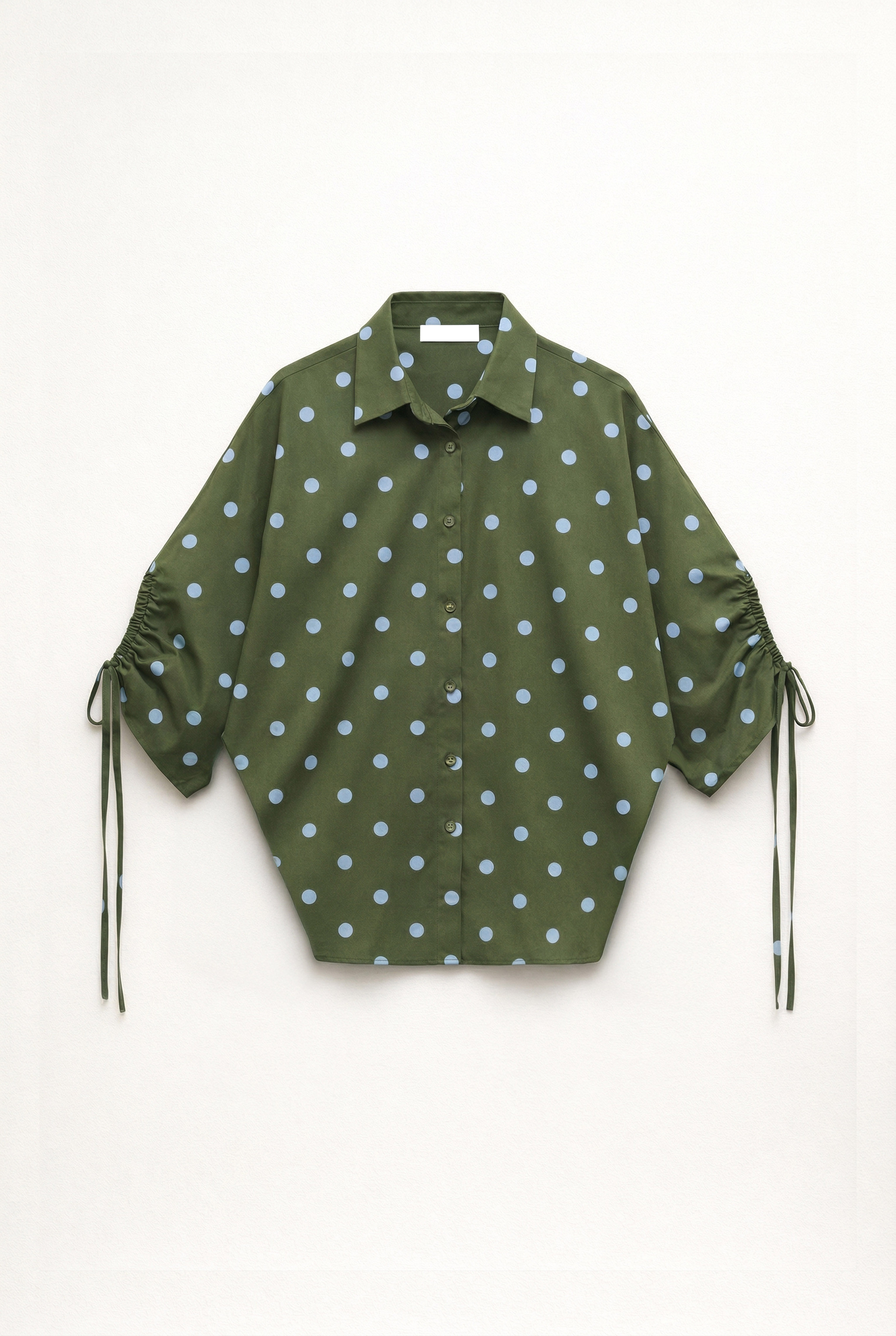 Cotton blend blouse with polka dot print. Wide sleeves with slit detail and adjustable drawstring. Gathered back and adjustable central opening with drawstring. Front closure with hidden buttons. Regular fit, available in ONE size.