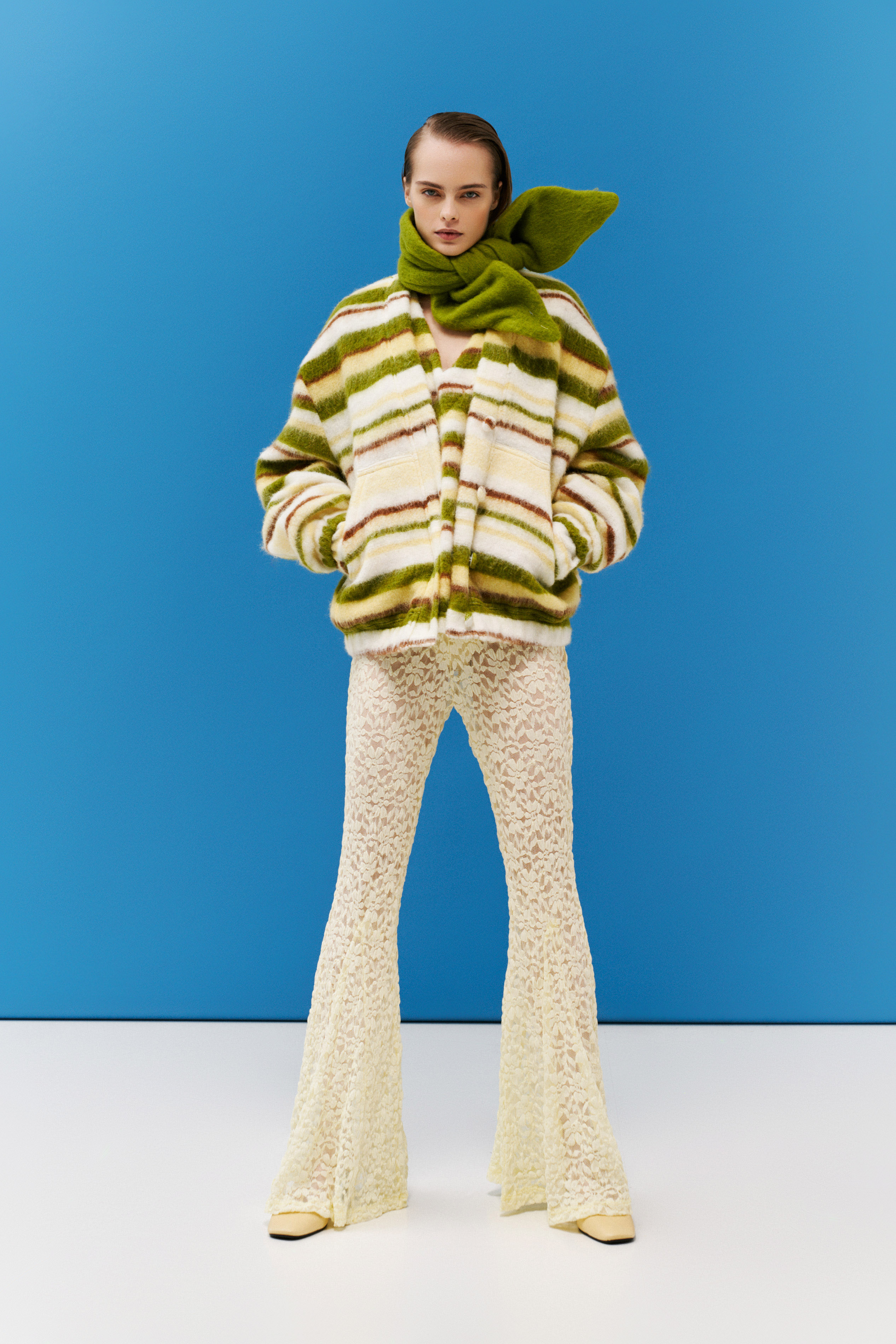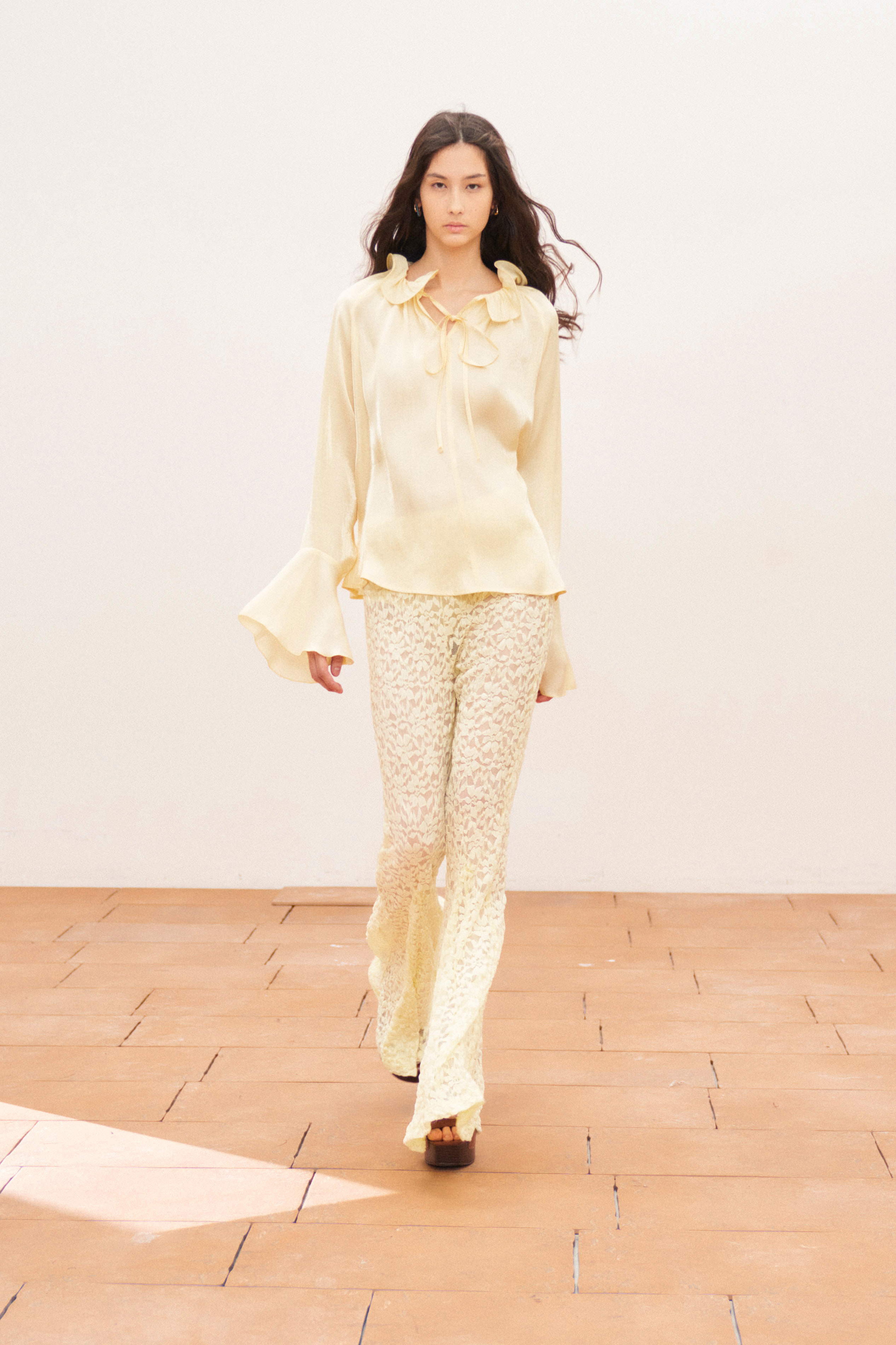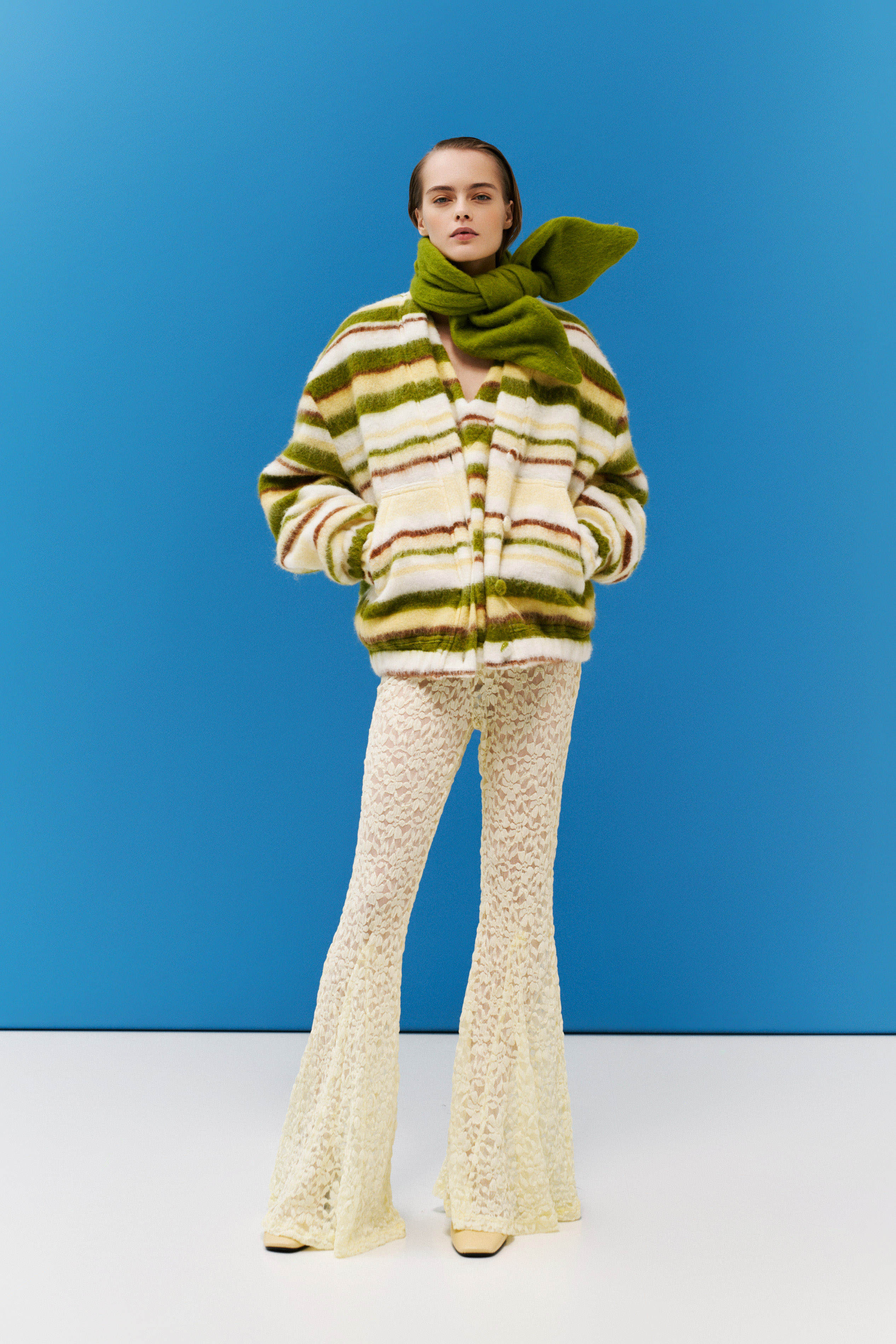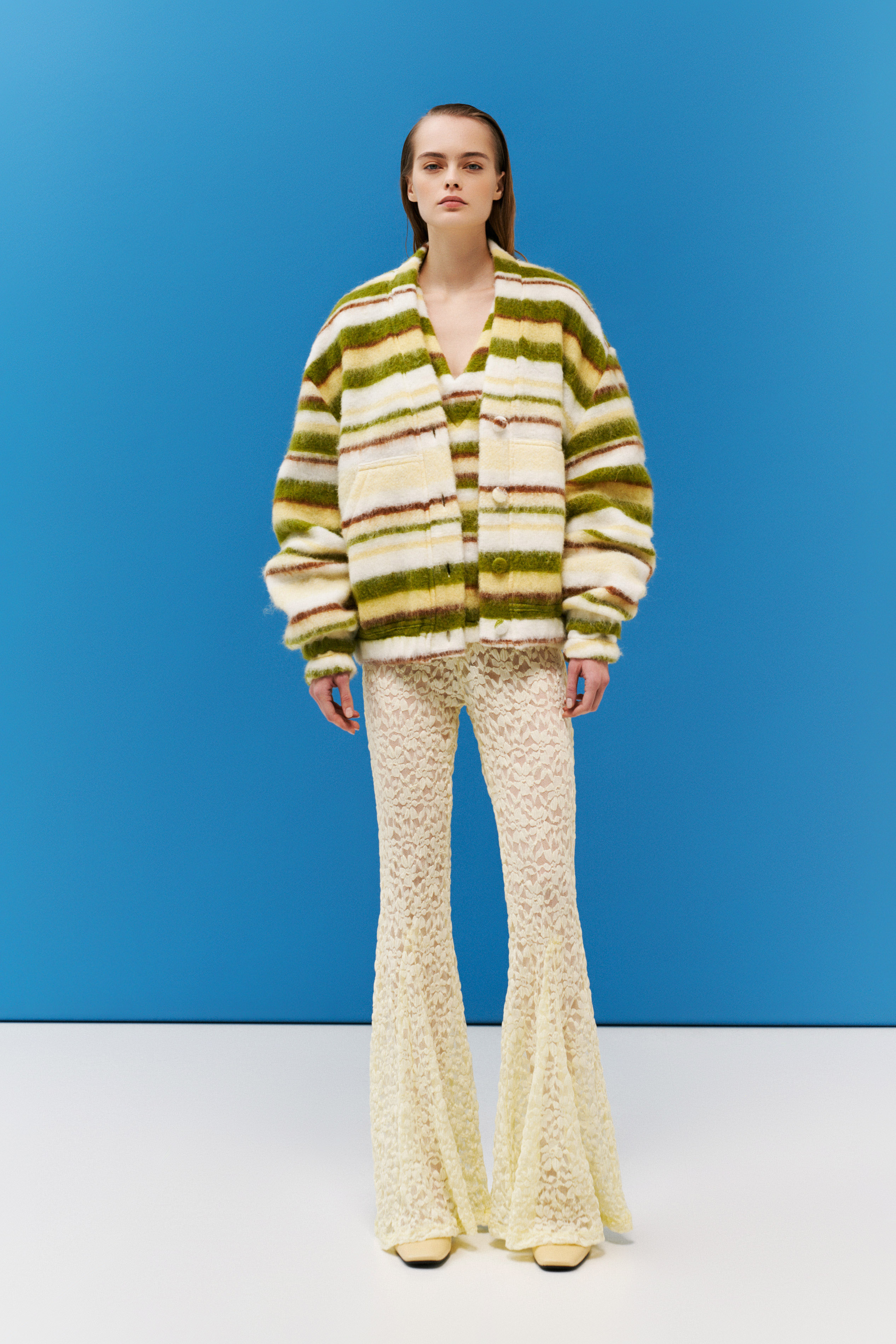 Flared trousers. Made of lace.