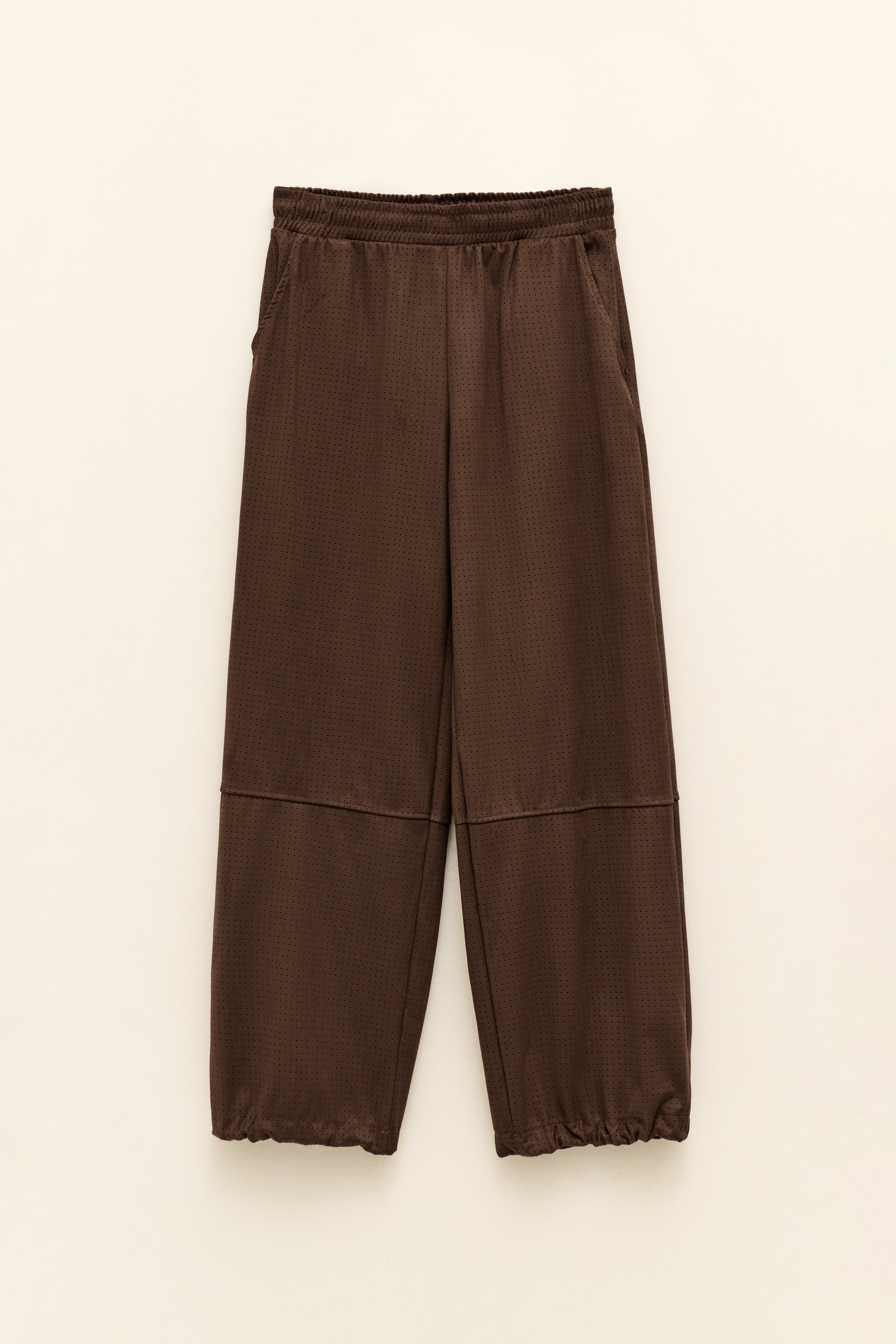 Gathered inserts on the legs. Elasticated leg cuffs.
