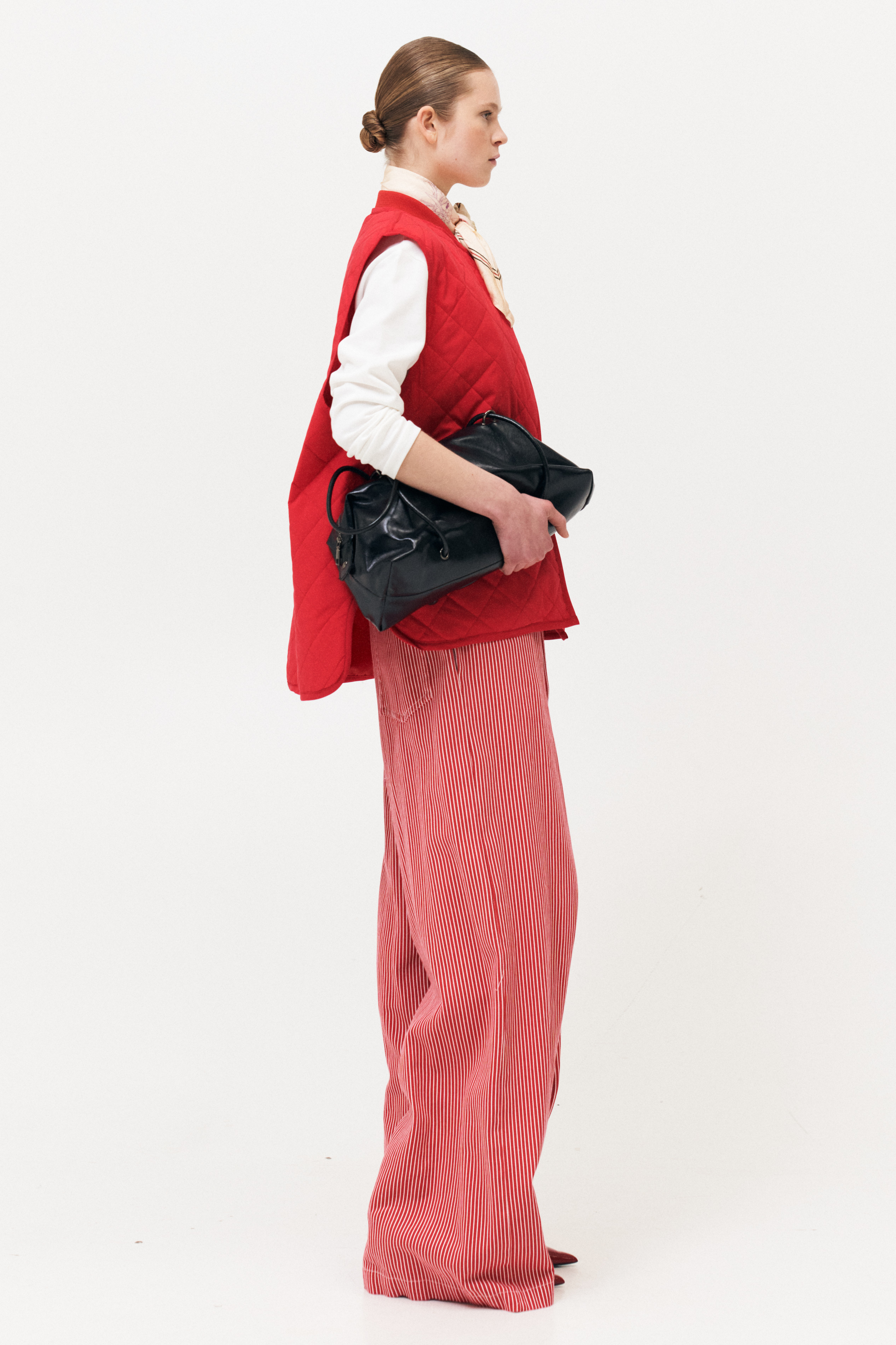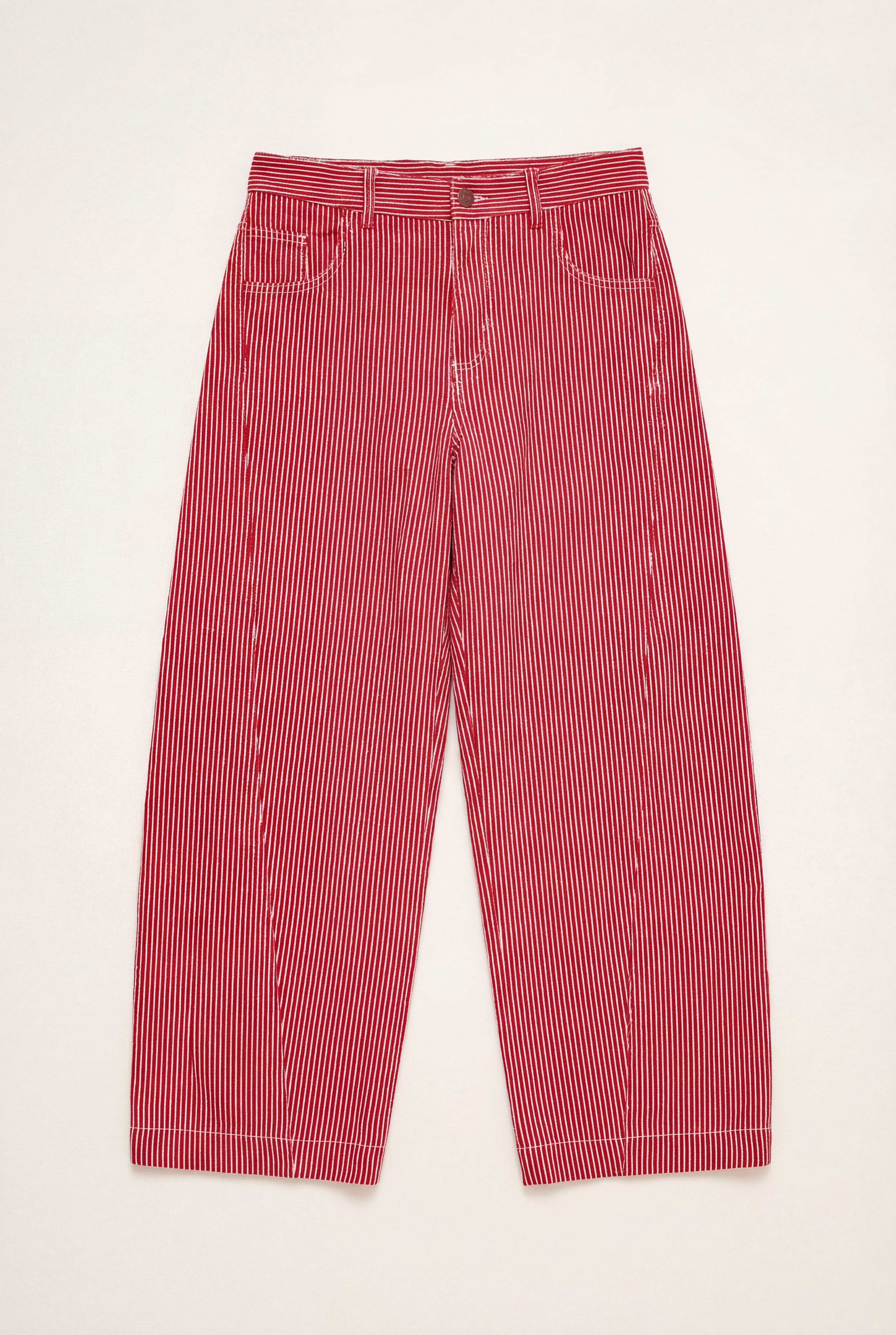 Trousers with vertical striped pattern. Elasticated waist with adjustable drawstring. Inset side pockets. Wide leg. Elasticated bottom for a gathered effect. Regular fit, available in size S/M, M/L.