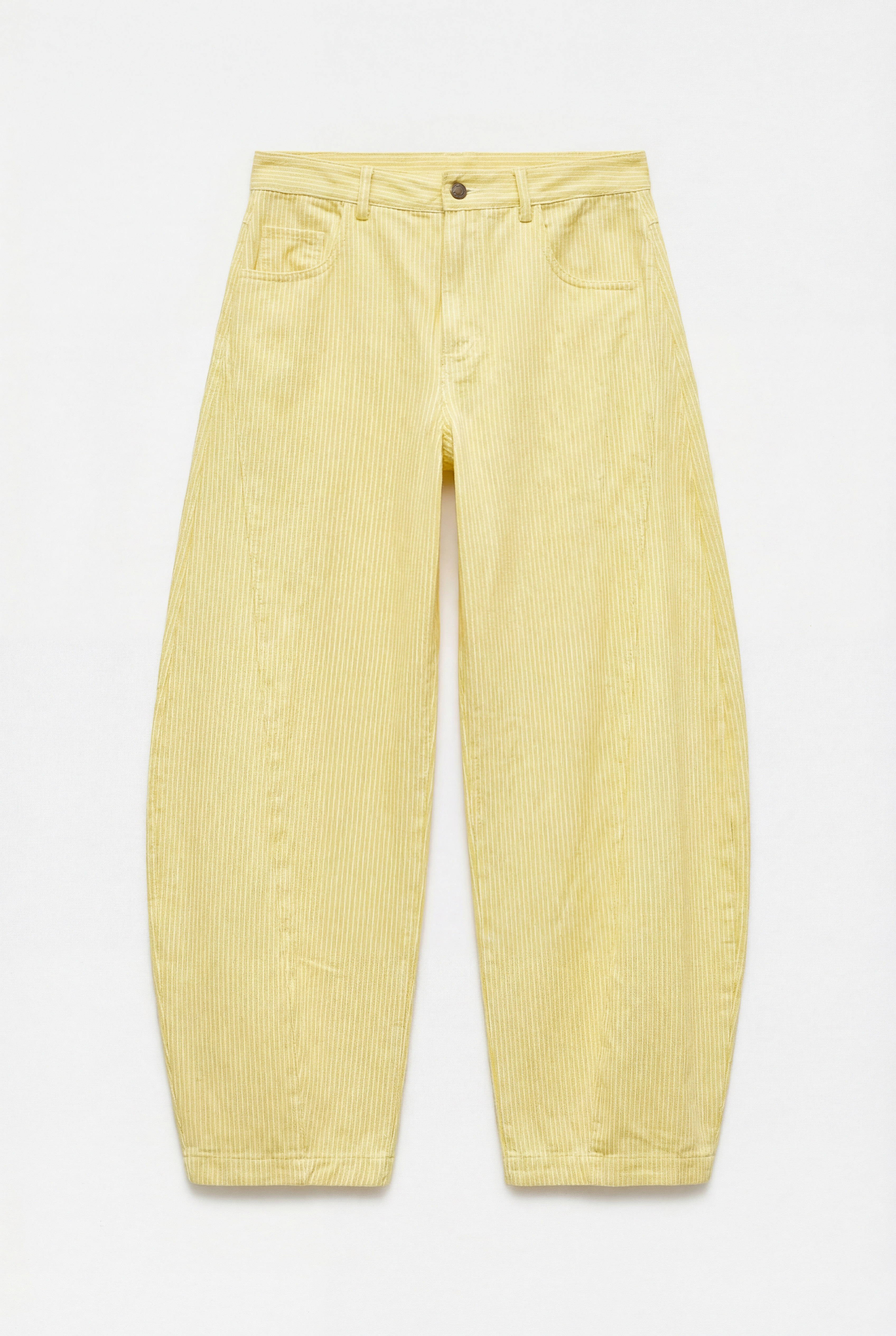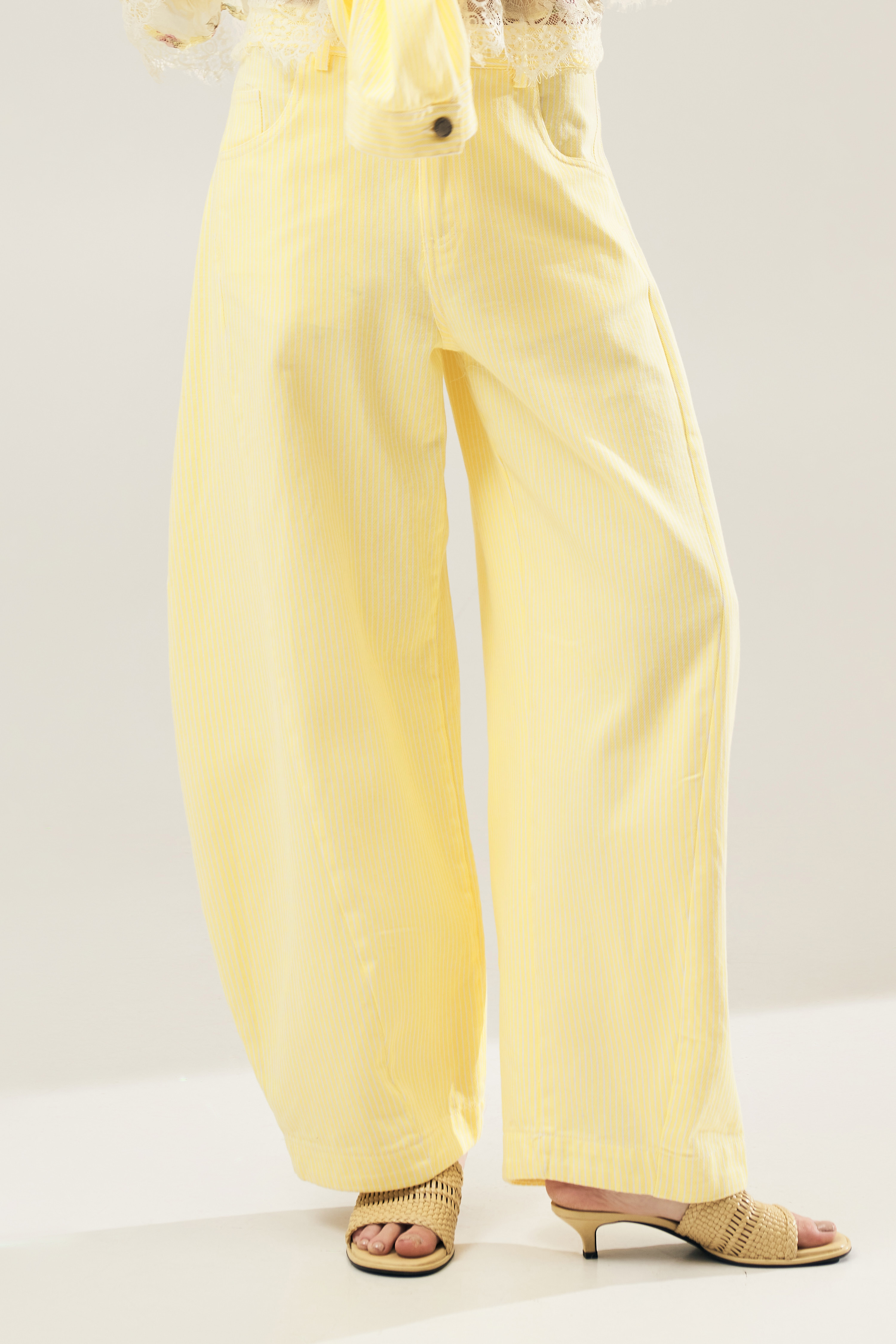 Trousers with vertical striped pattern. Elasticated waist with adjustable drawstring. Inset side pockets. Wide leg. Elasticated bottom for a gathered effect. Regular fit, available in size S/M, M/L.