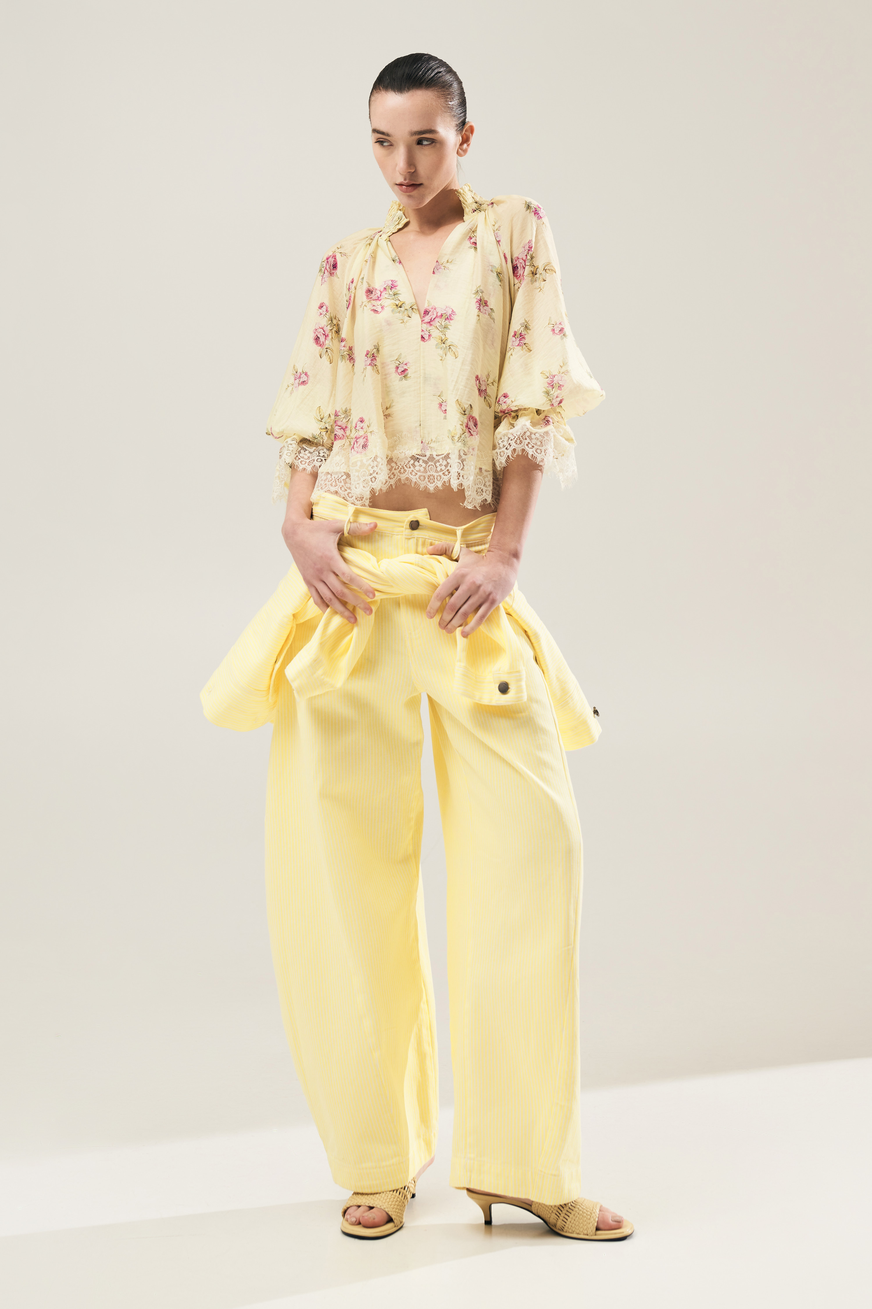 Sangallo trousers with floral motif. High waist with belt loops. Functional side pockets. Welt back pockets. Front closure with zip, hook and button. Regular fit, available in size S, M, L.