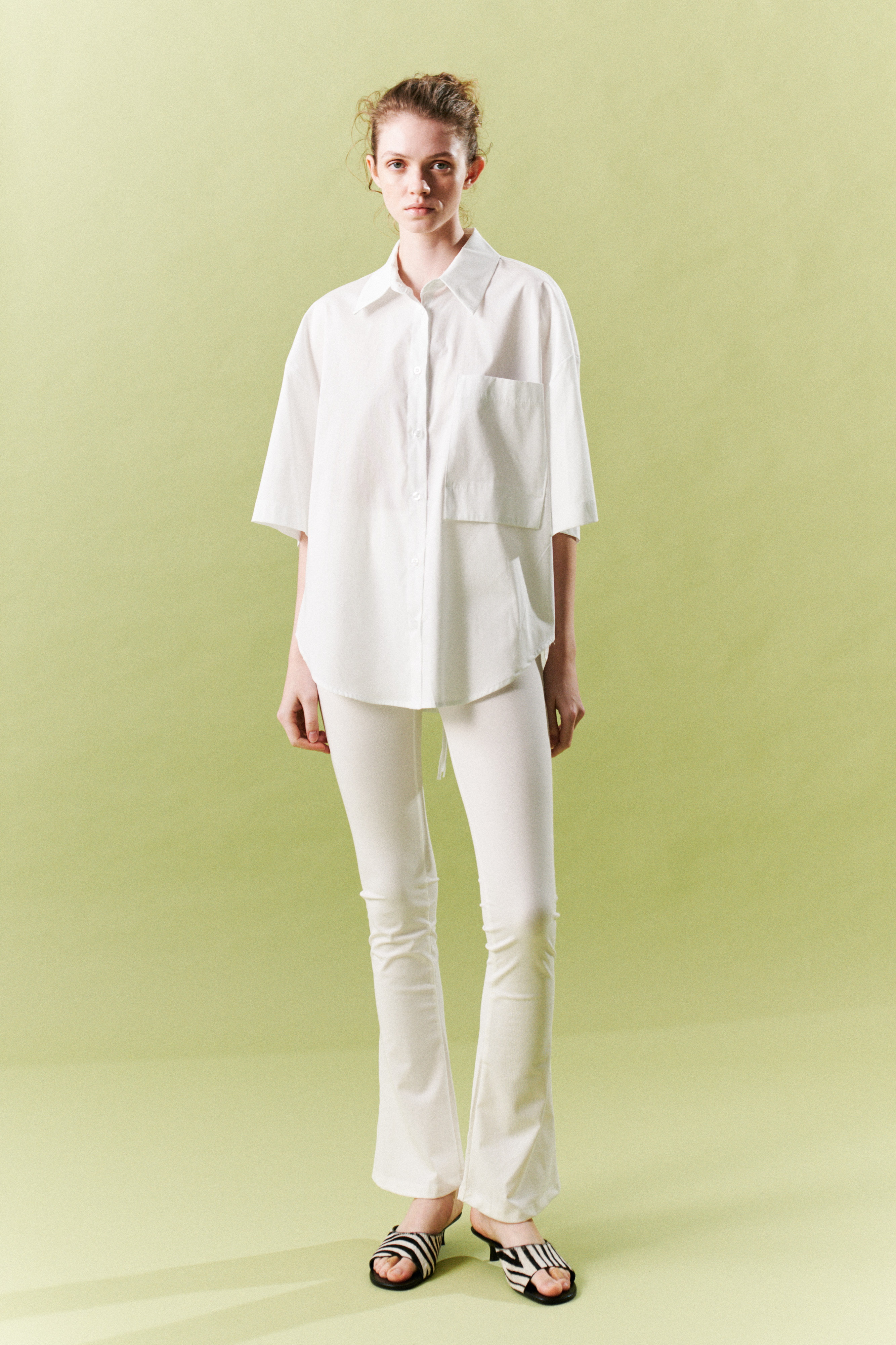 High-waisted trousers with cuffs at the waist. Flared legs.