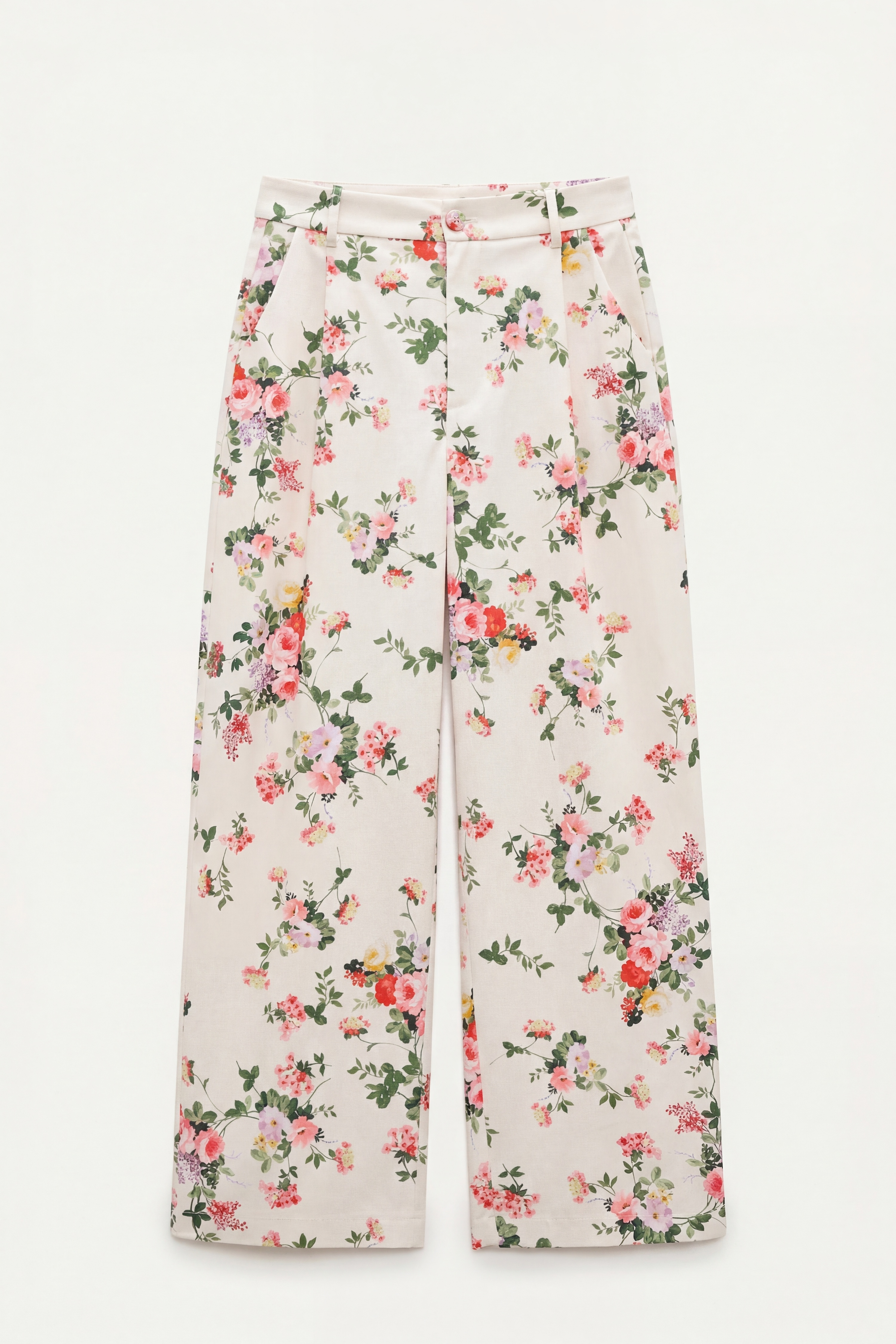 Cropped trousers with floral print. Regular waist with belt loops. Inset side pockets. Welt pocket on the back. It features front pleats. Wide leg. Front closure with zip and button. Regular fit, available in size S, M, L.