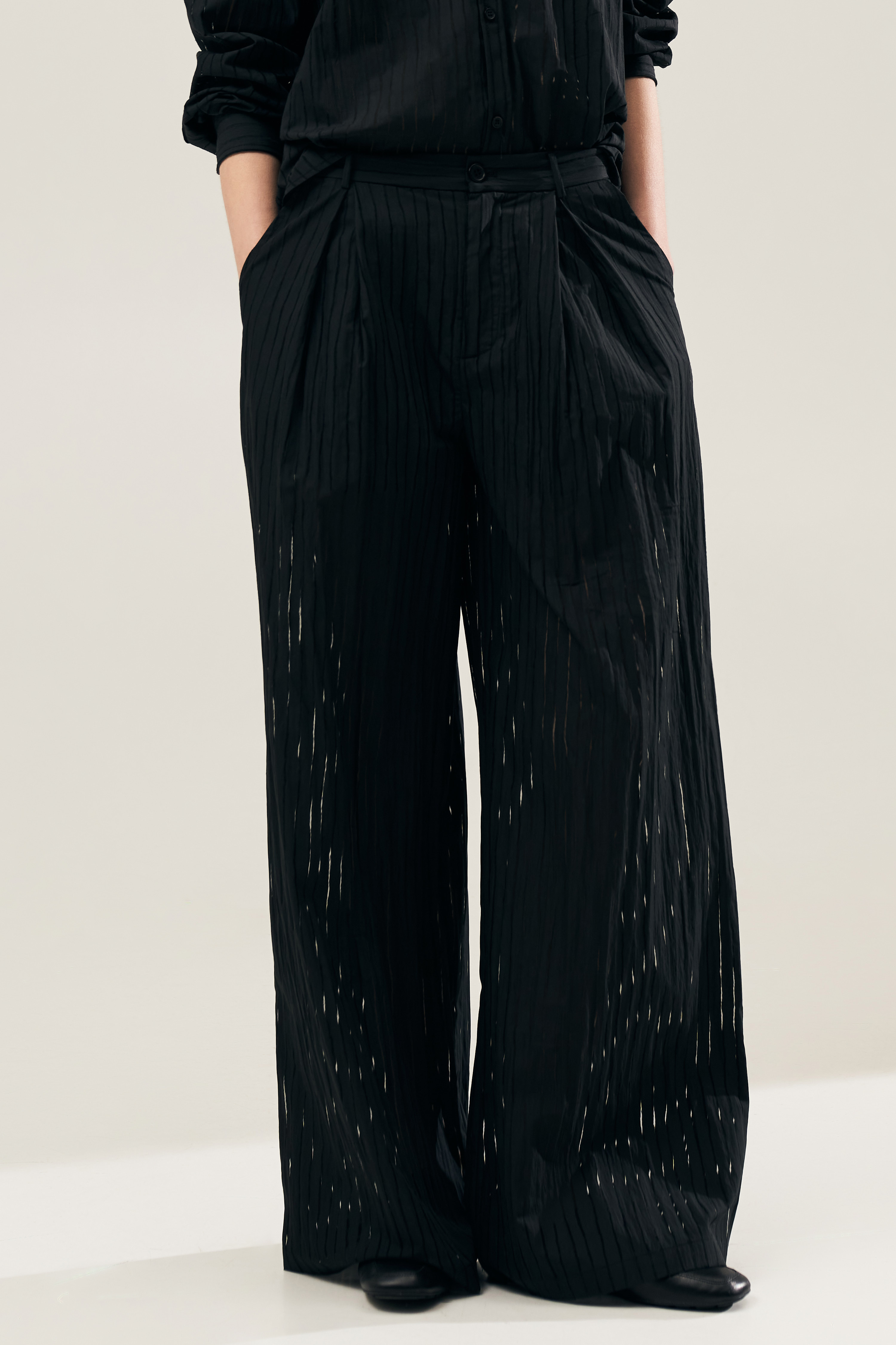 Trousers with vertical striped pattern.