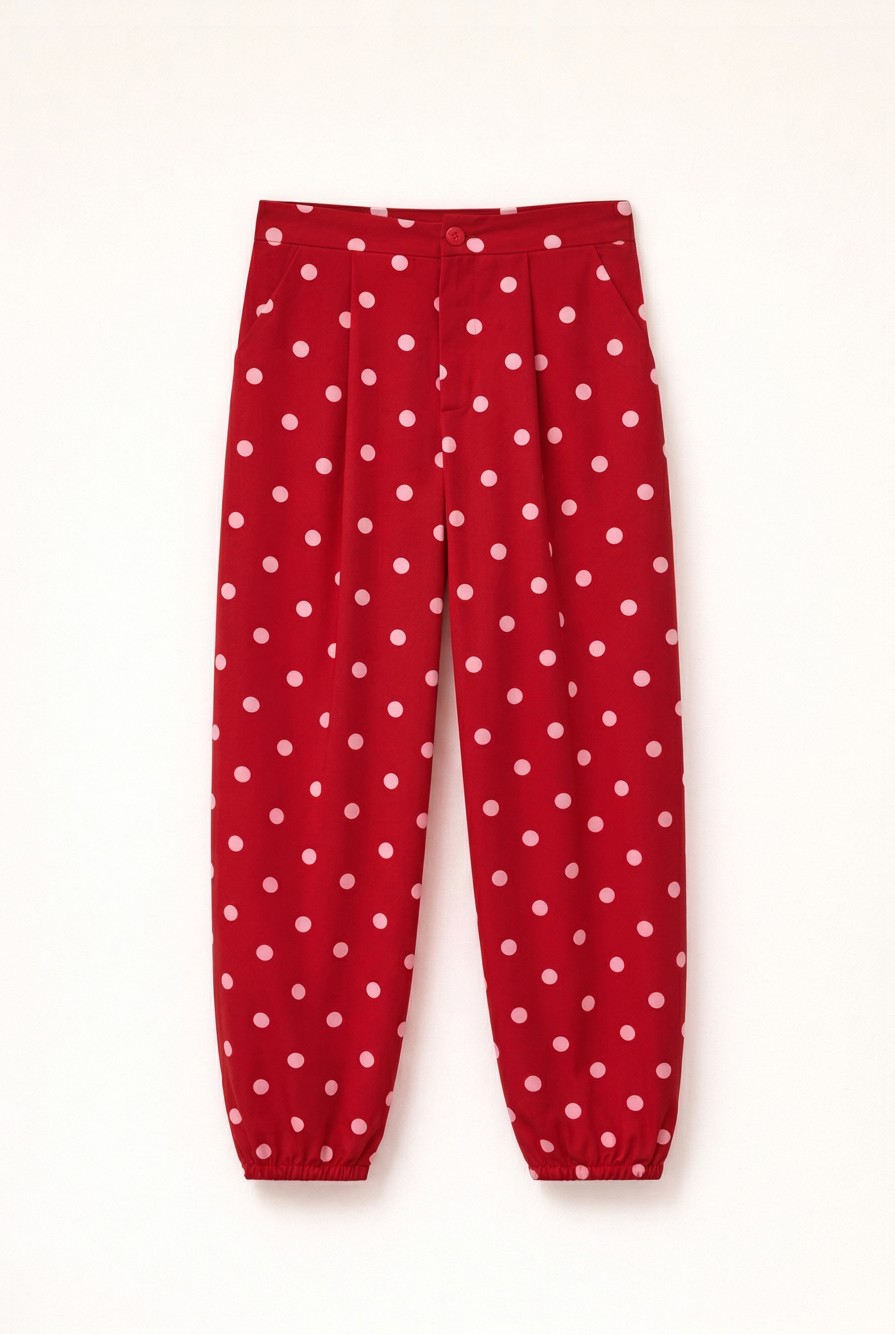 Cotton blend trousers with polka dot print. Elasticated waist at the back. Front darts. Inset side pockets. Wide balloon silhouette. Leg bottom with gathered elastic. Front closure with zip and button. Regular fit, available in size S/M, M/L.
