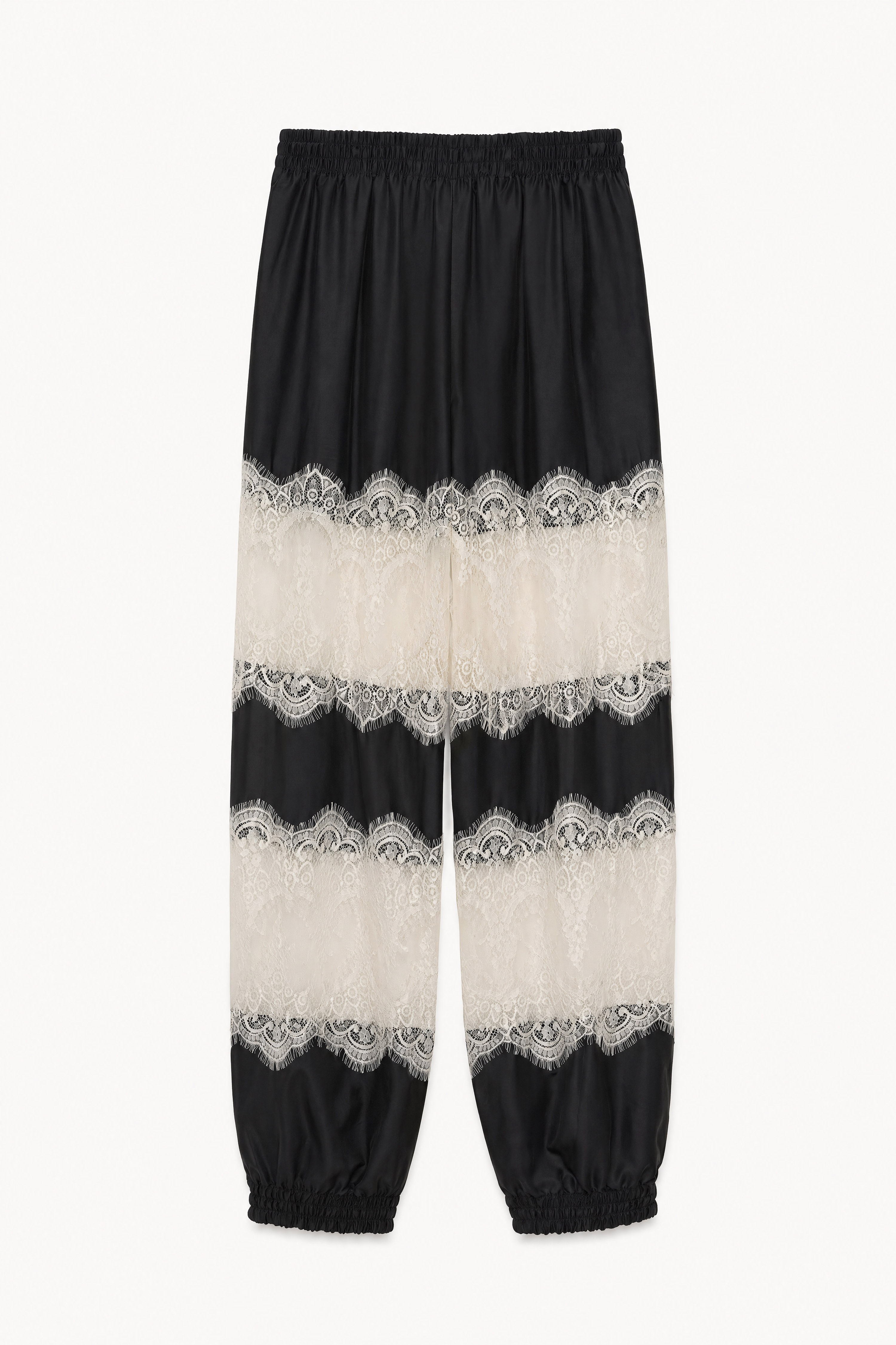 Trousers in flowing, satin fabric. Elasticated waist for maximum comfort. Sheer floral lace side inserts. Gathered leg bottoms. Soft fit. Regular fit, available in size S/M, M/L.