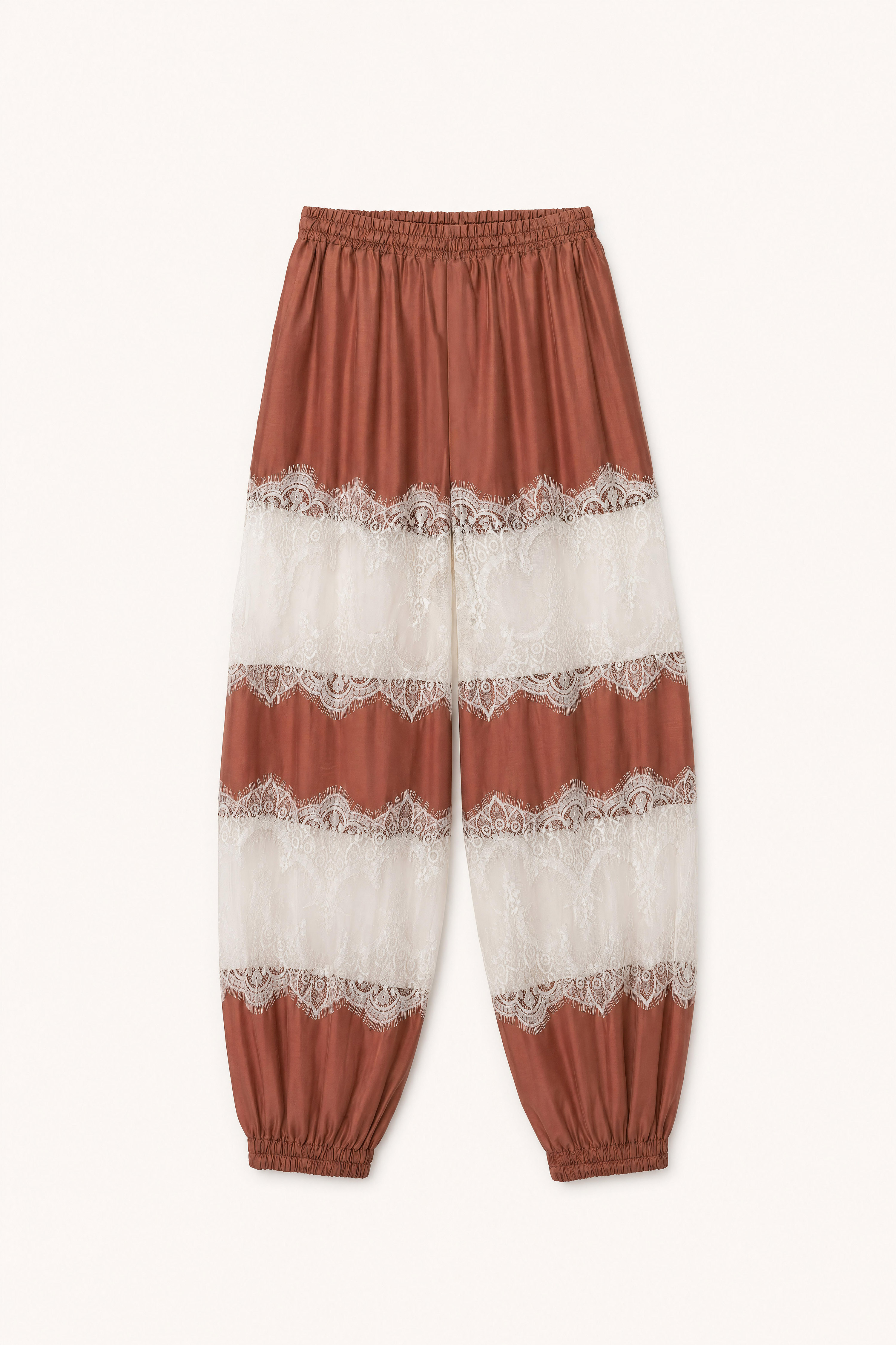 Trousers in satin lyocell blend fabric. Elasticated waist. Inset side pockets. Floral lace inserts with fringed finishes. Leg bottom with elastic and gathering. Regular fit, available in size S/M, M/L.