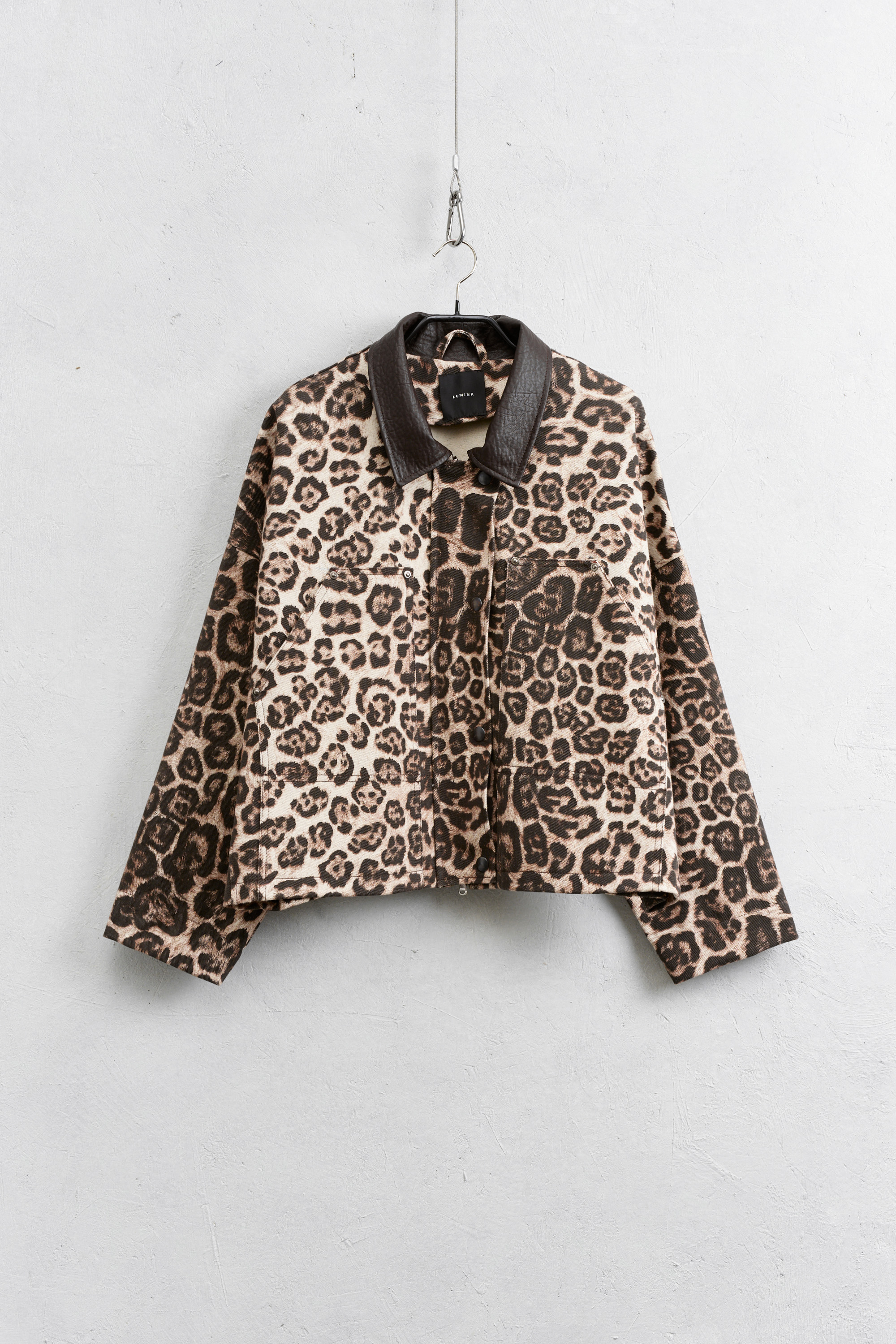 Faux leather lapel collar detail.