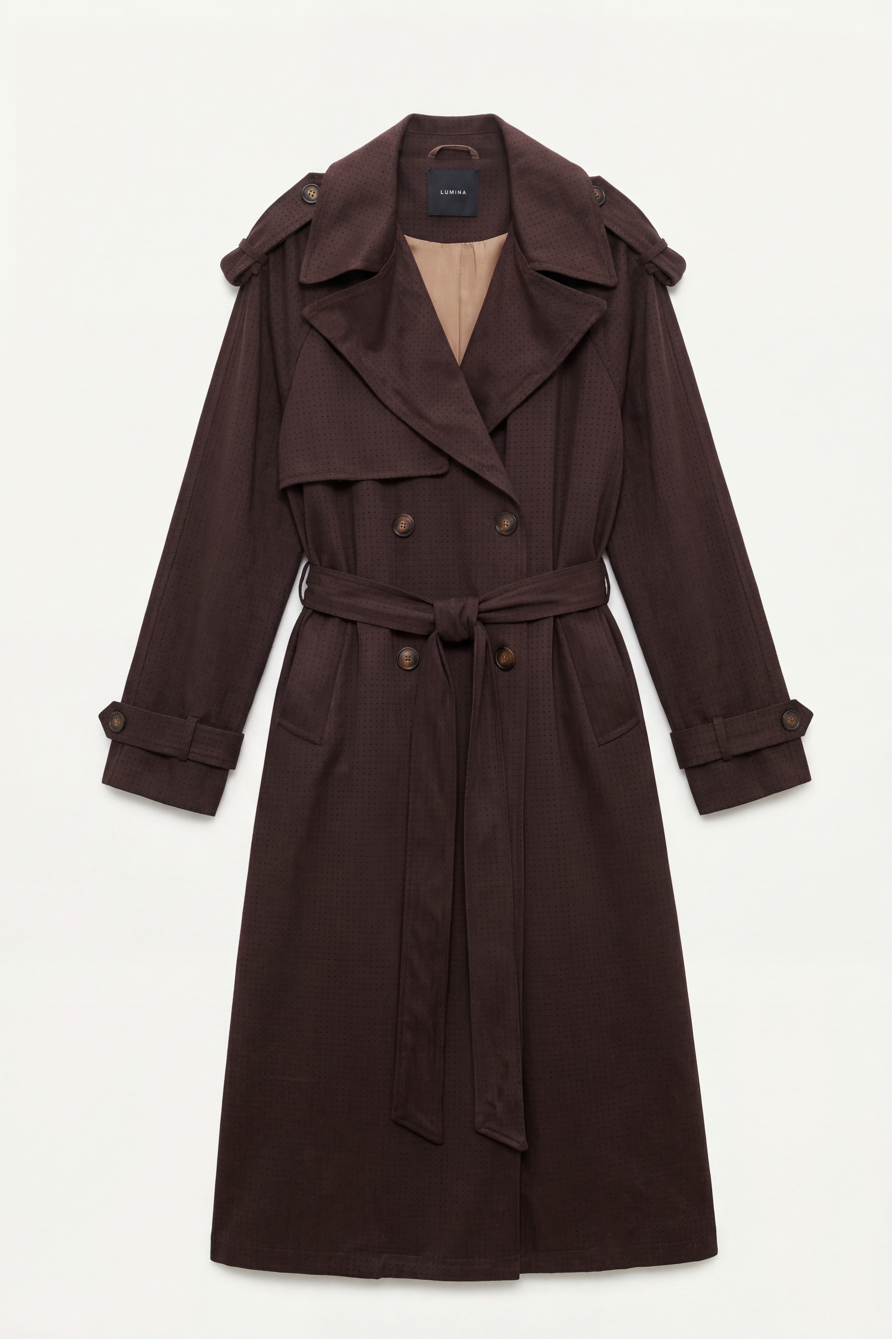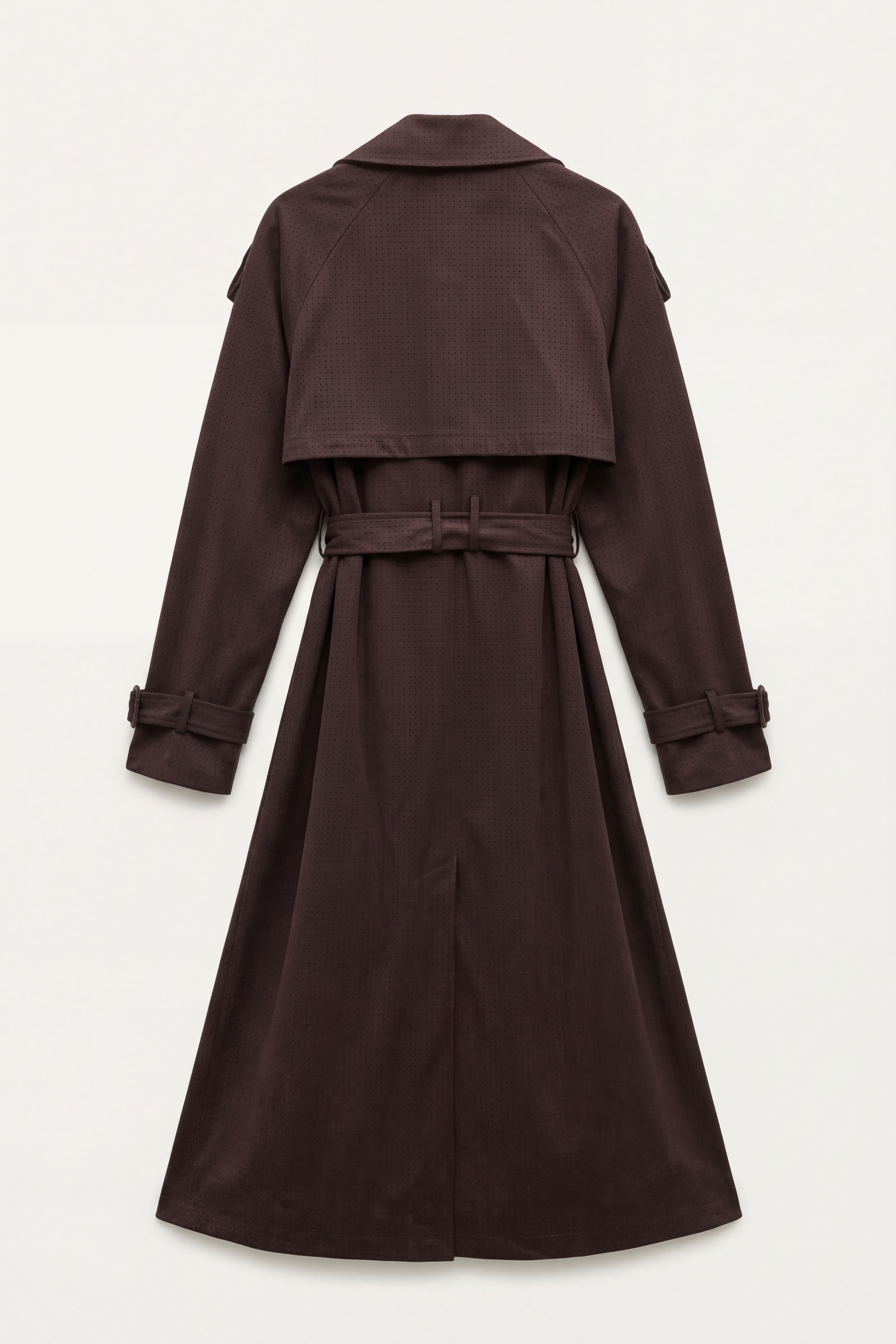 Long trench coat in synthetic suede.