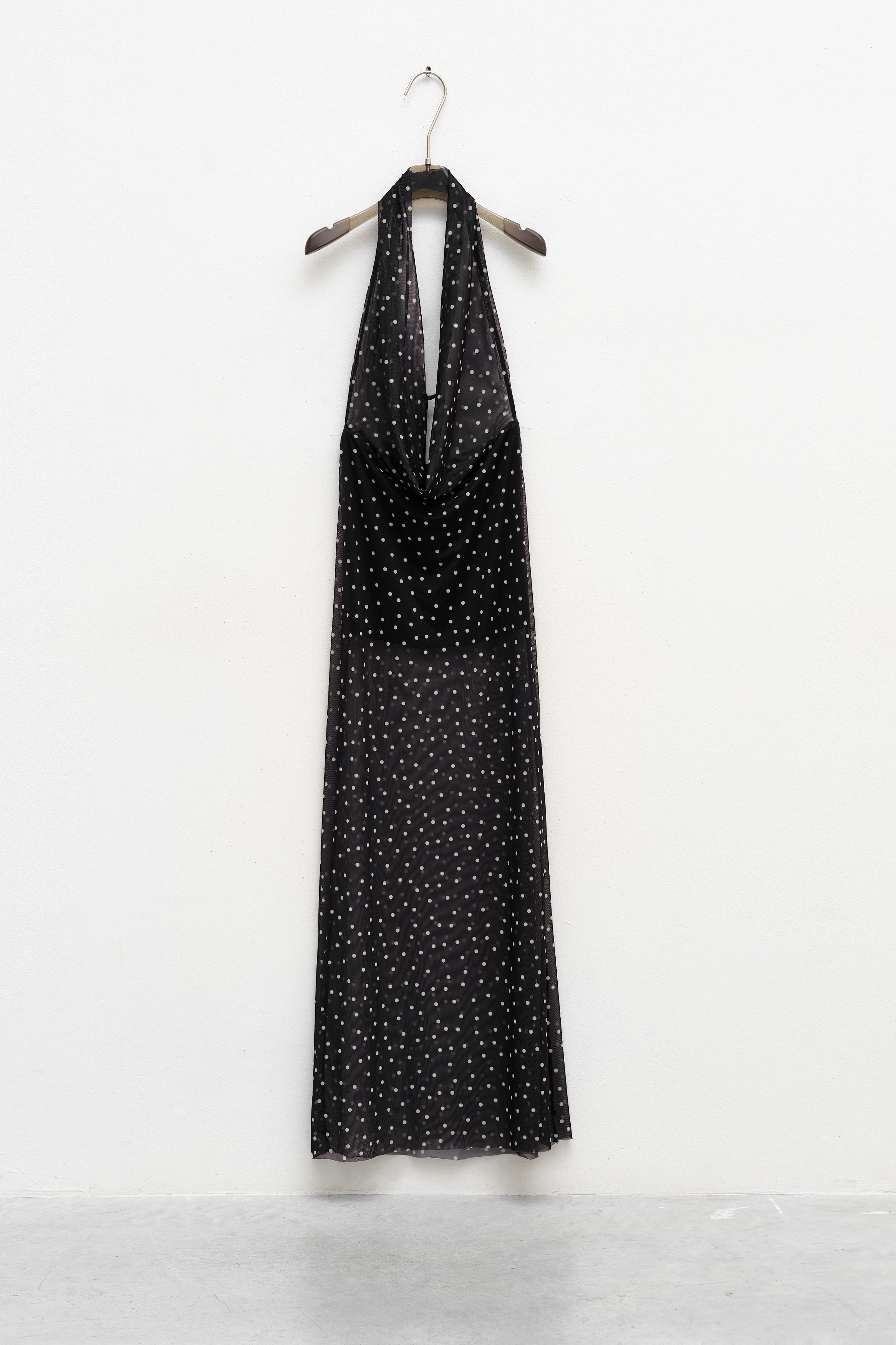 Halter dress in tulle with polka dot pattern and soft neckline.