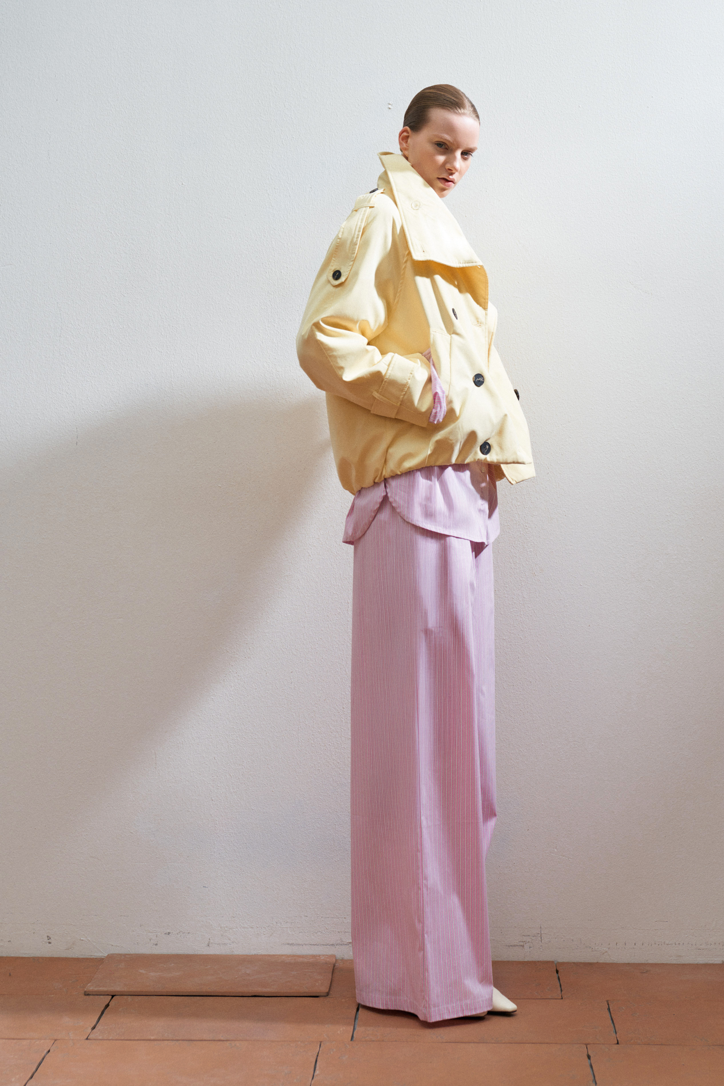 Wide neckline. Long sleeves with high buttoned cuffs.
