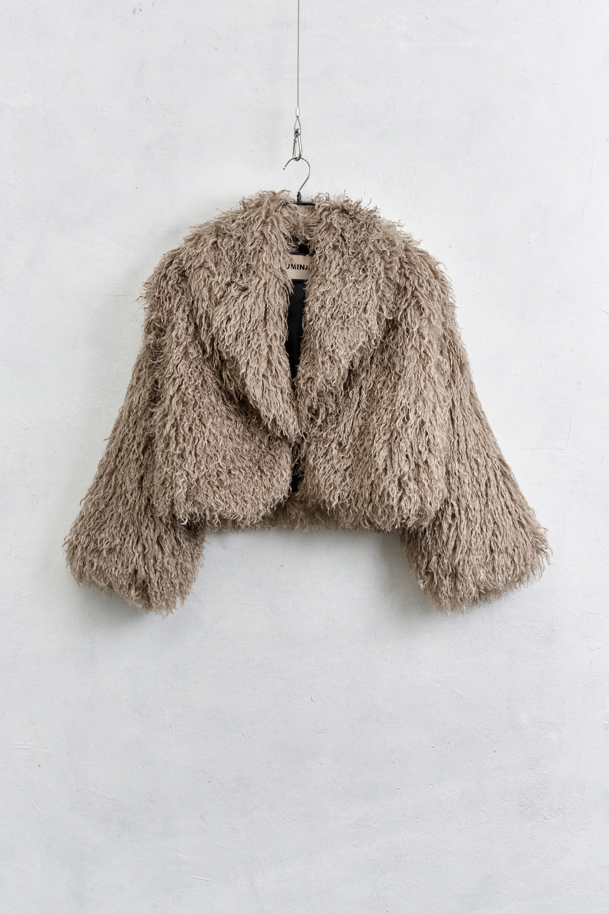 Faux fur with lapel collar.