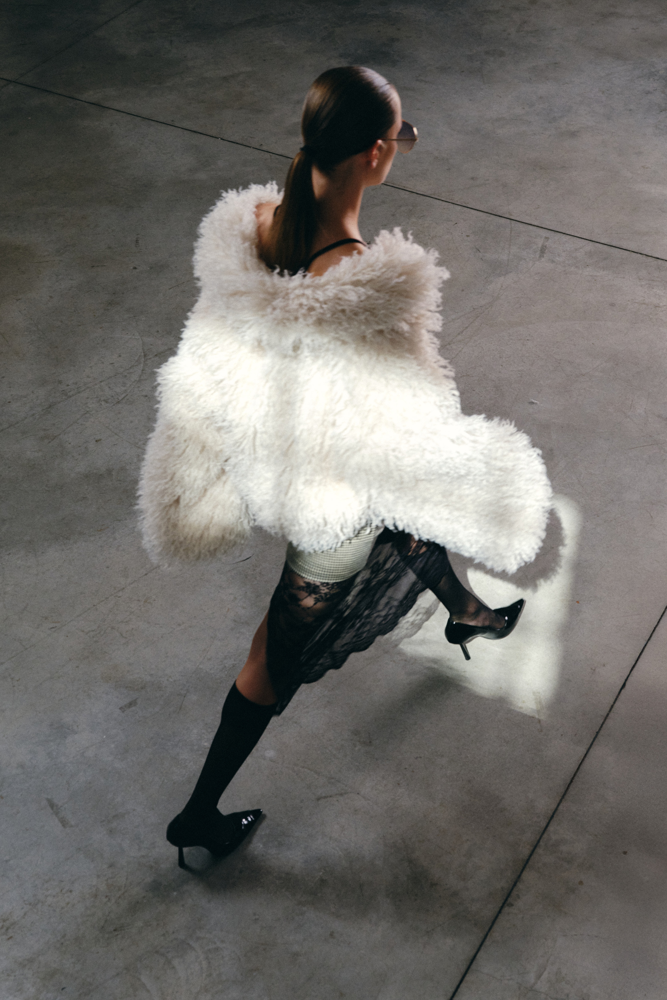 Long coat made of synthetic fur.