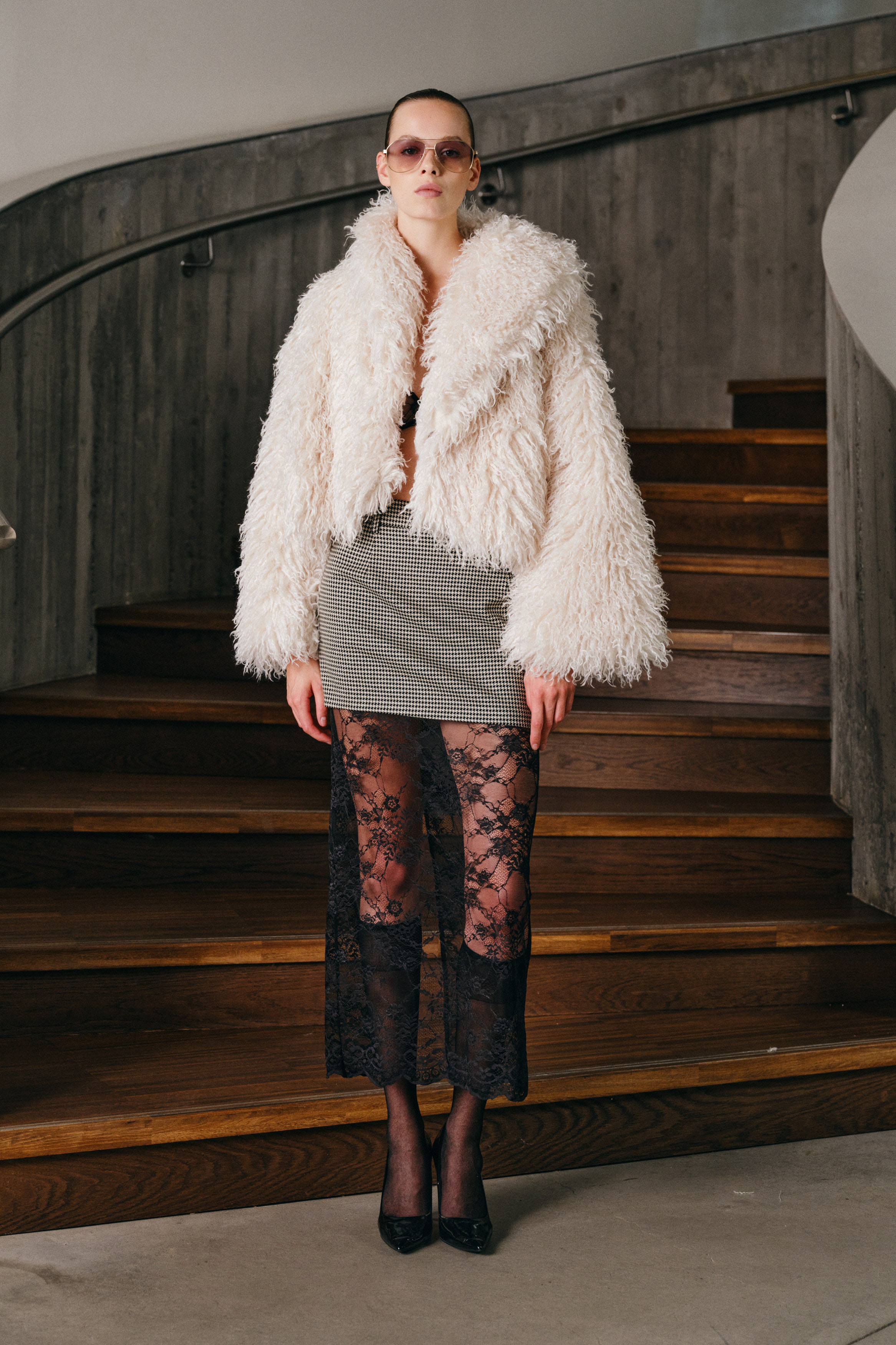 Faux fur with lapel collar.