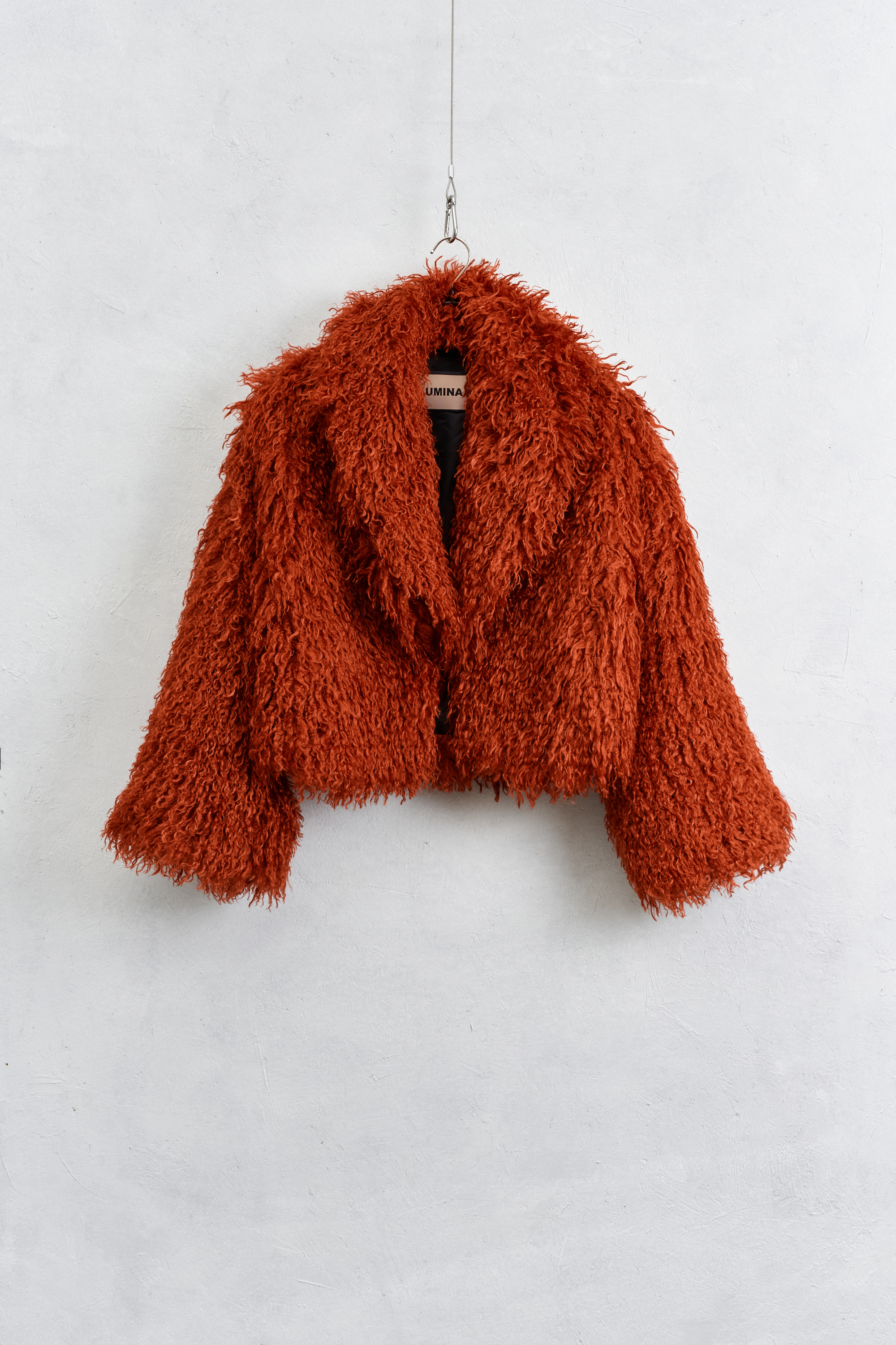 Faux fur with lapel collar.