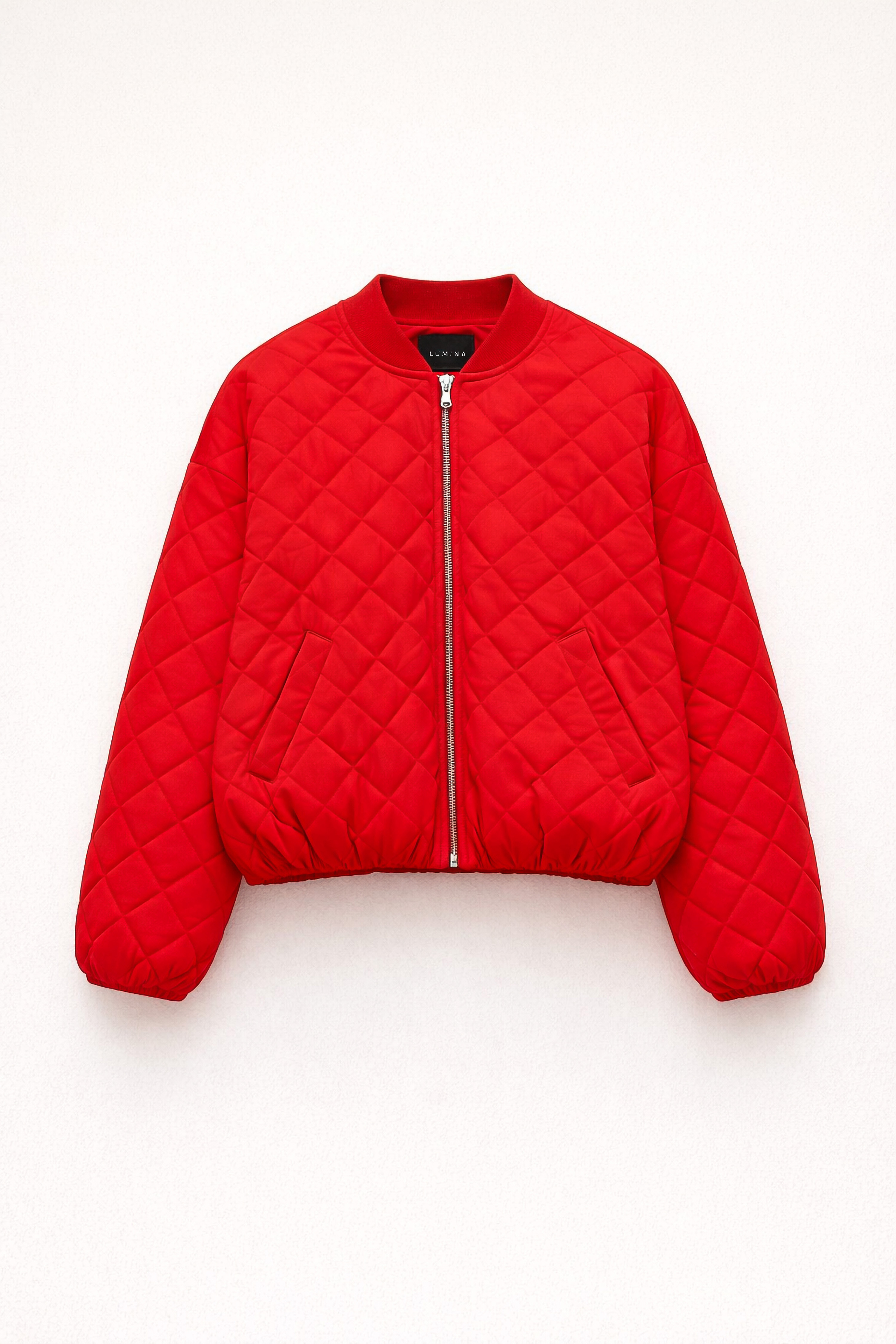 Long-sleeved quilted jacket. Front zip closure. Ribbed collar. Elasticated bottom and cuffs. Insert side pockets. Inner lining. Regular fit, available in ONE size.