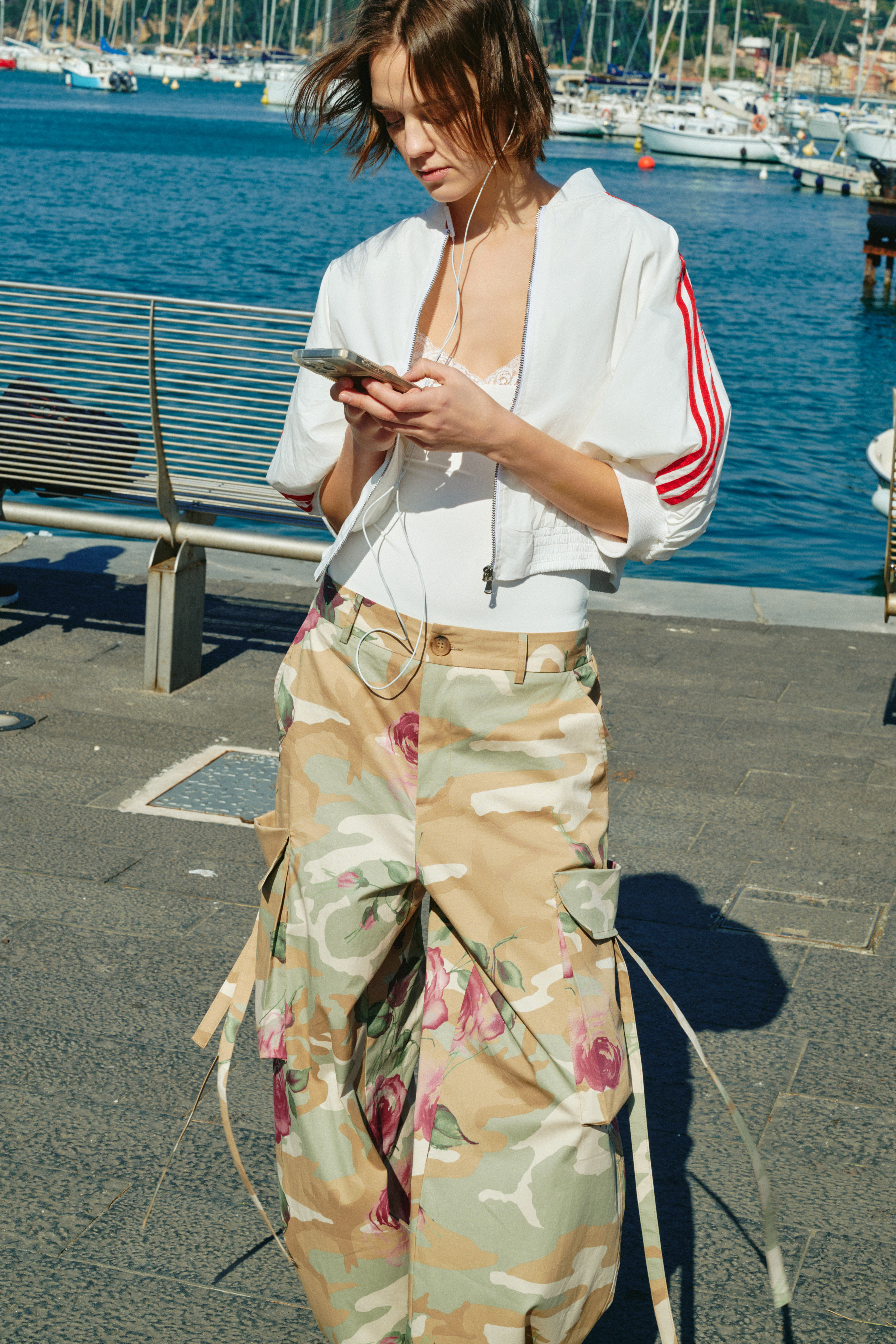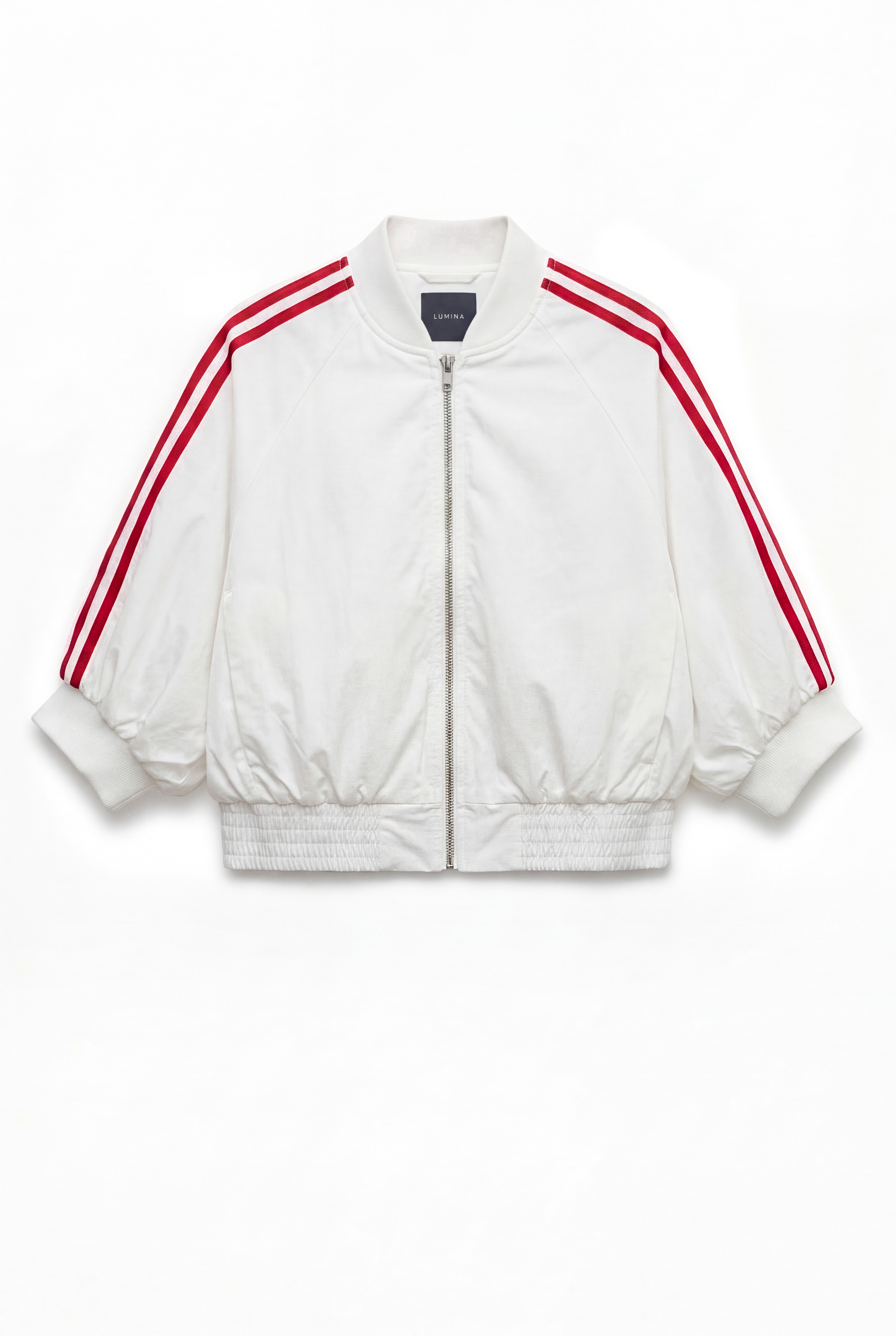 Ribbed collar and cuffs. Three-quarter sleeves with dropped shoulders.