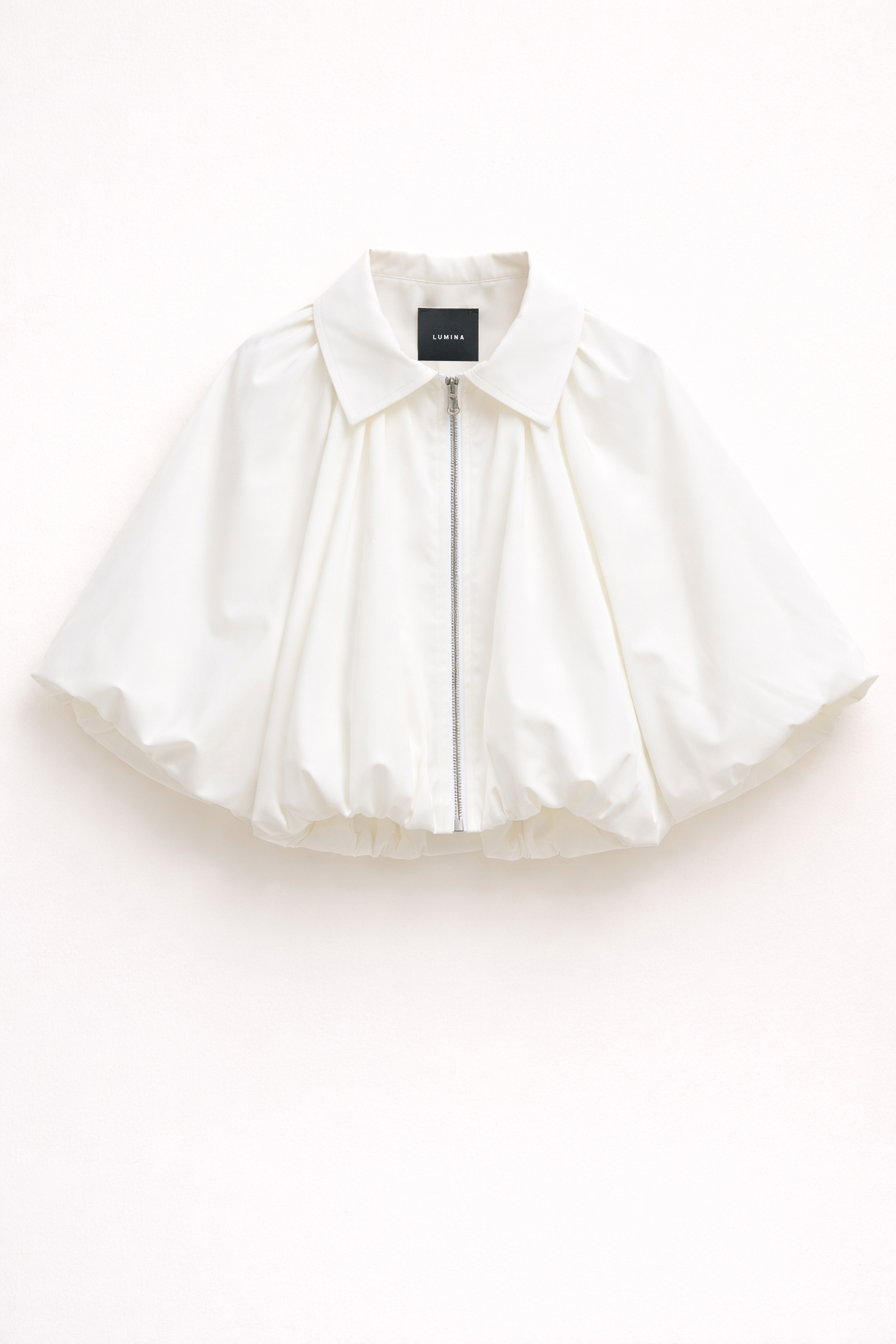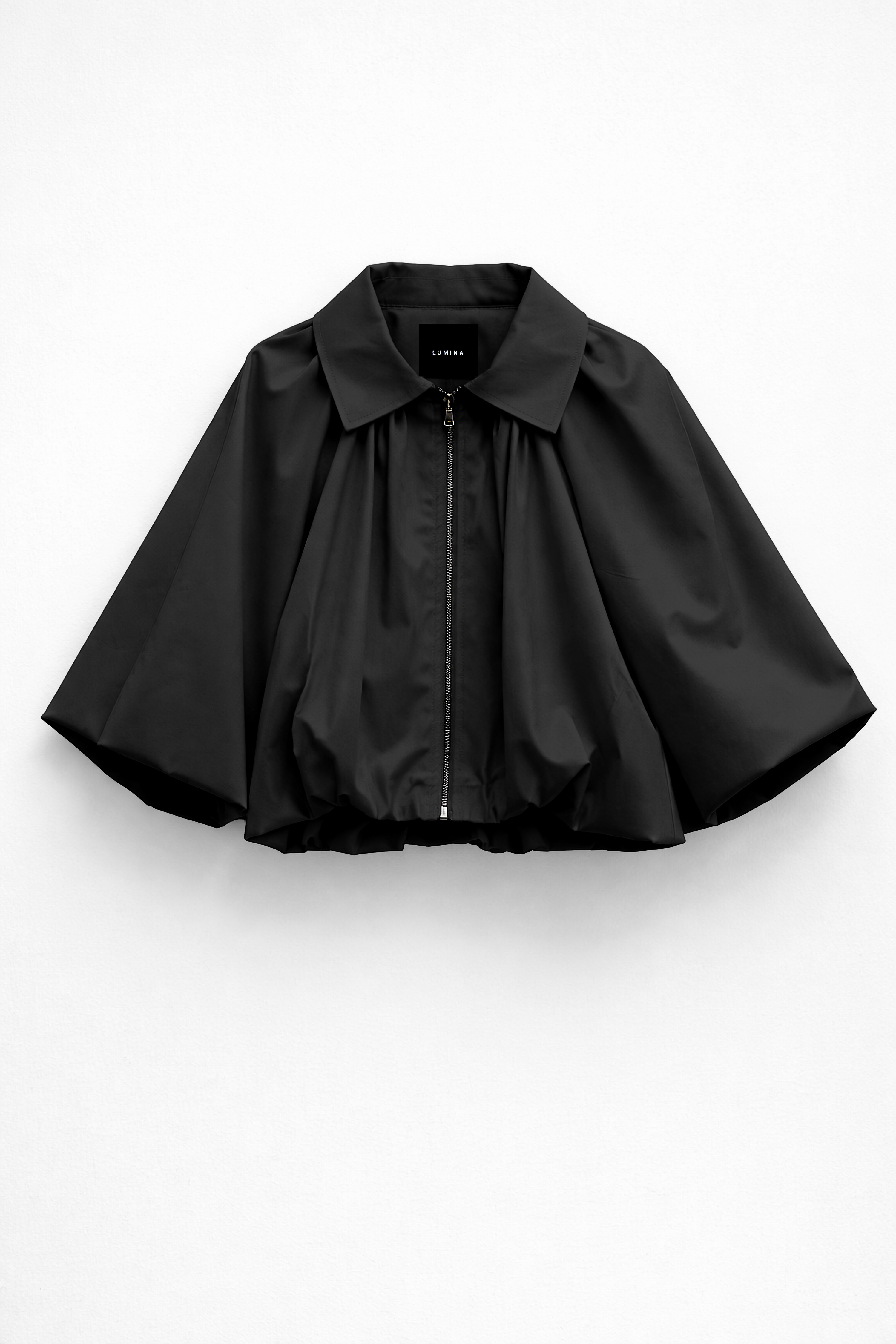 Ribbed collar and cuffs. Three-quarter sleeves with dropped shoulders.