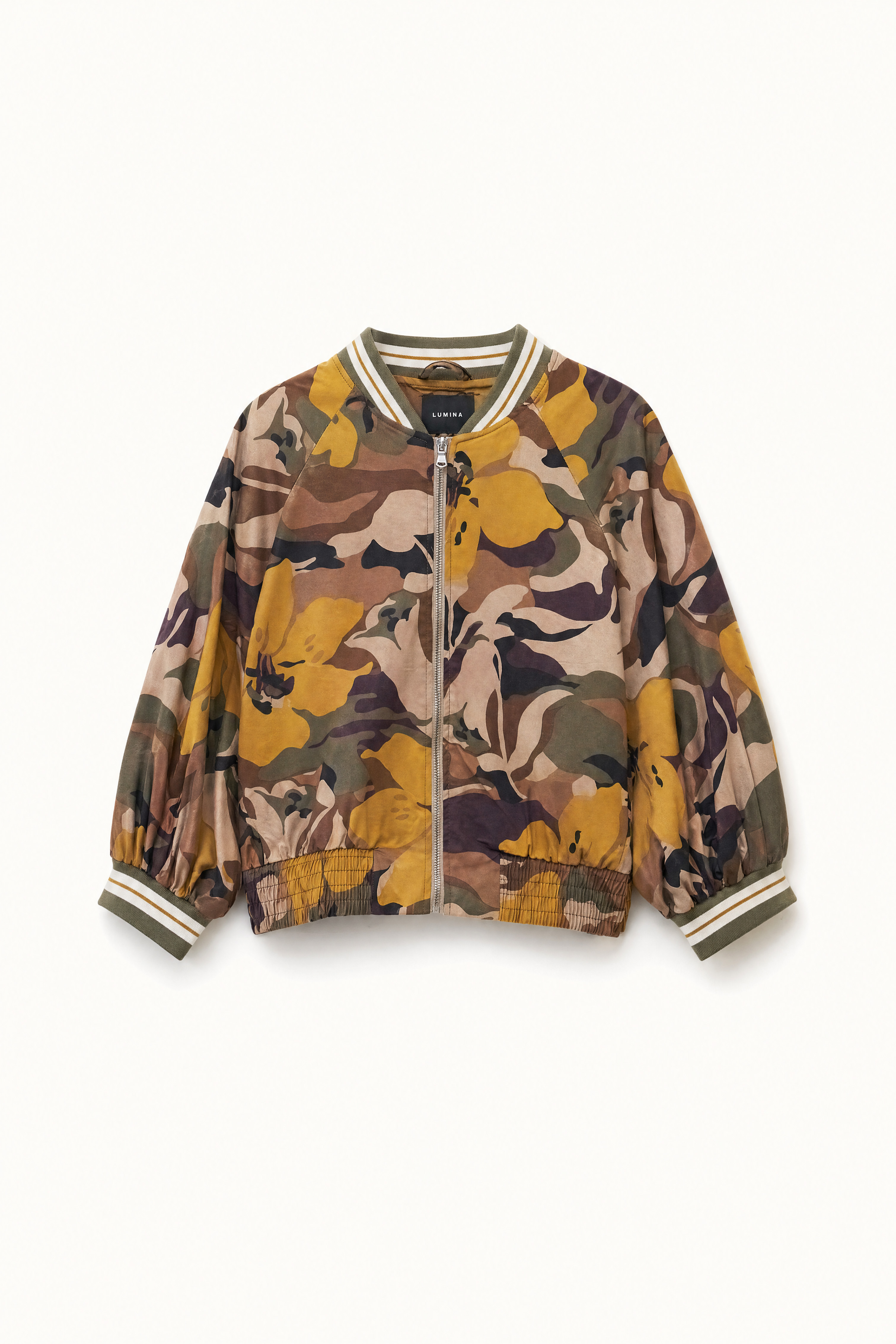 Cropped bomber jacket with camouflage print.