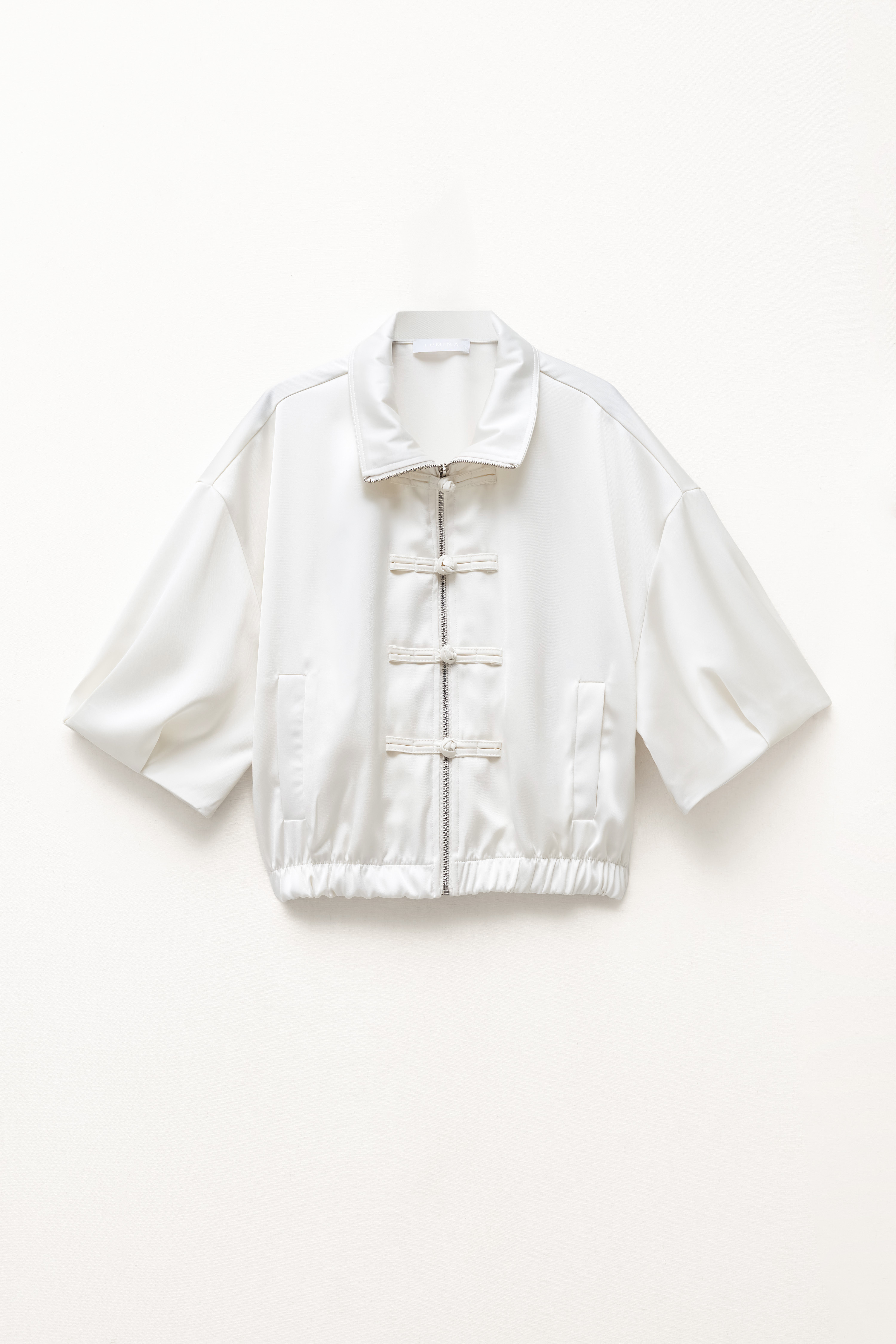 Front zip closure with decorative oriental knots.