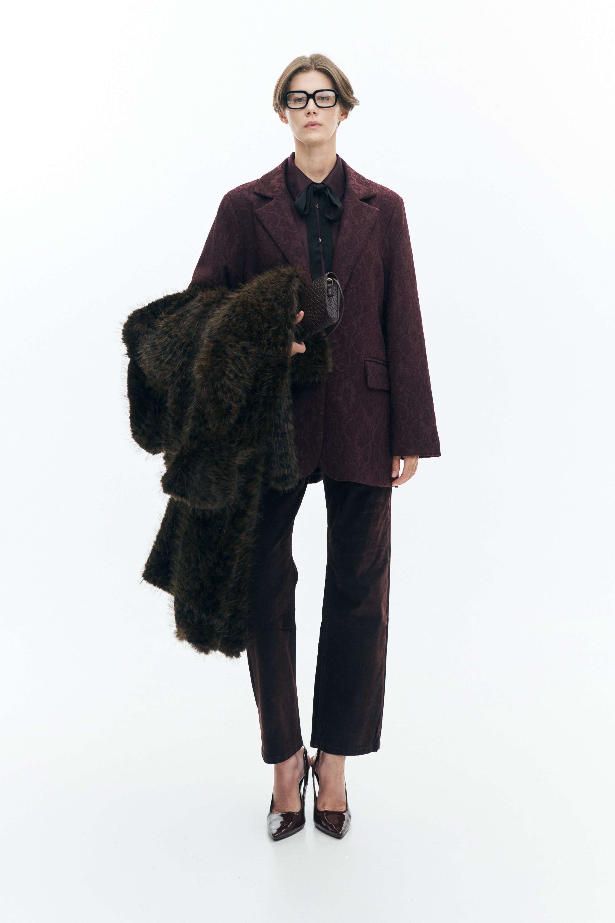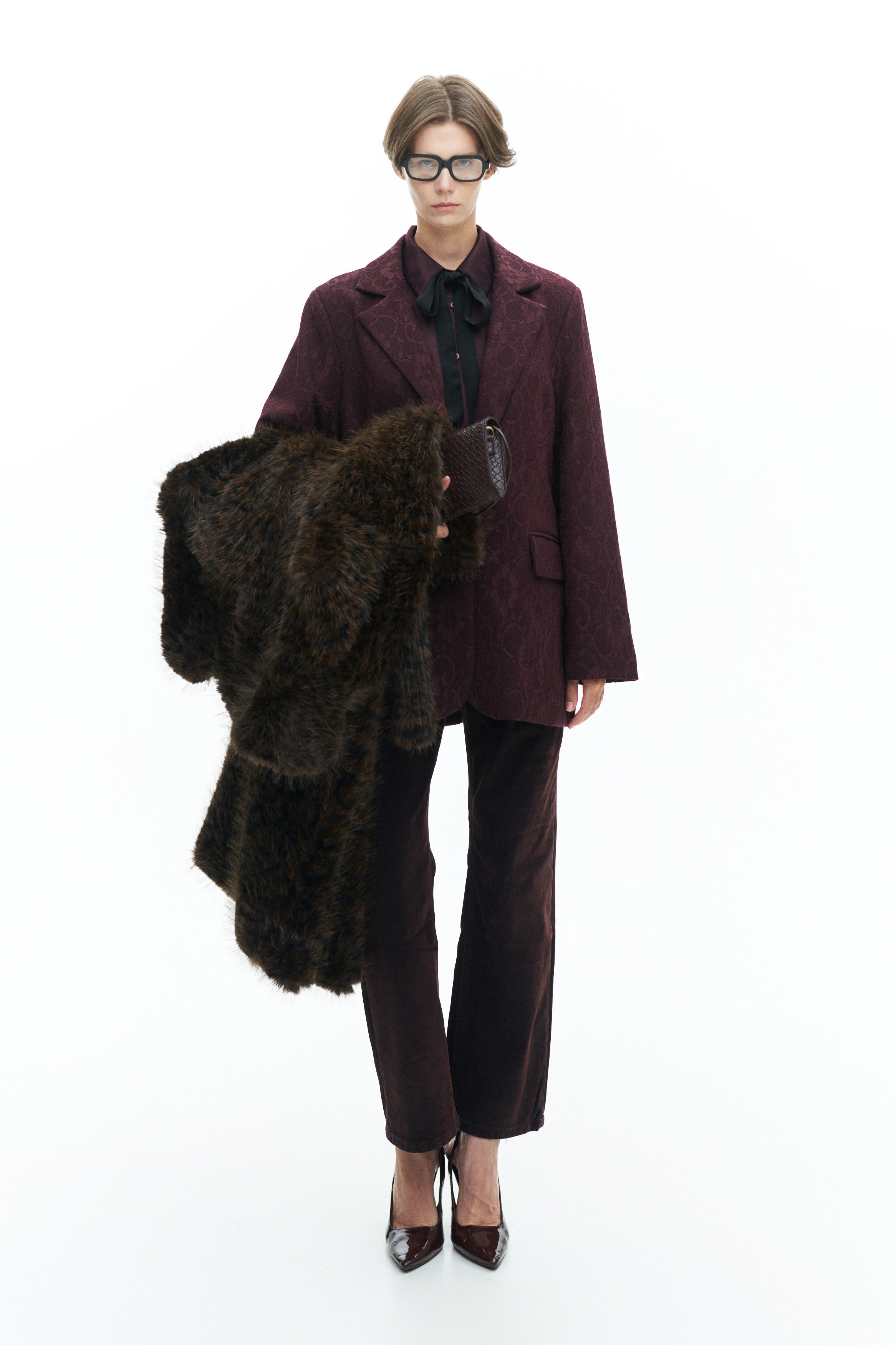 Faux leather lapel collar.