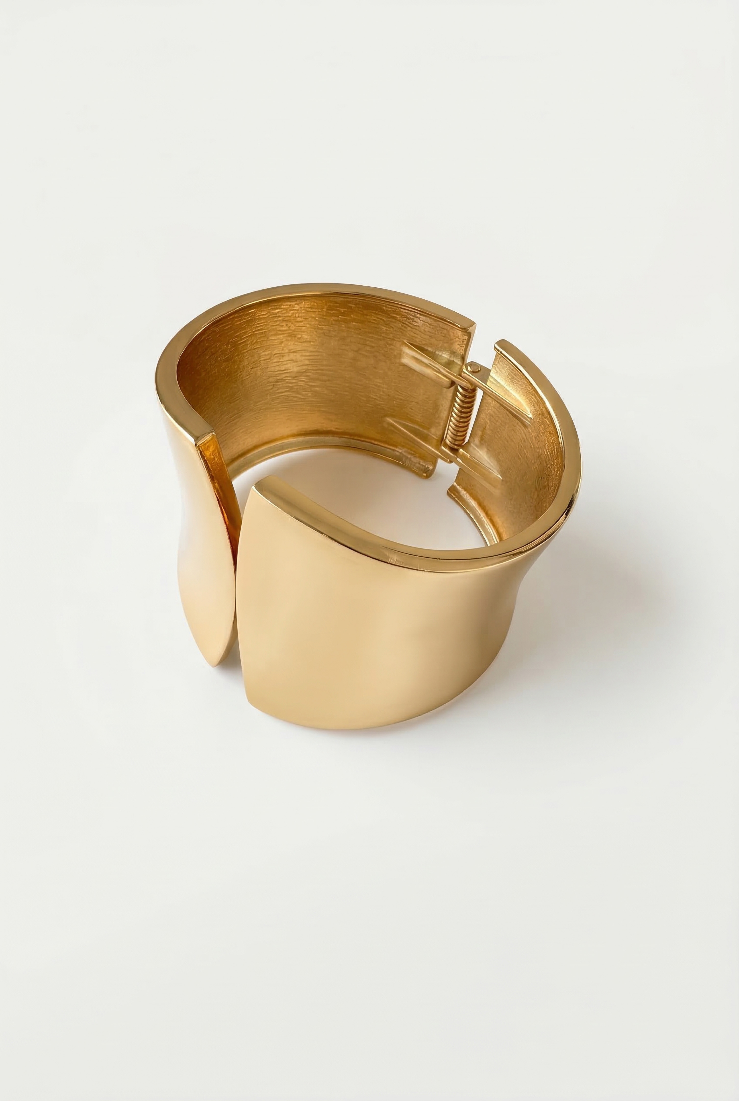 Wide band rigid bracelet with asymmetrical profile and overlapping volumes.