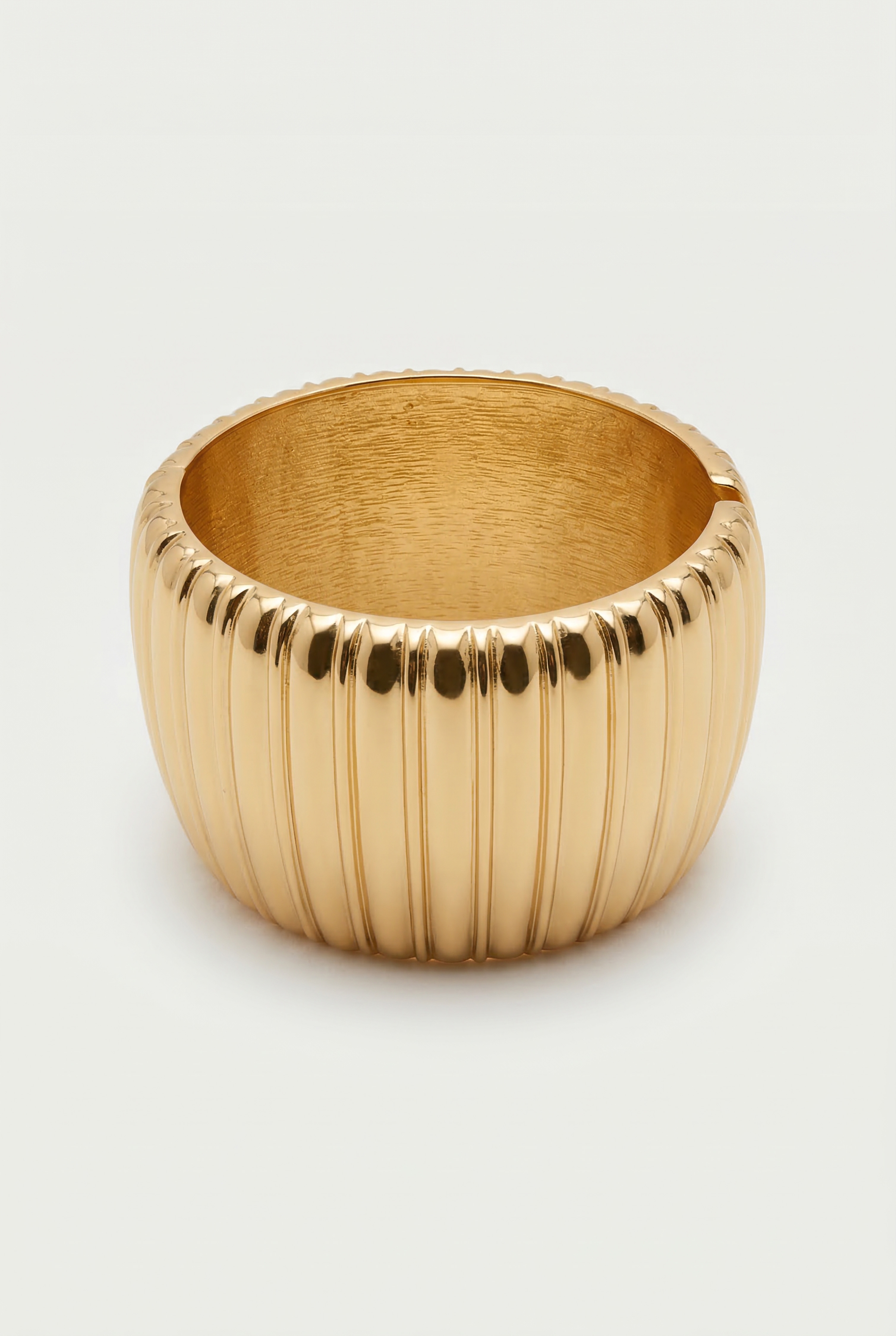 Wide band rigid bracelet with asymmetrical profile and overlapping volumes.