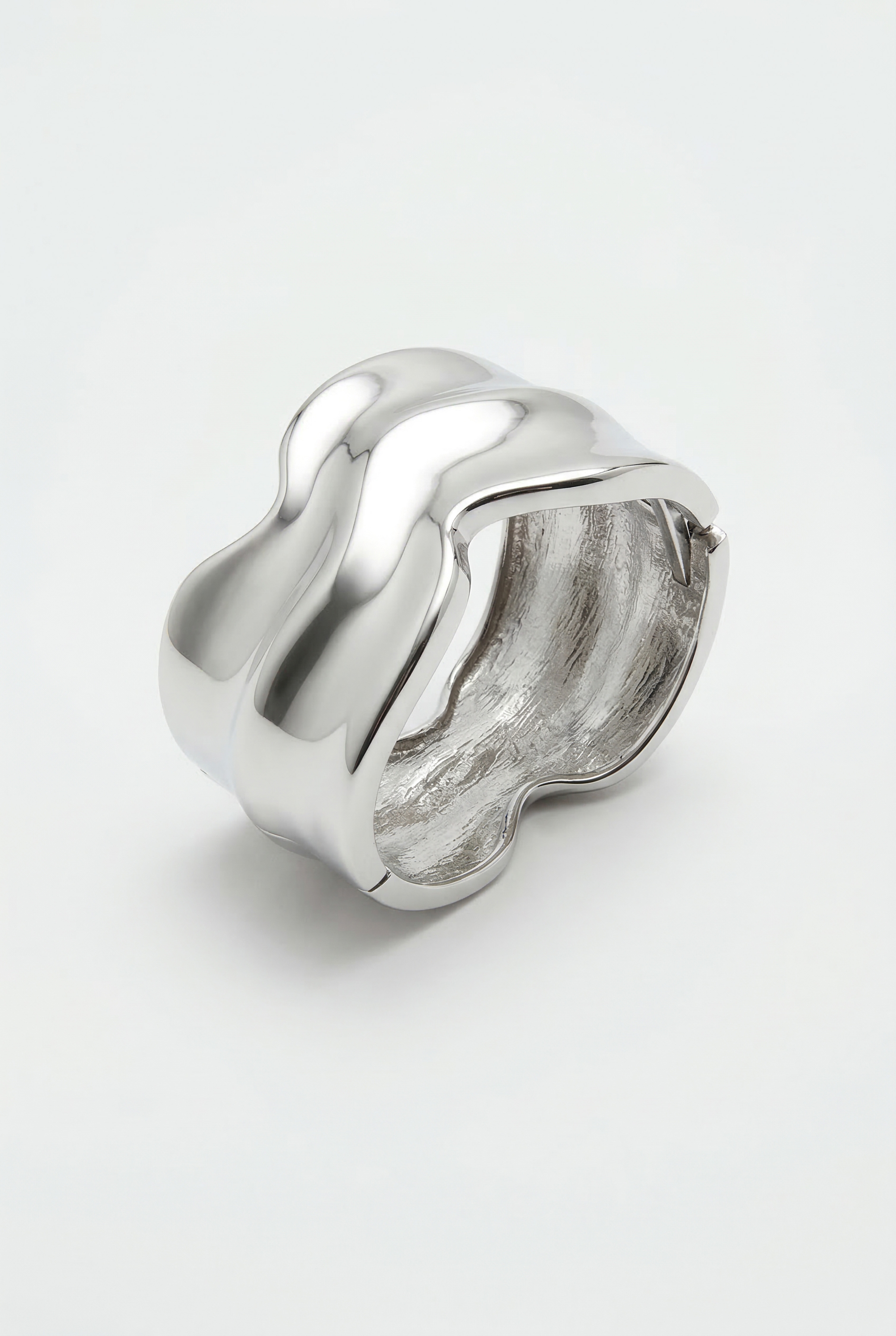 Wide band rigid bracelet with an irregular profile and flowing lines.
