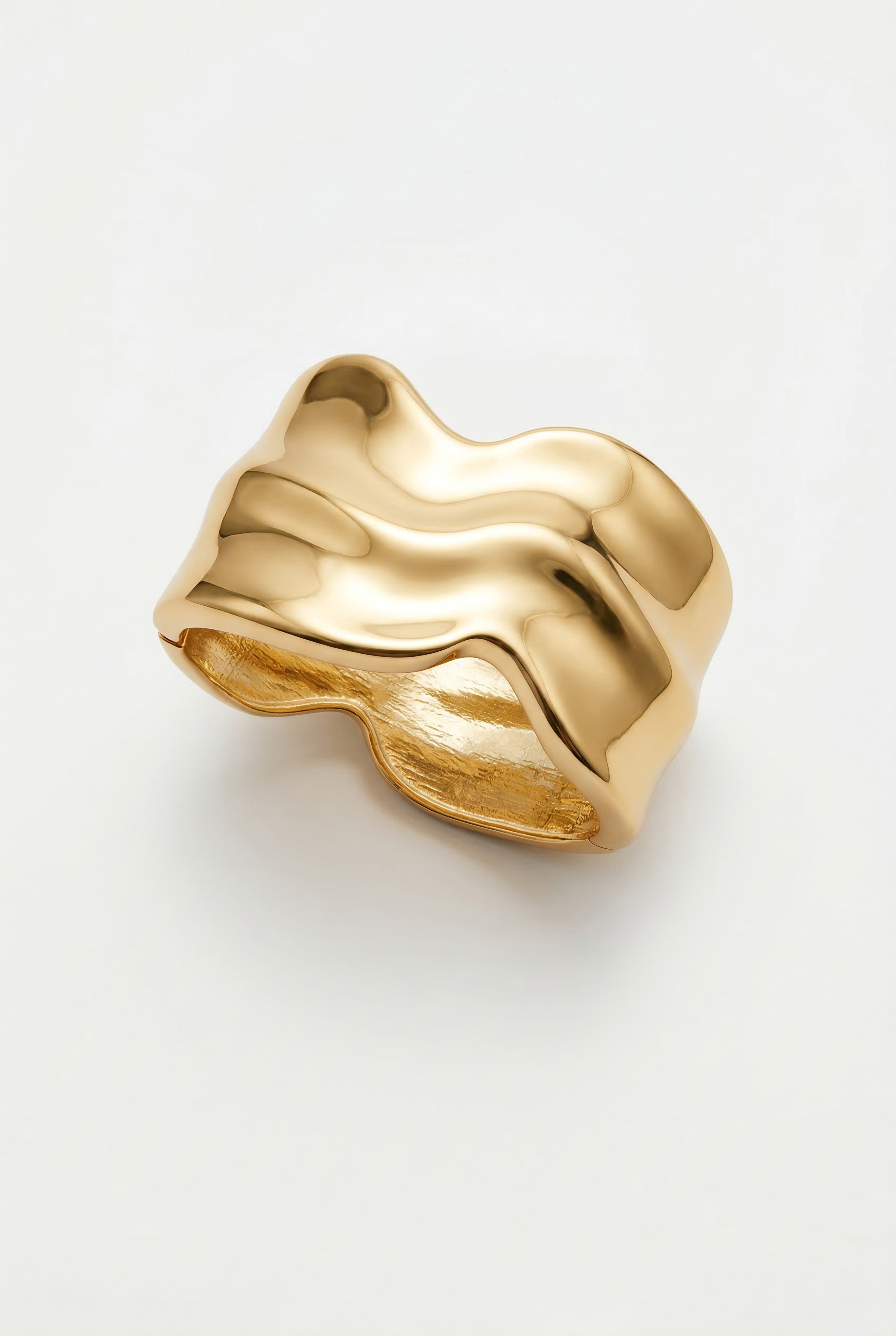 Wide band rigid bracelet with an irregular profile and flowing lines.