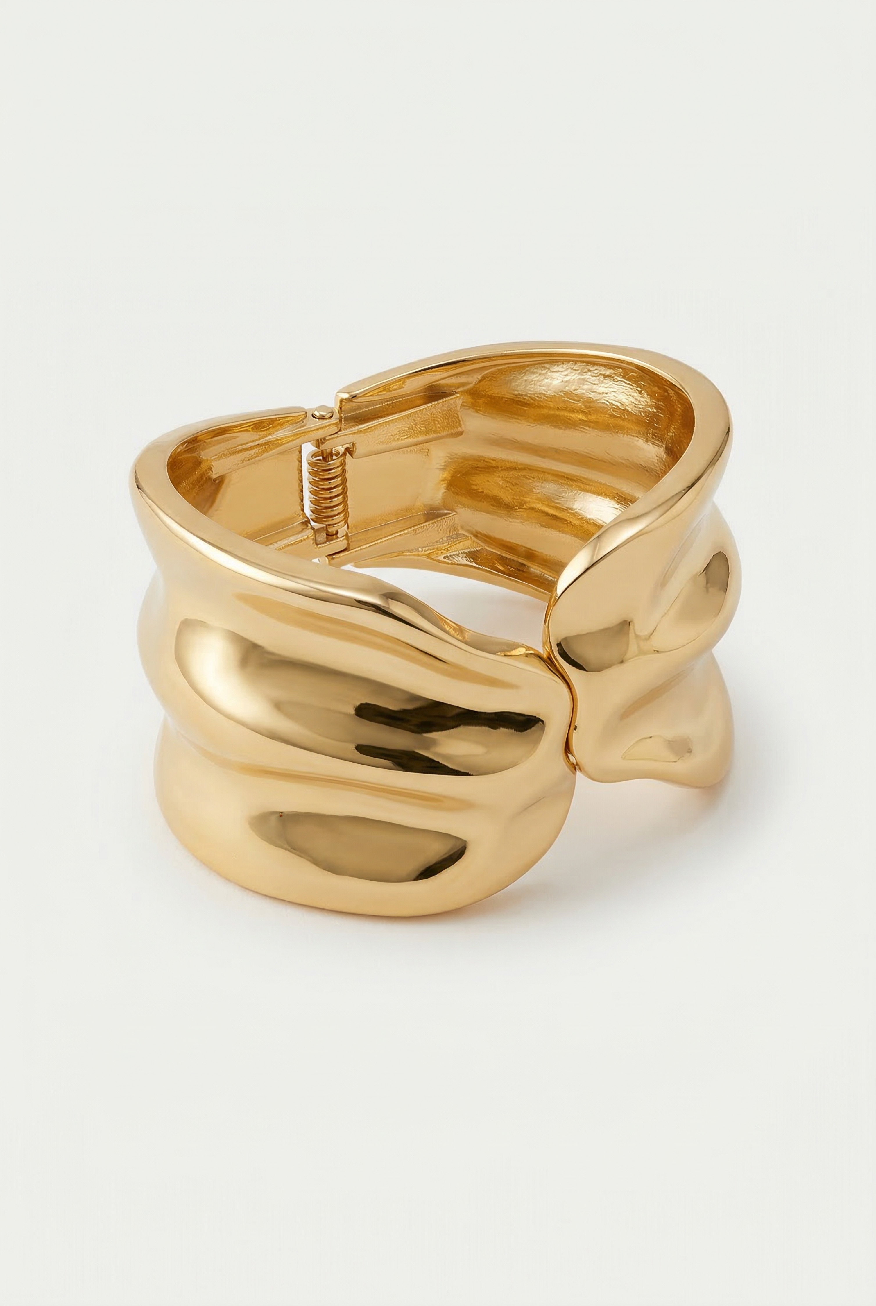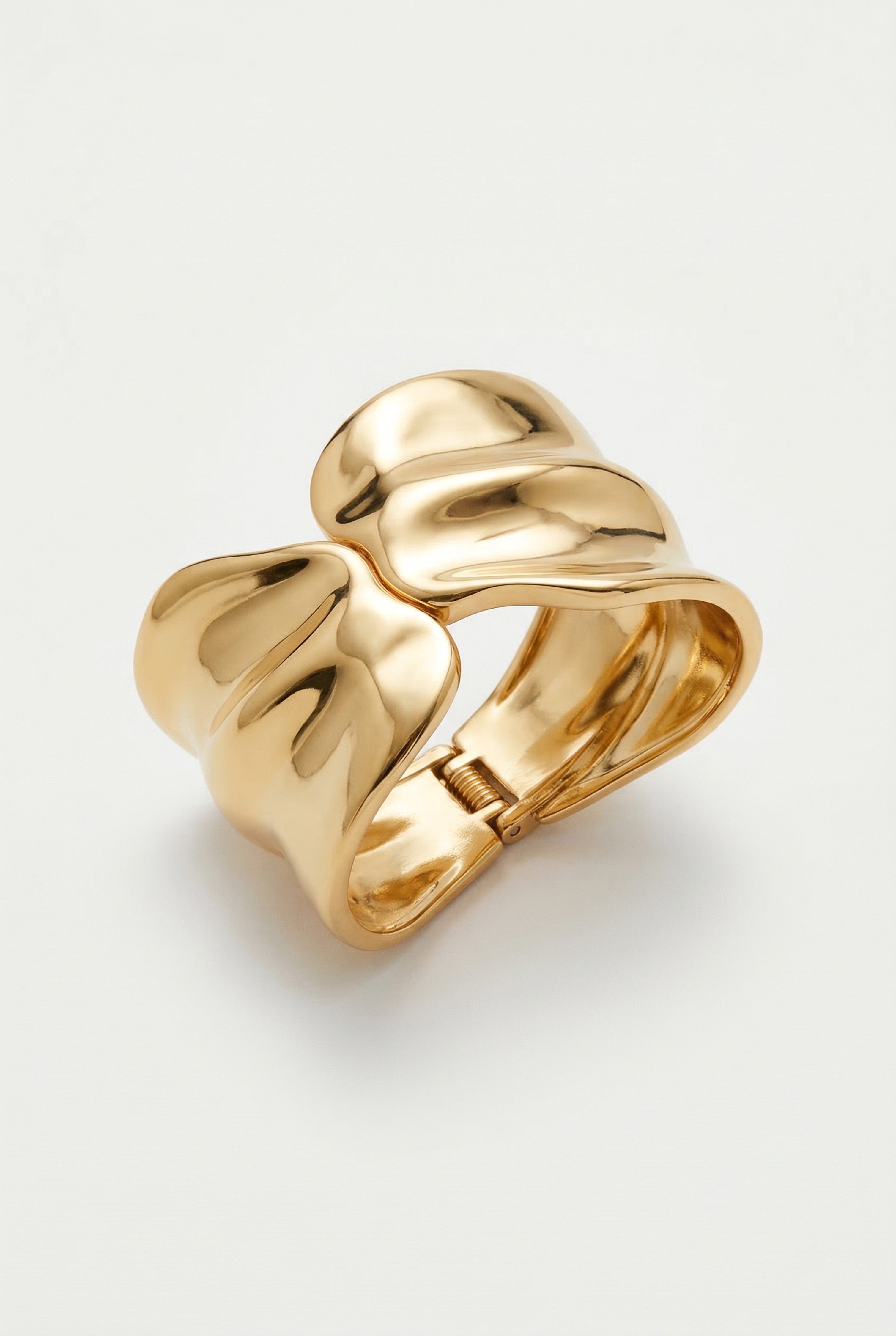 Wide band rigid bracelet with an irregular profile and flowing lines.