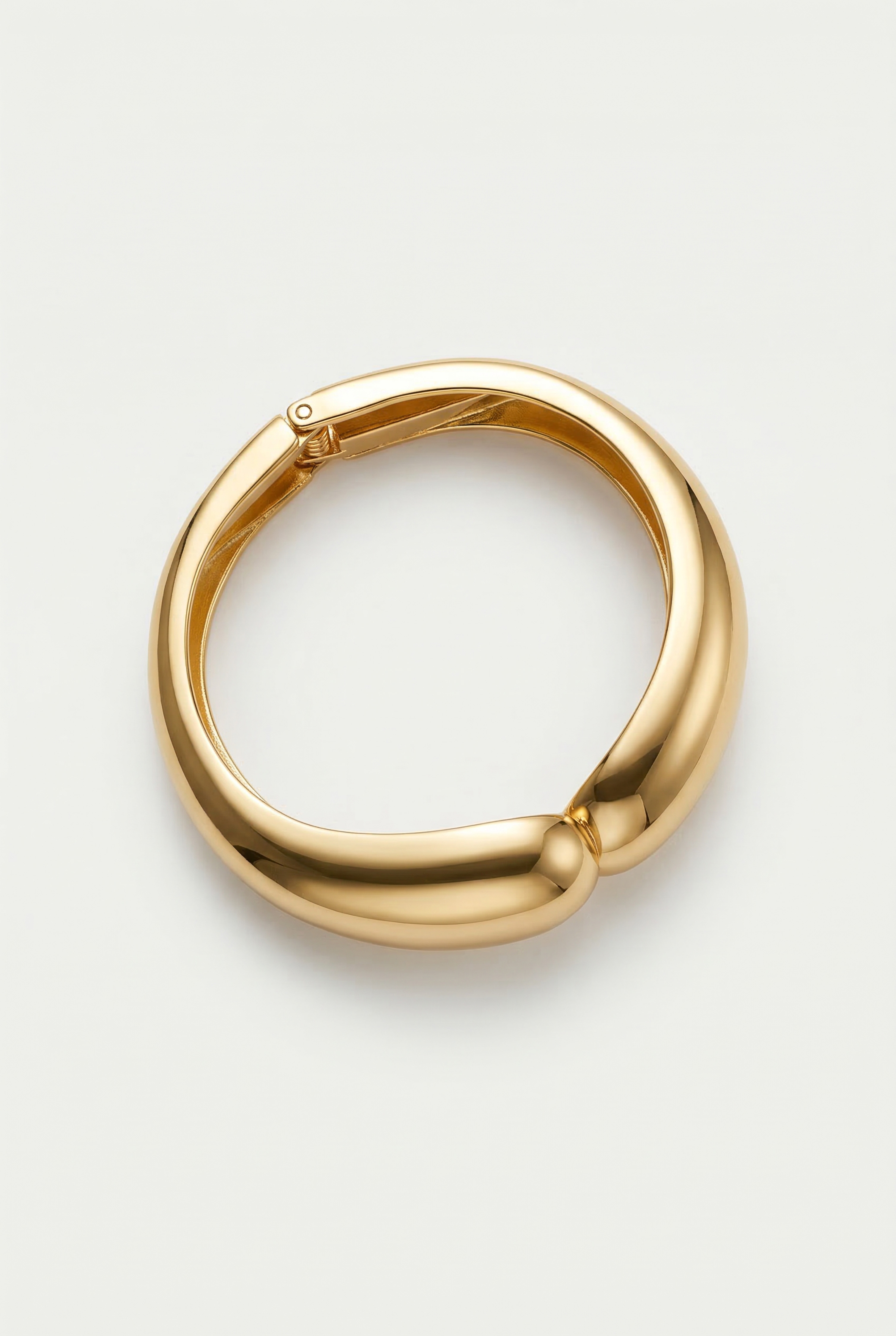 Wide band rigid bracelet with asymmetrical profile and overlapping volumes.