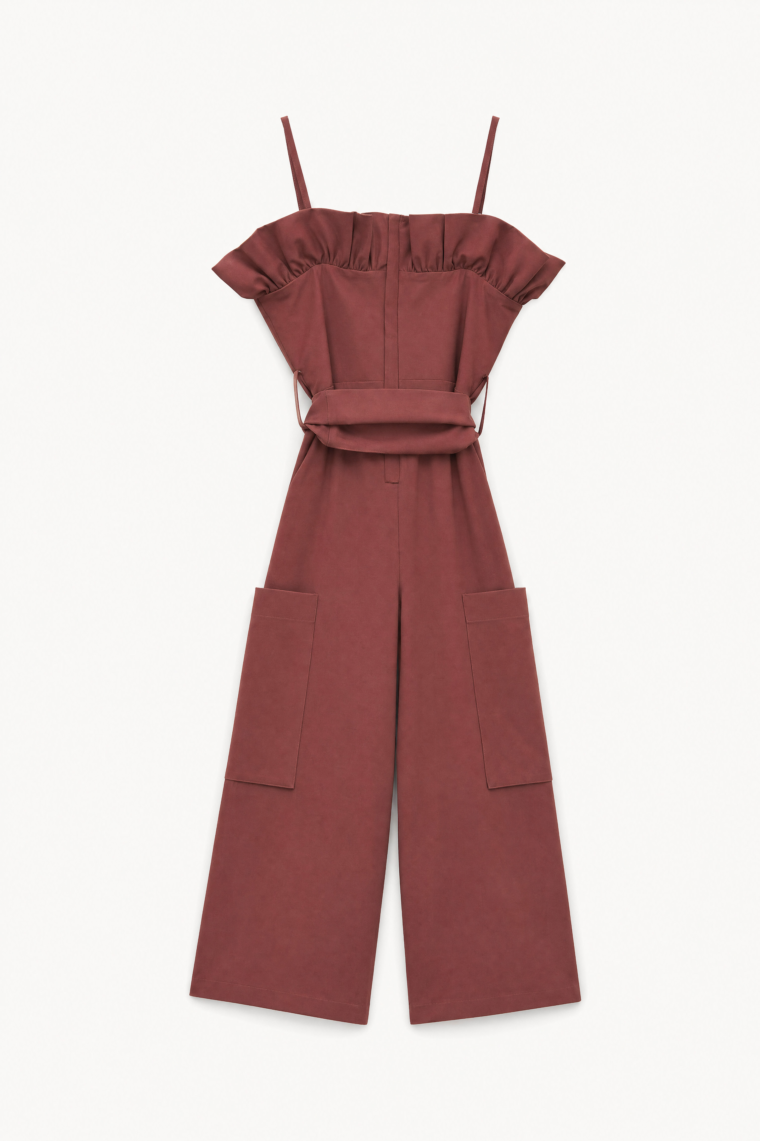 Jumpsuit with wide, turned-up neckline and thin, adjustable shoulder straps.