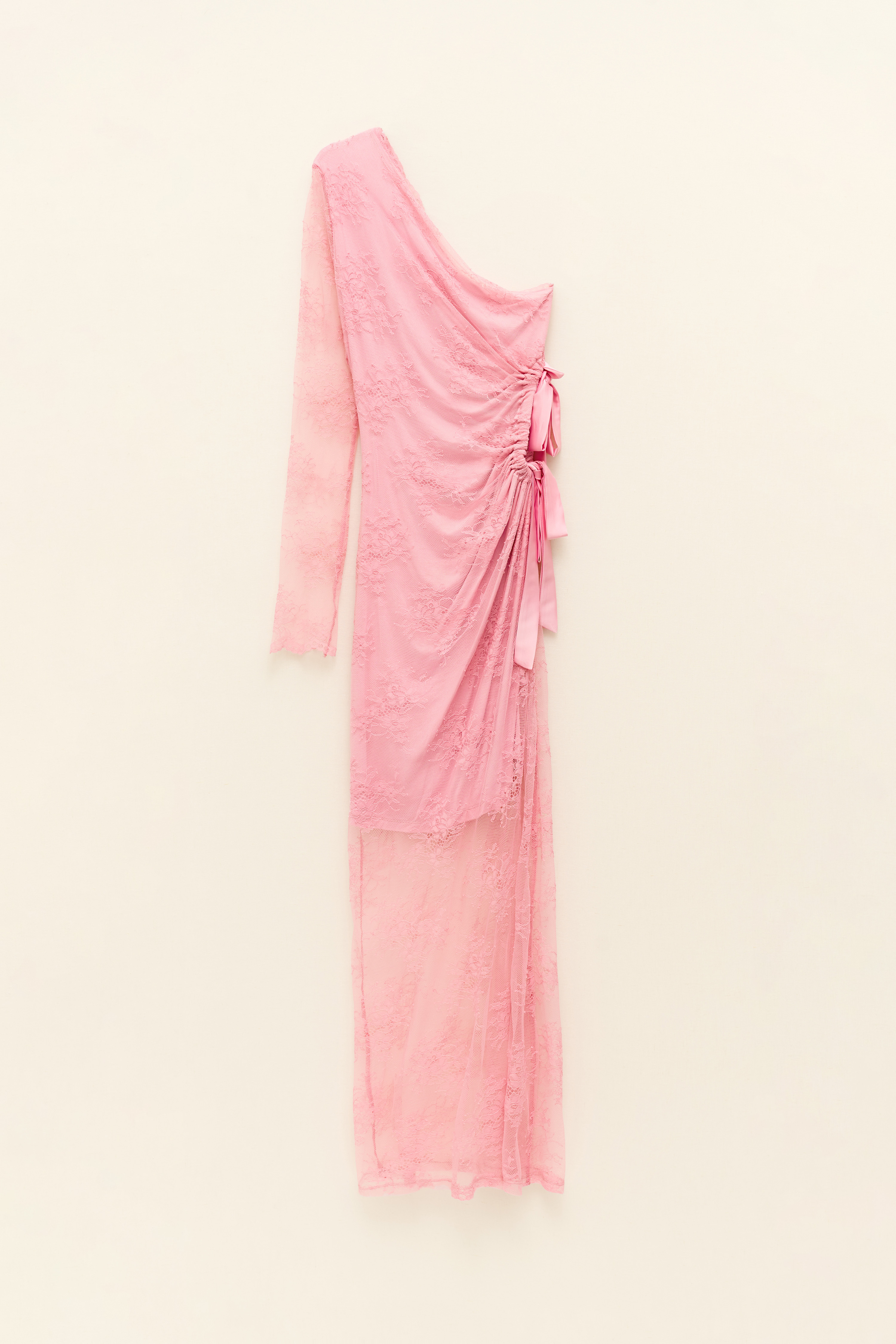 Long one-shoulder dress in transparent lace. Draped detail on the side. Inner lining. Side closure with button and ribbon. Slim fit, available in size S, M, L.