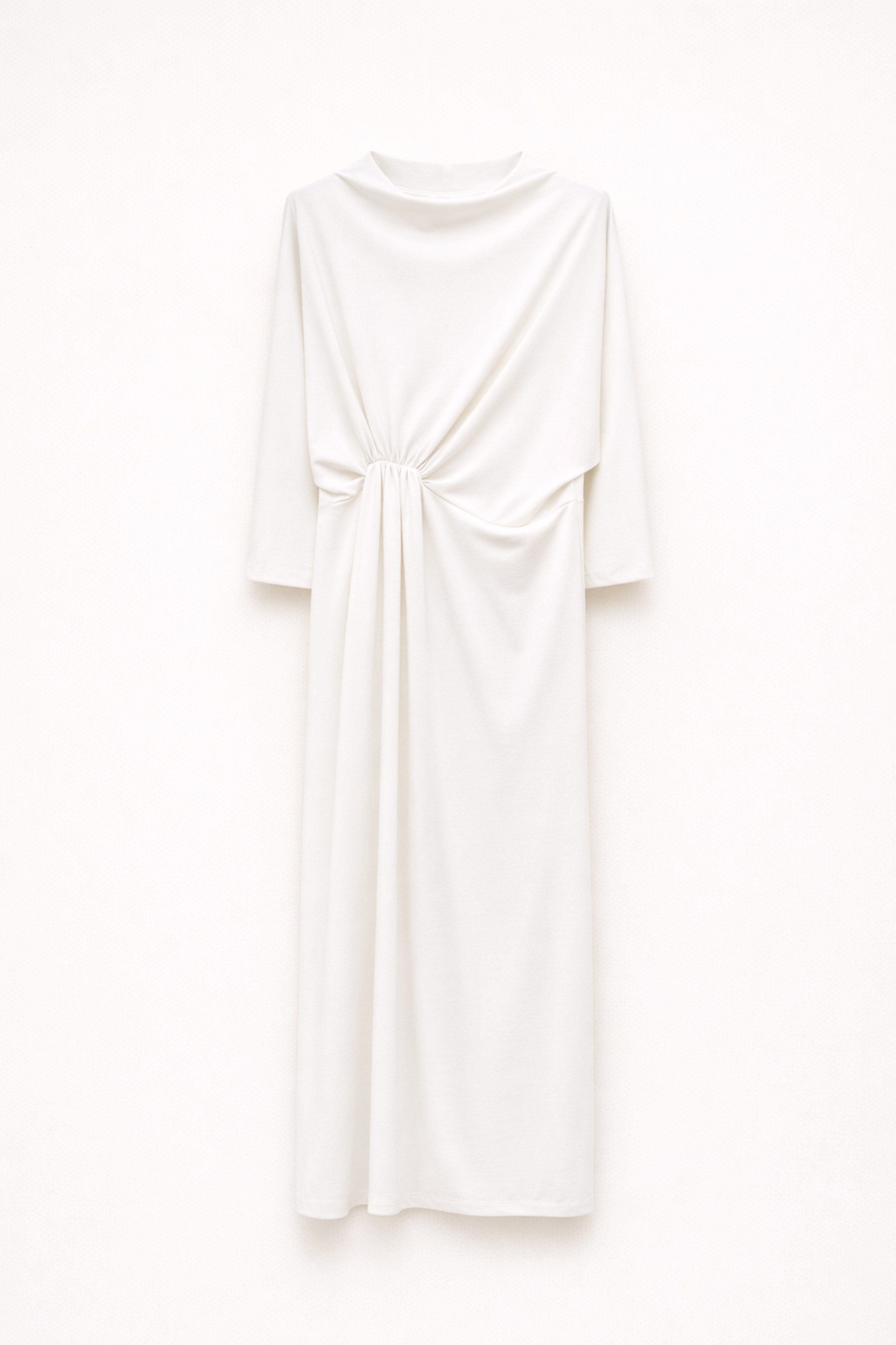 Draped front with defined waist.