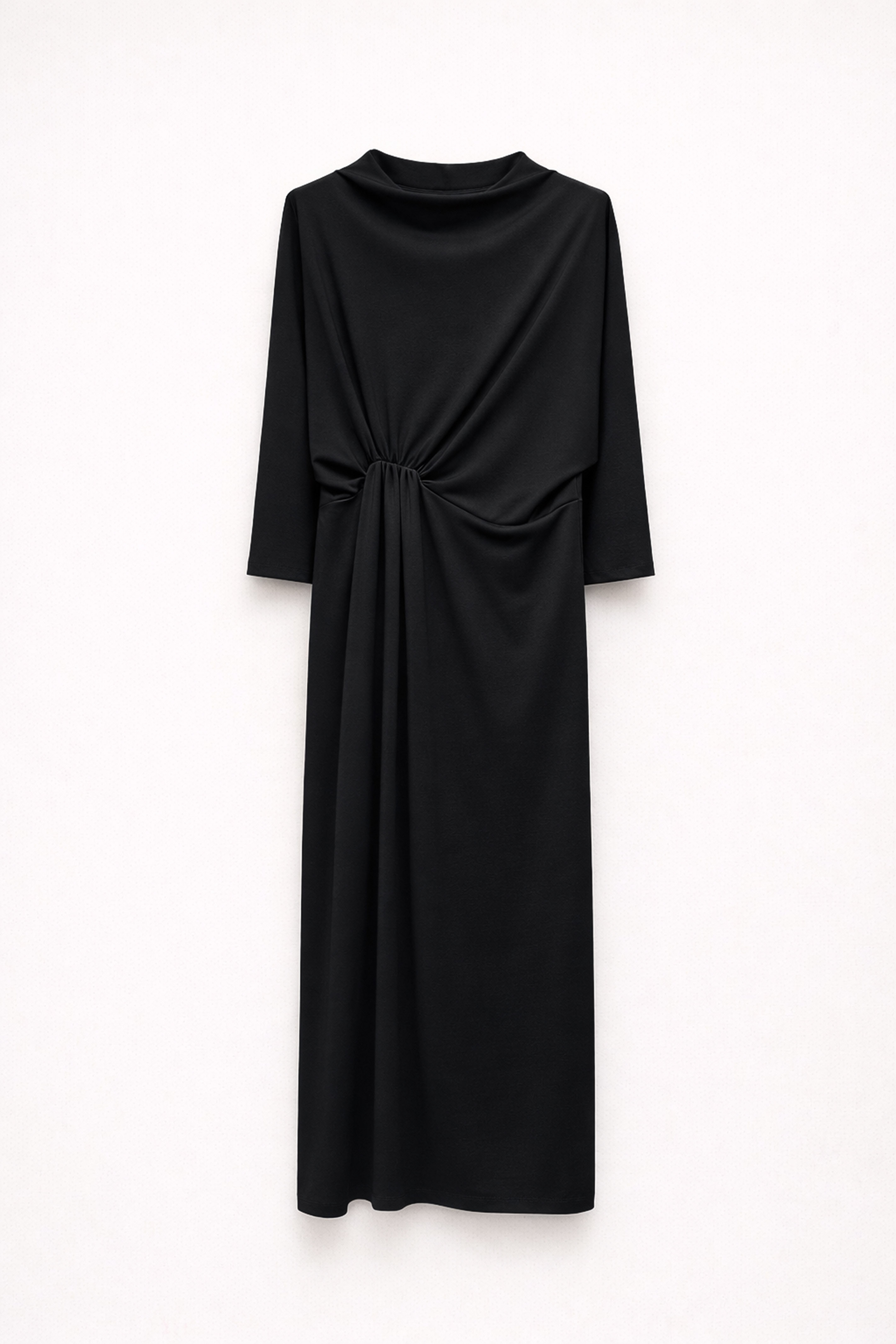 Long dress with wide off-the-shoulder neckline and ruffles.