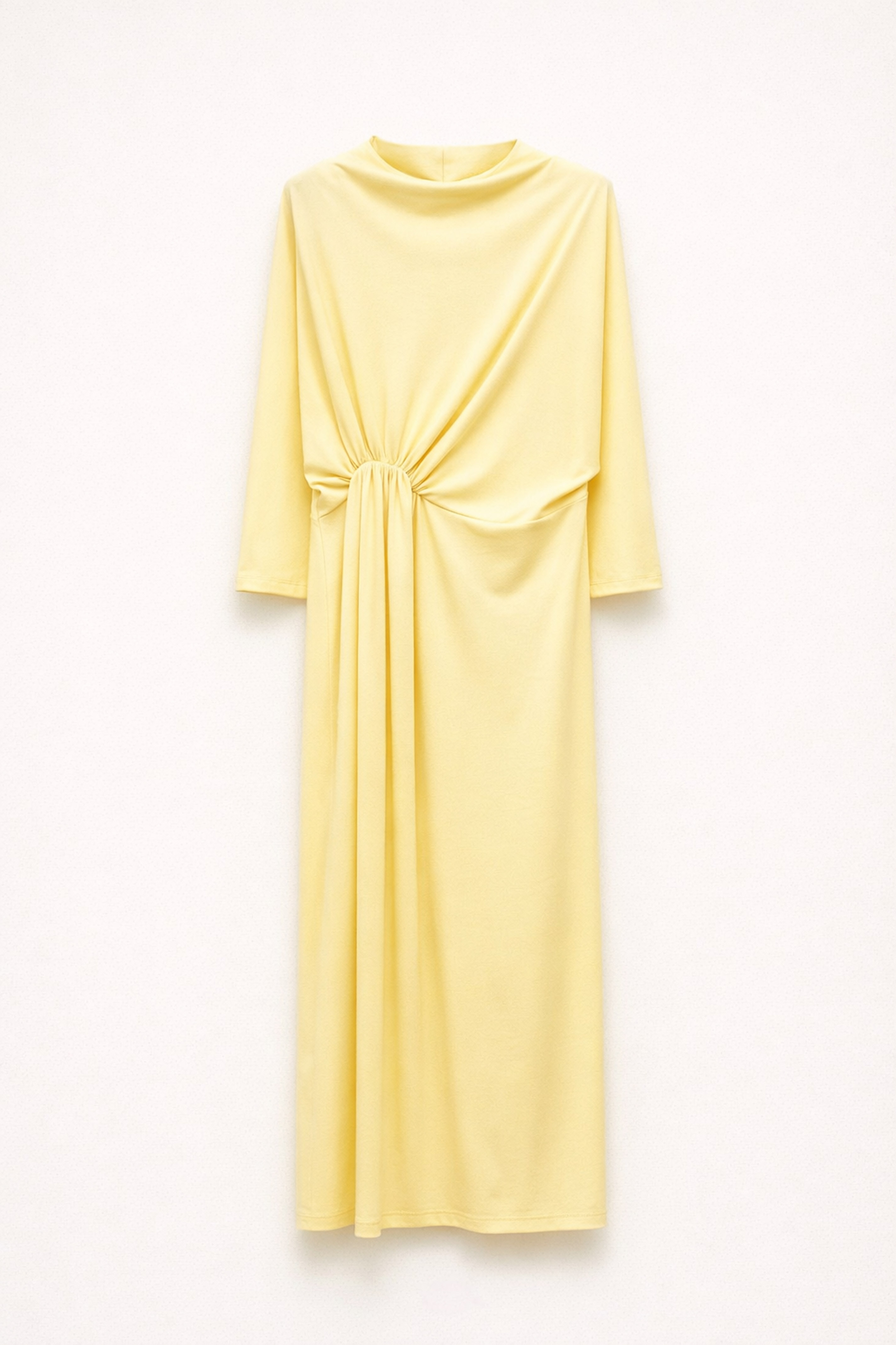 Long dress with wide off-the-shoulder neckline and ruffles.