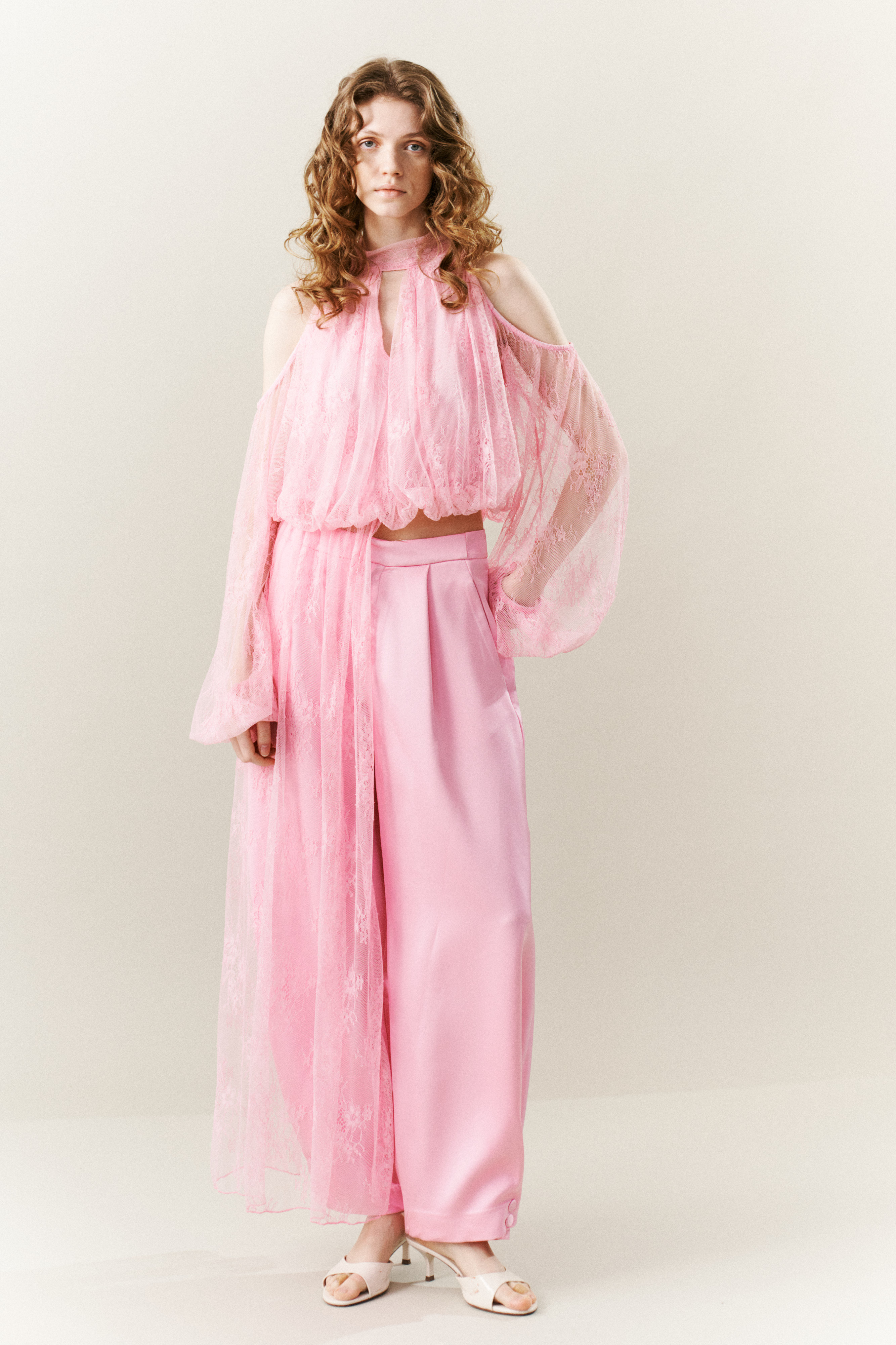 Tulle trousers with floral lace embroidery.