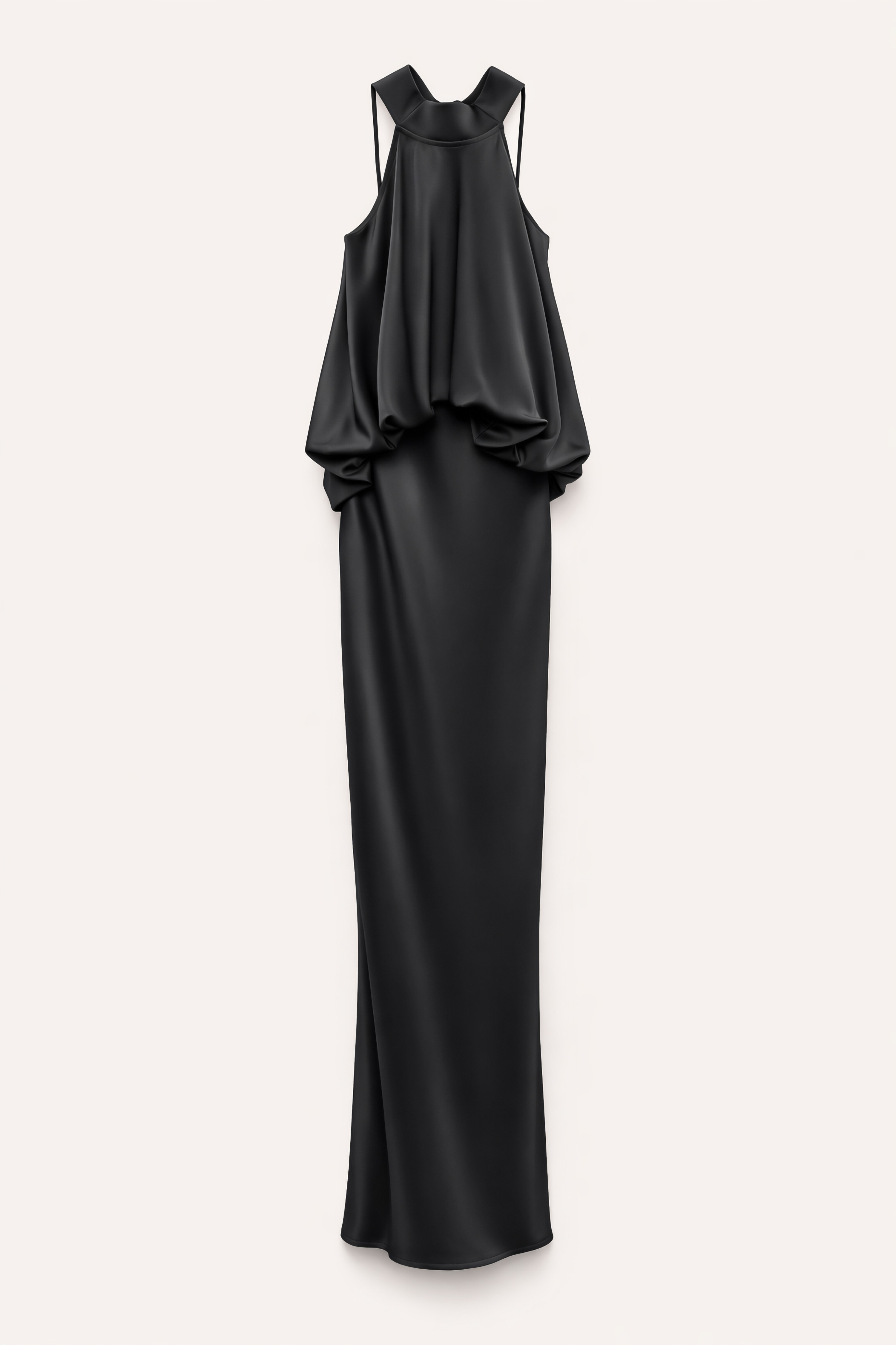 Long dress with wide off-the-shoulder neckline and ruffles.