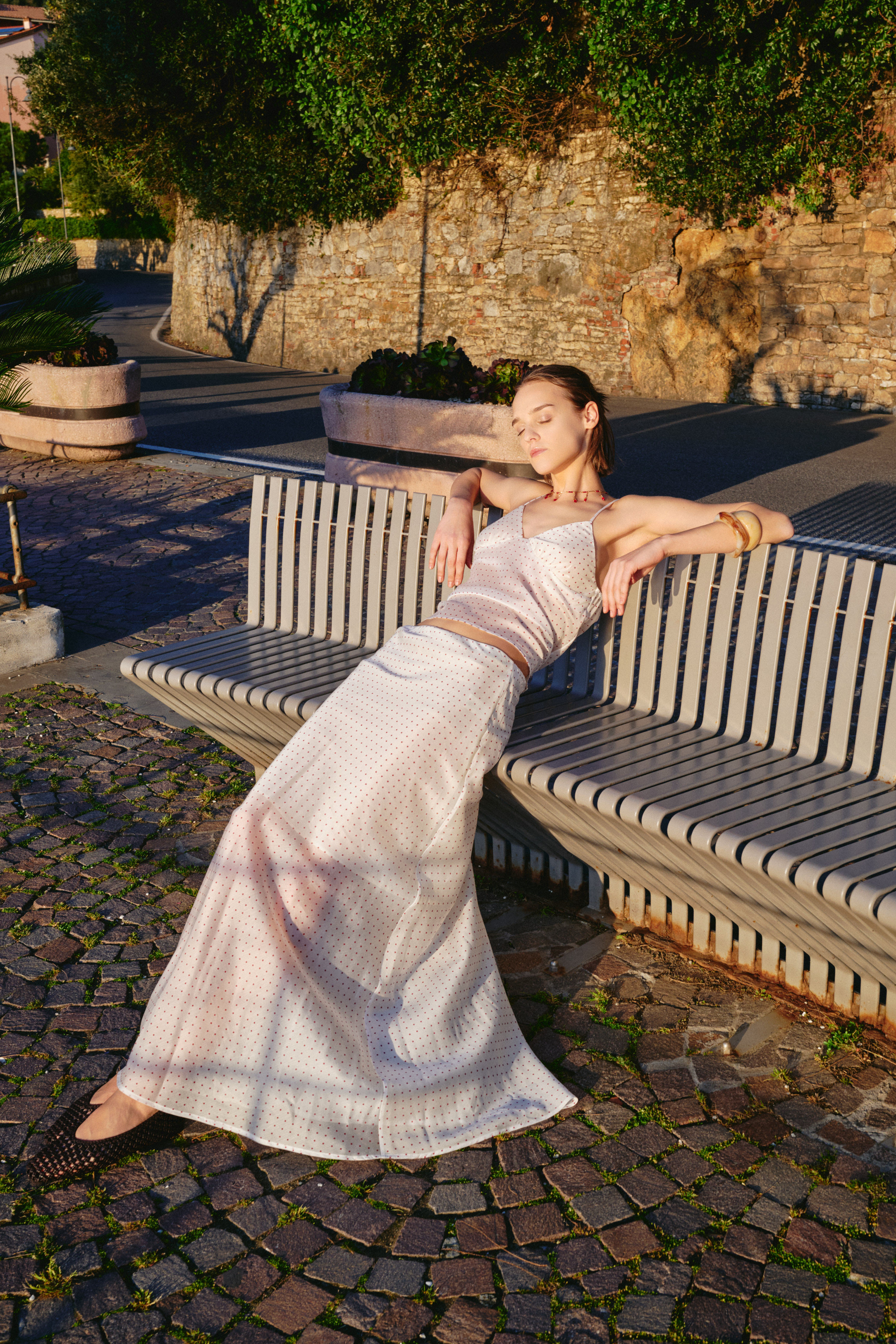 Midi skirt with all-over polka dot print.