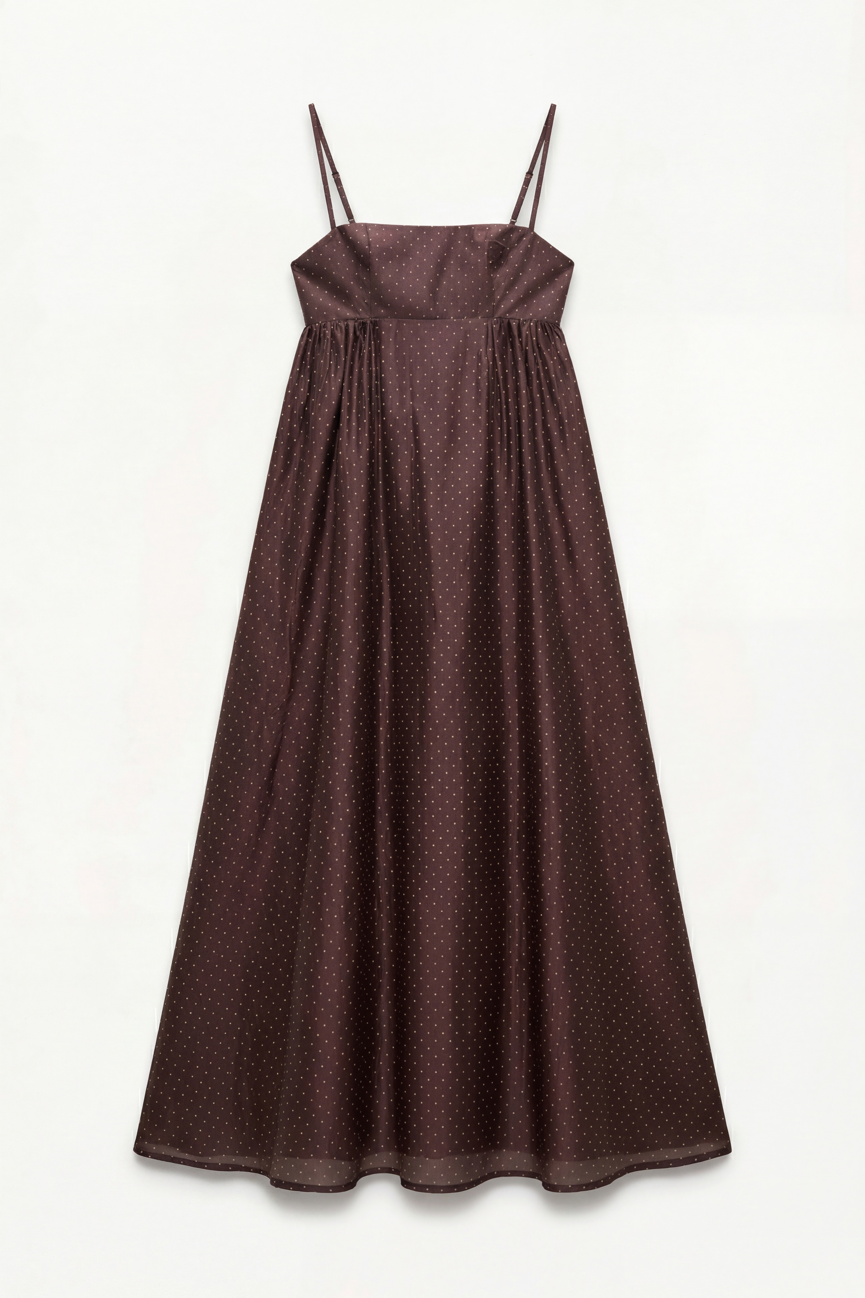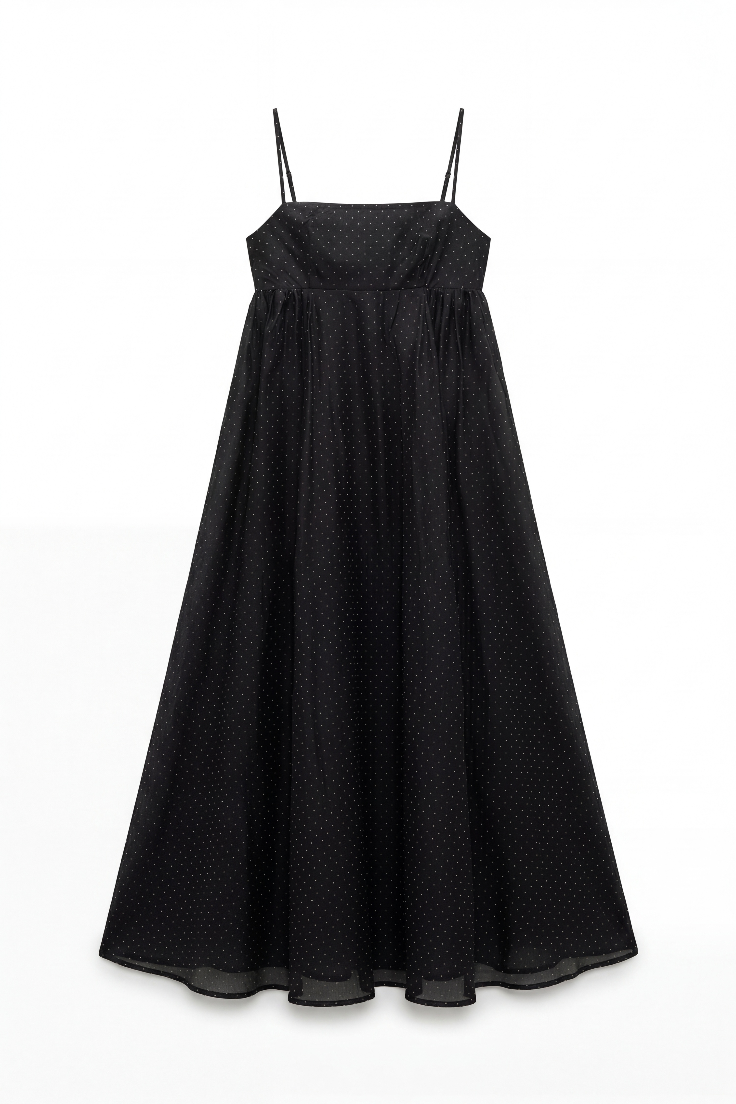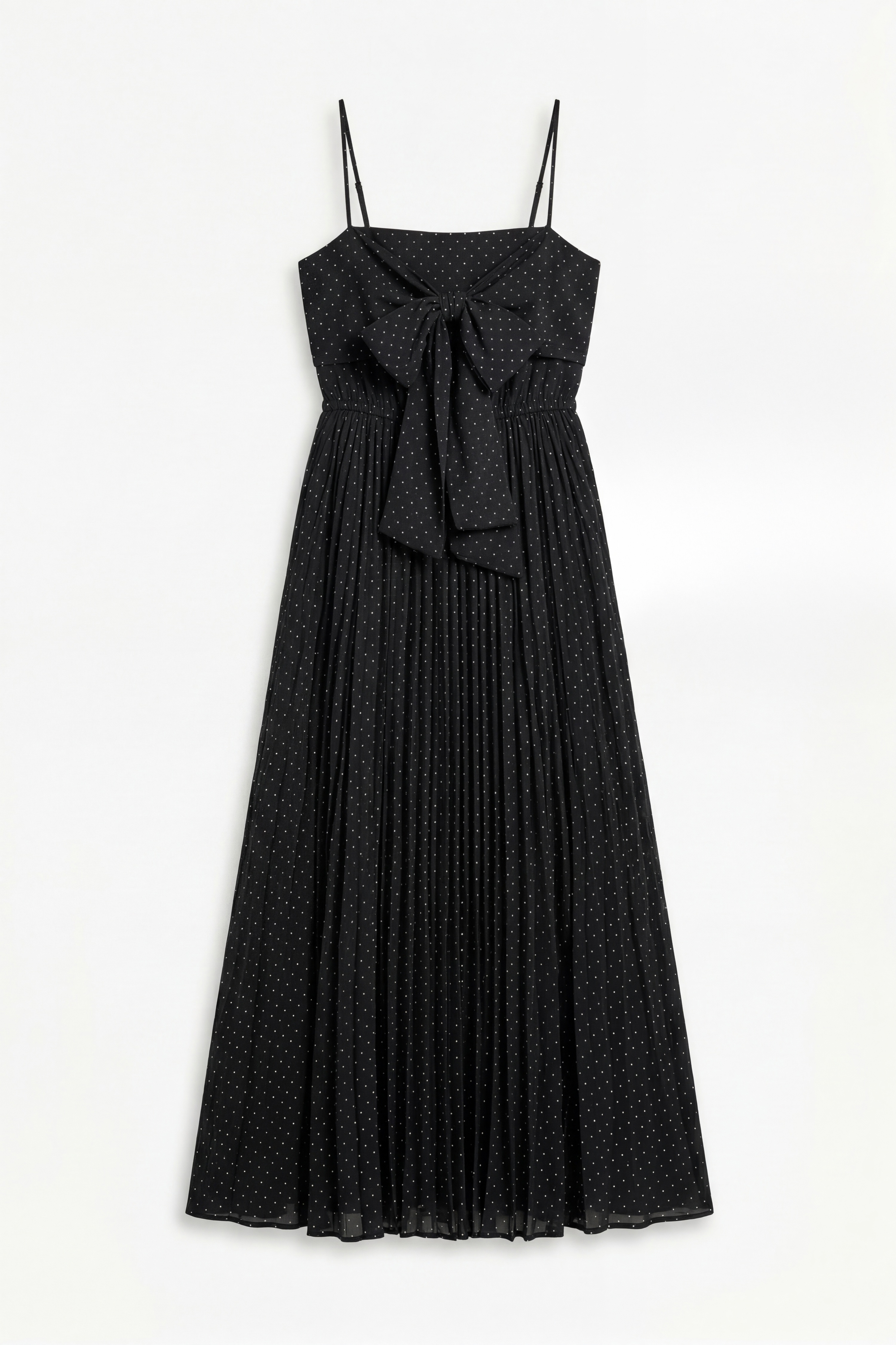 Long dress with wide off-the-shoulder neckline and ruffles.