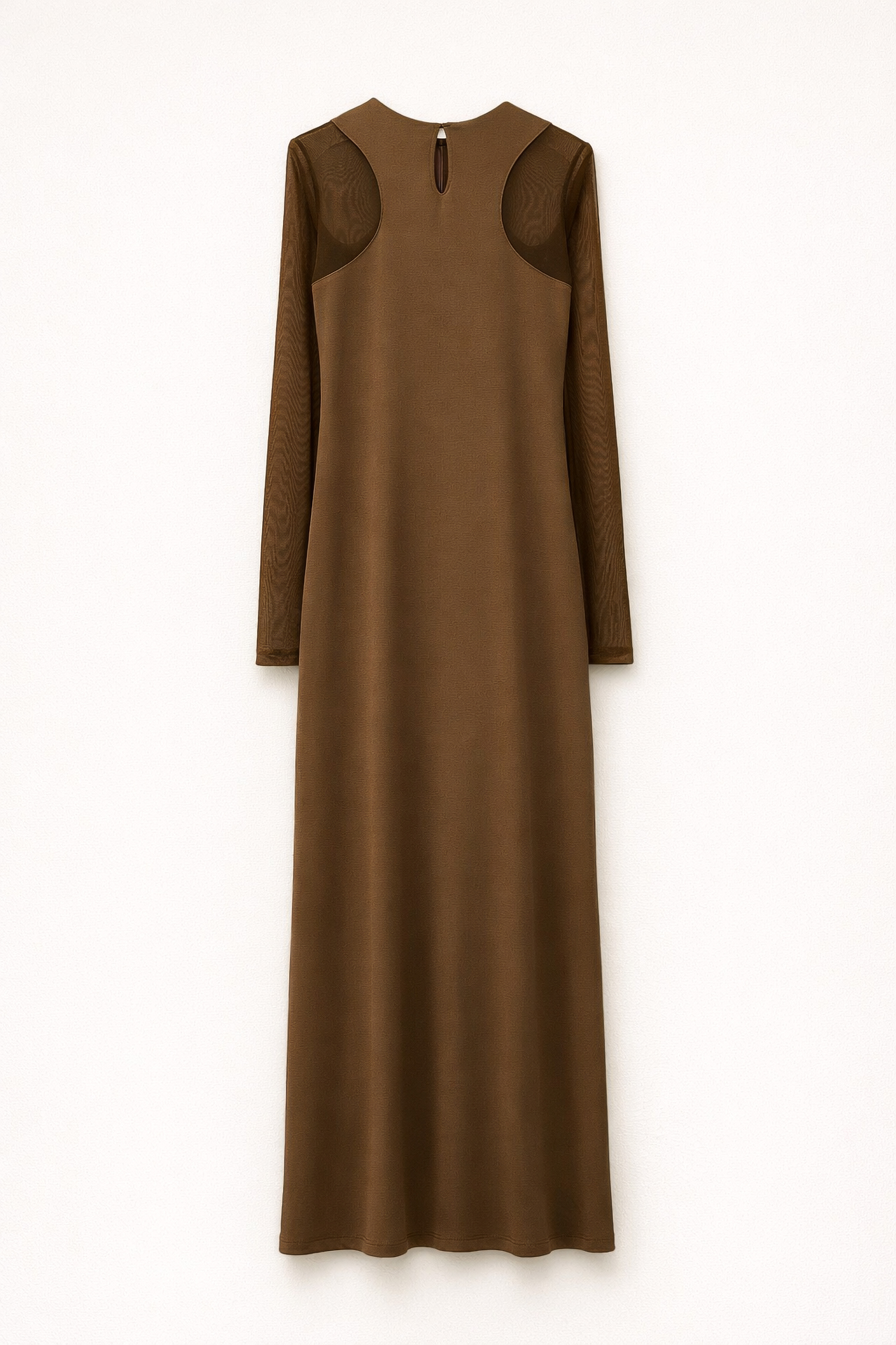 Long dress with wide off-the-shoulder neckline and ruffles.