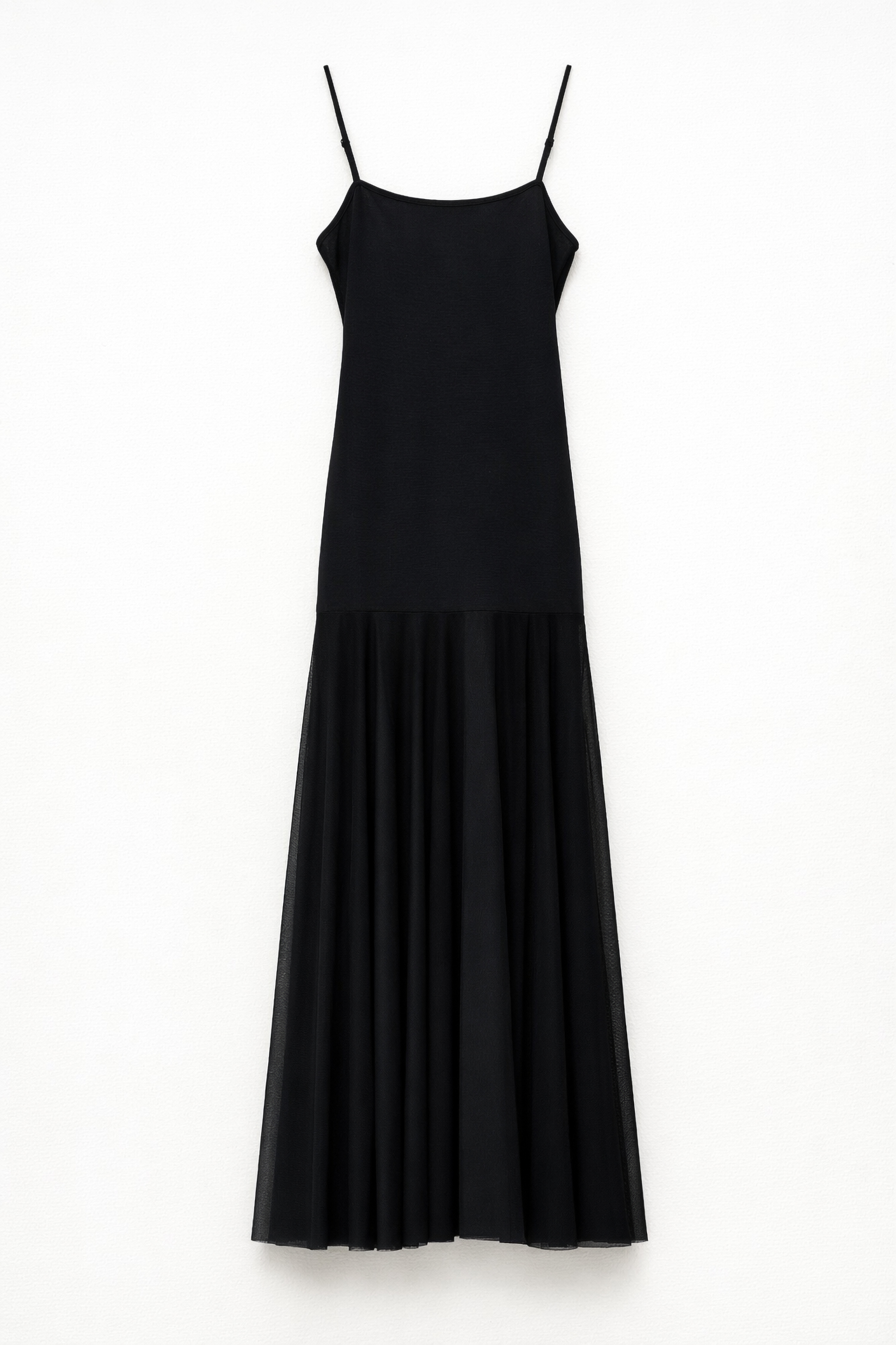 Long dress with wide off-the-shoulder neckline and ruffles.