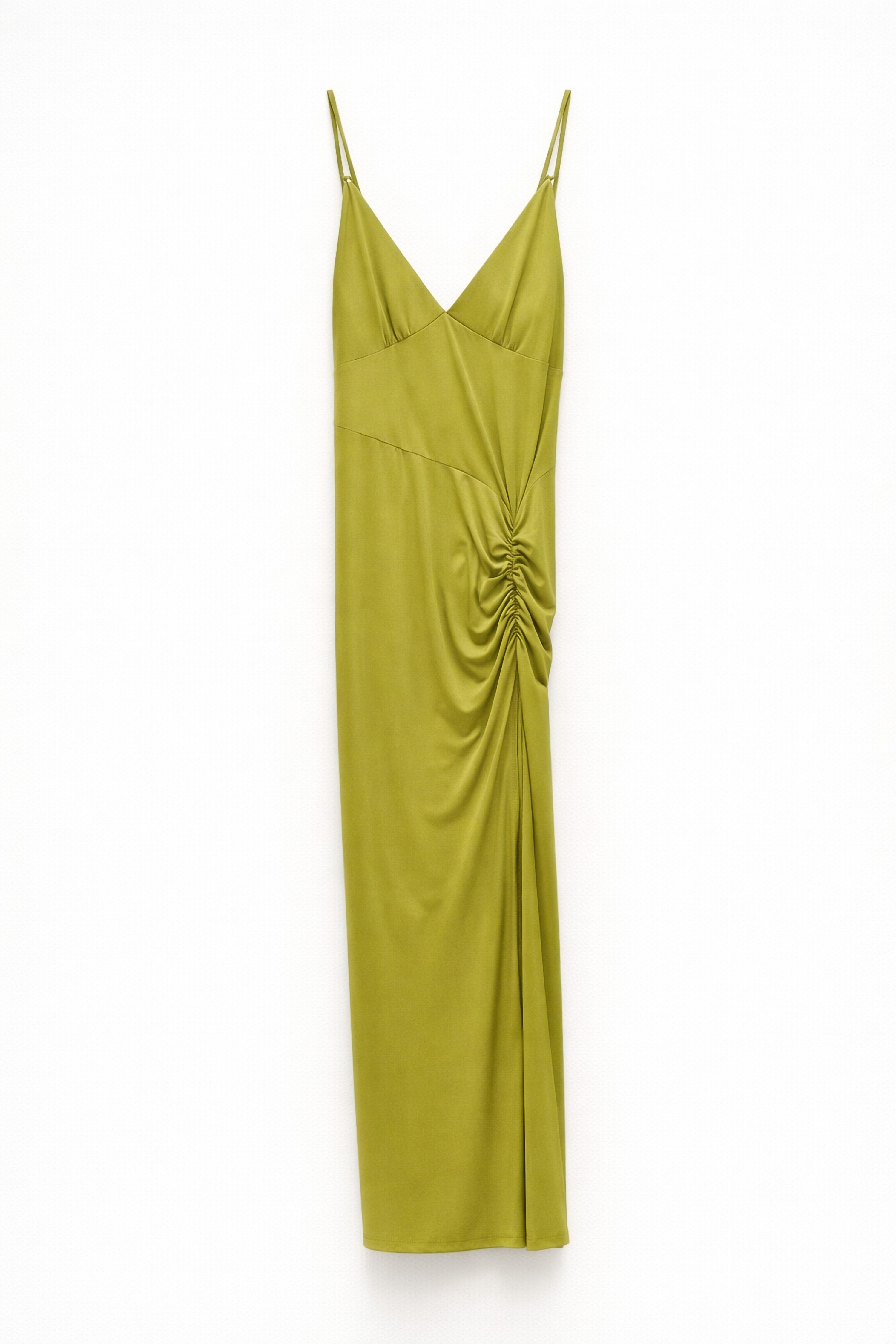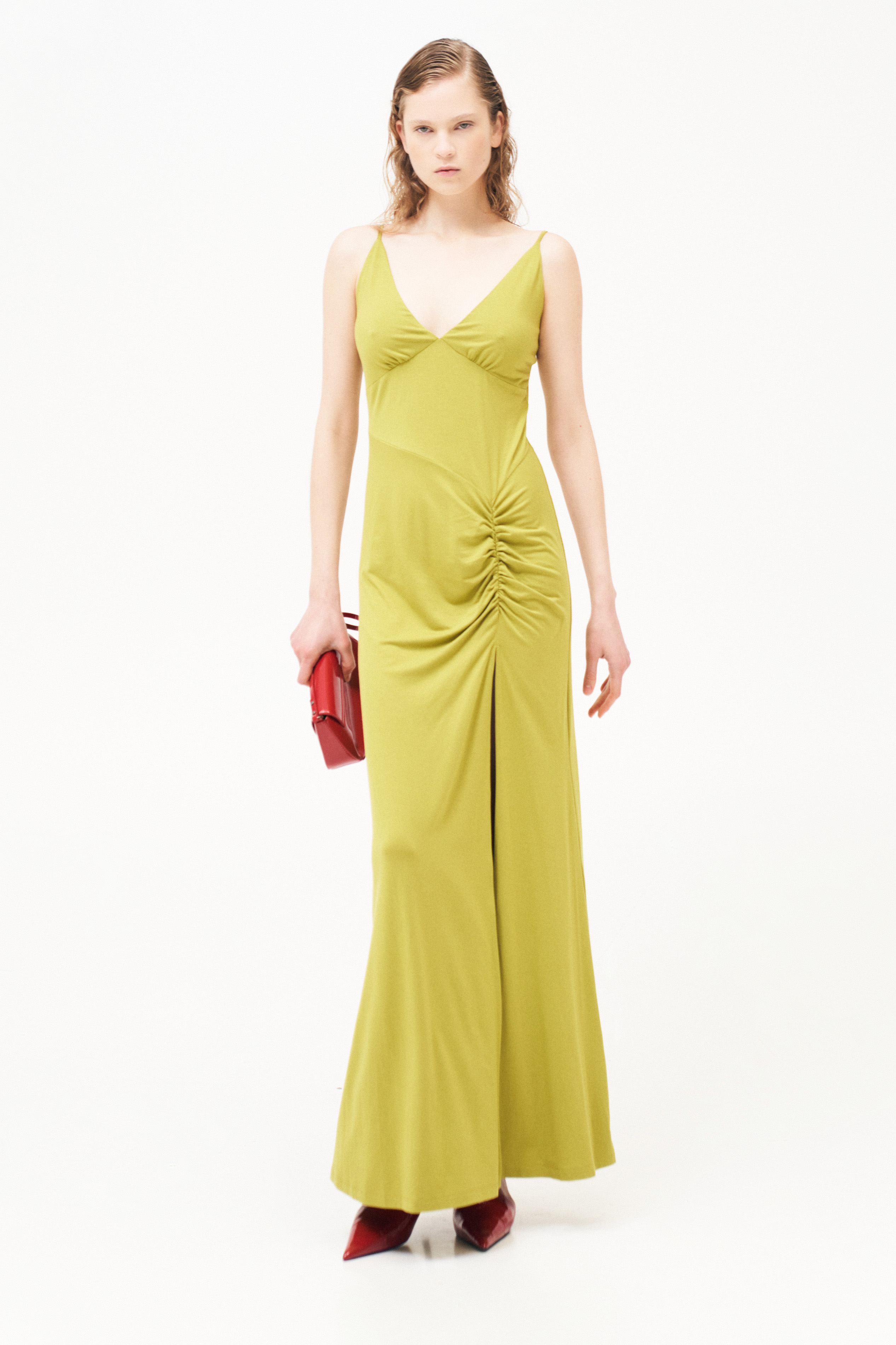 Long dress with wide off-the-shoulder neckline and ruffles.