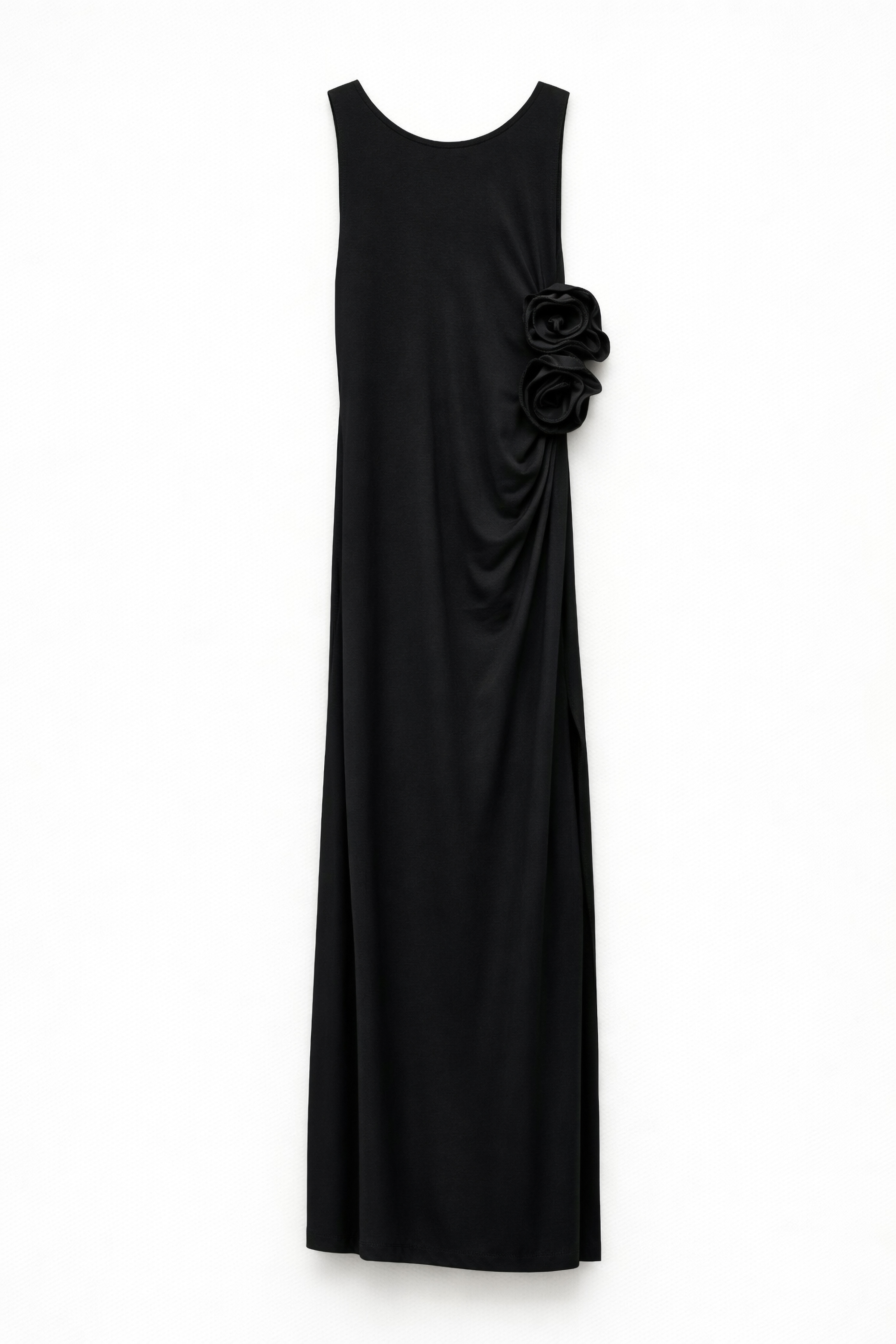 Long dress with wide off-the-shoulder neckline and ruffles.