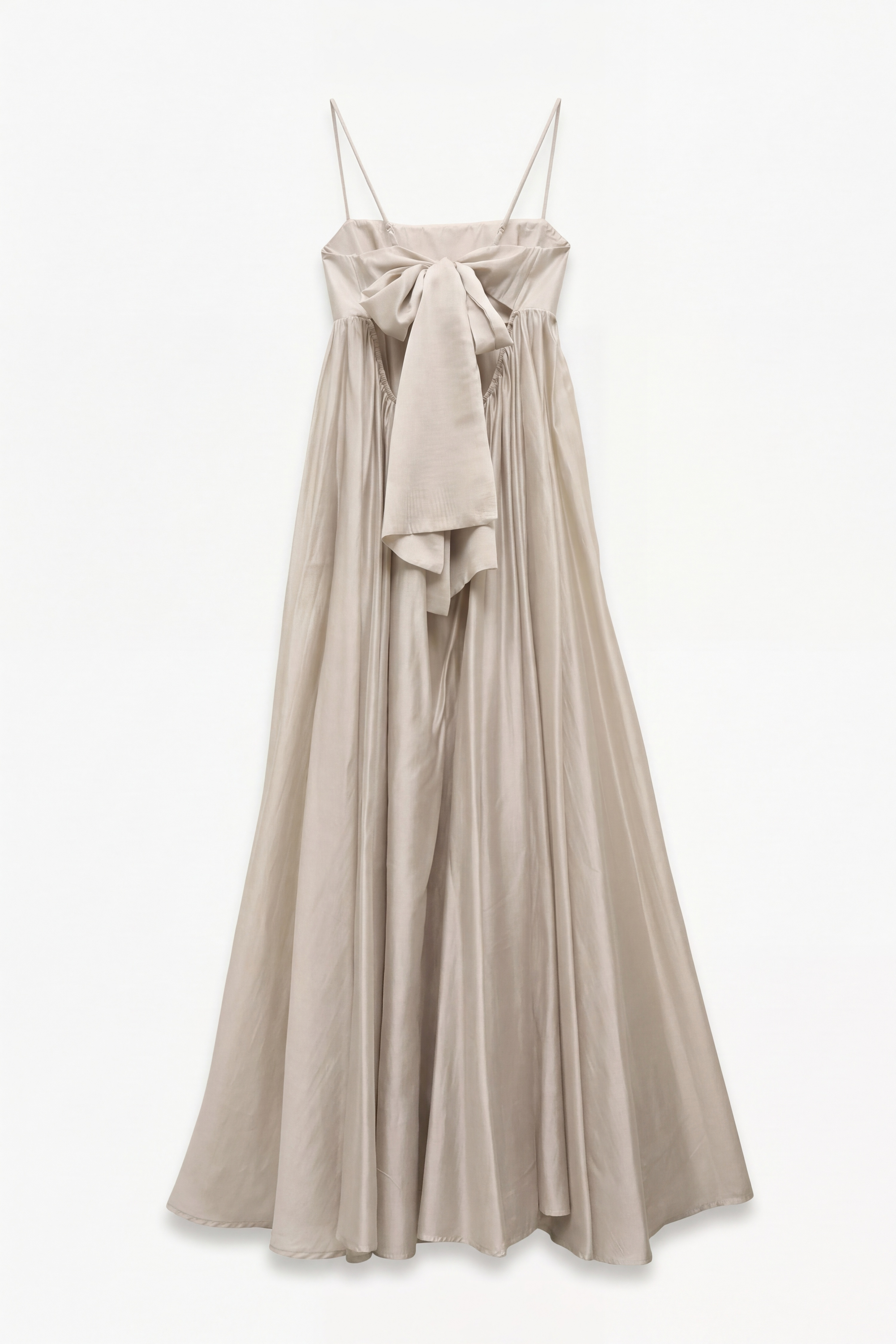 Long dress with wide off-the-shoulder neckline and ruffles.