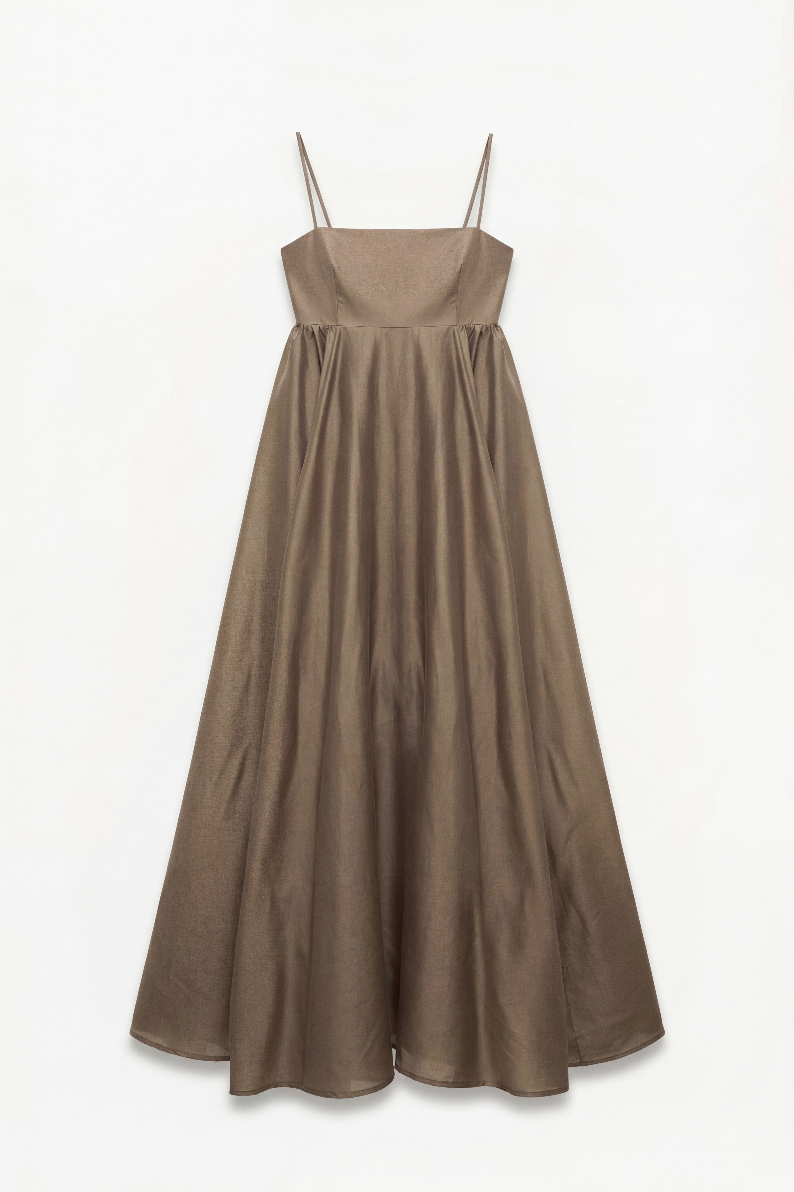 Long dress with wide off-the-shoulder neckline and ruffles.