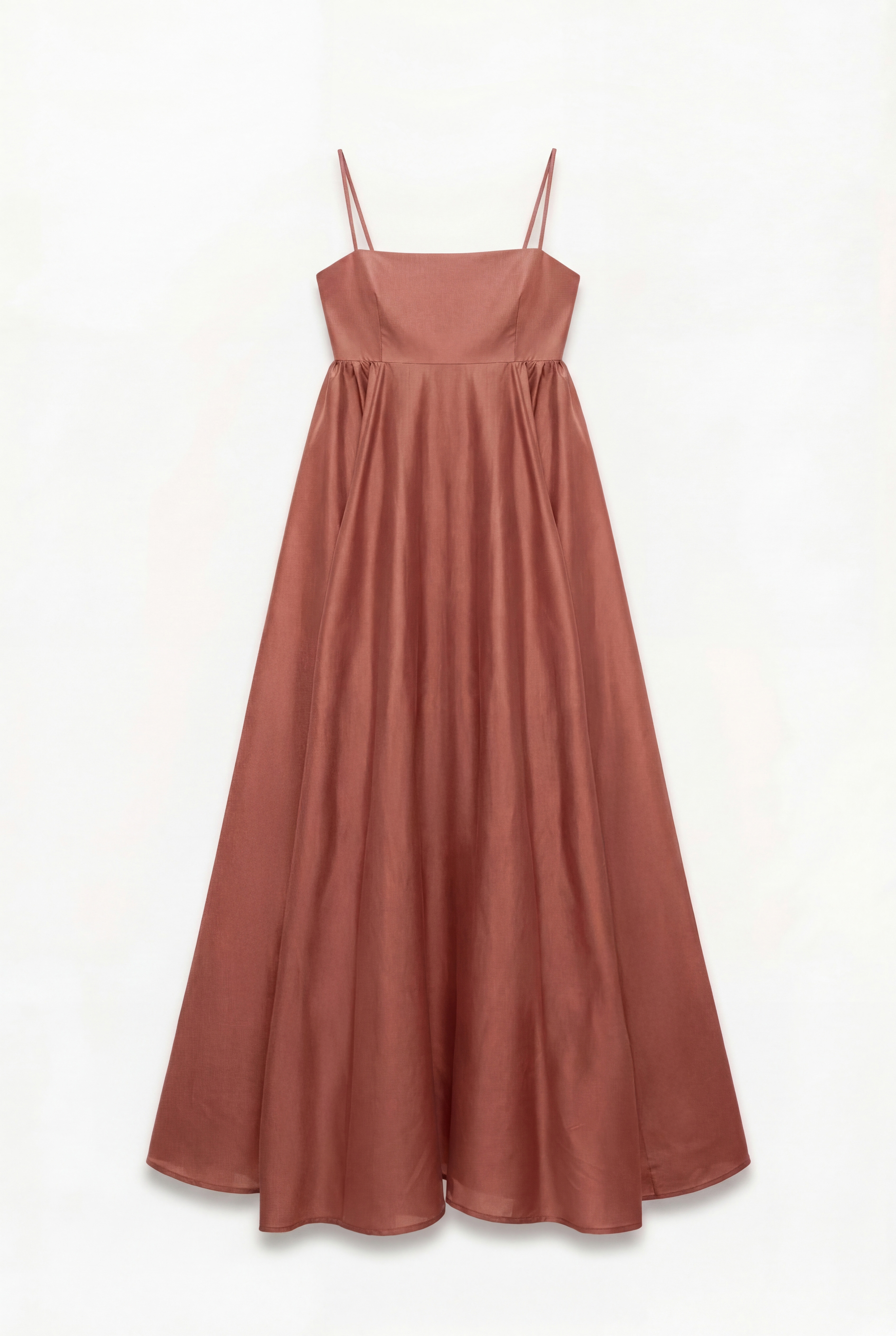 Long dress with wide off-the-shoulder neckline and ruffles.