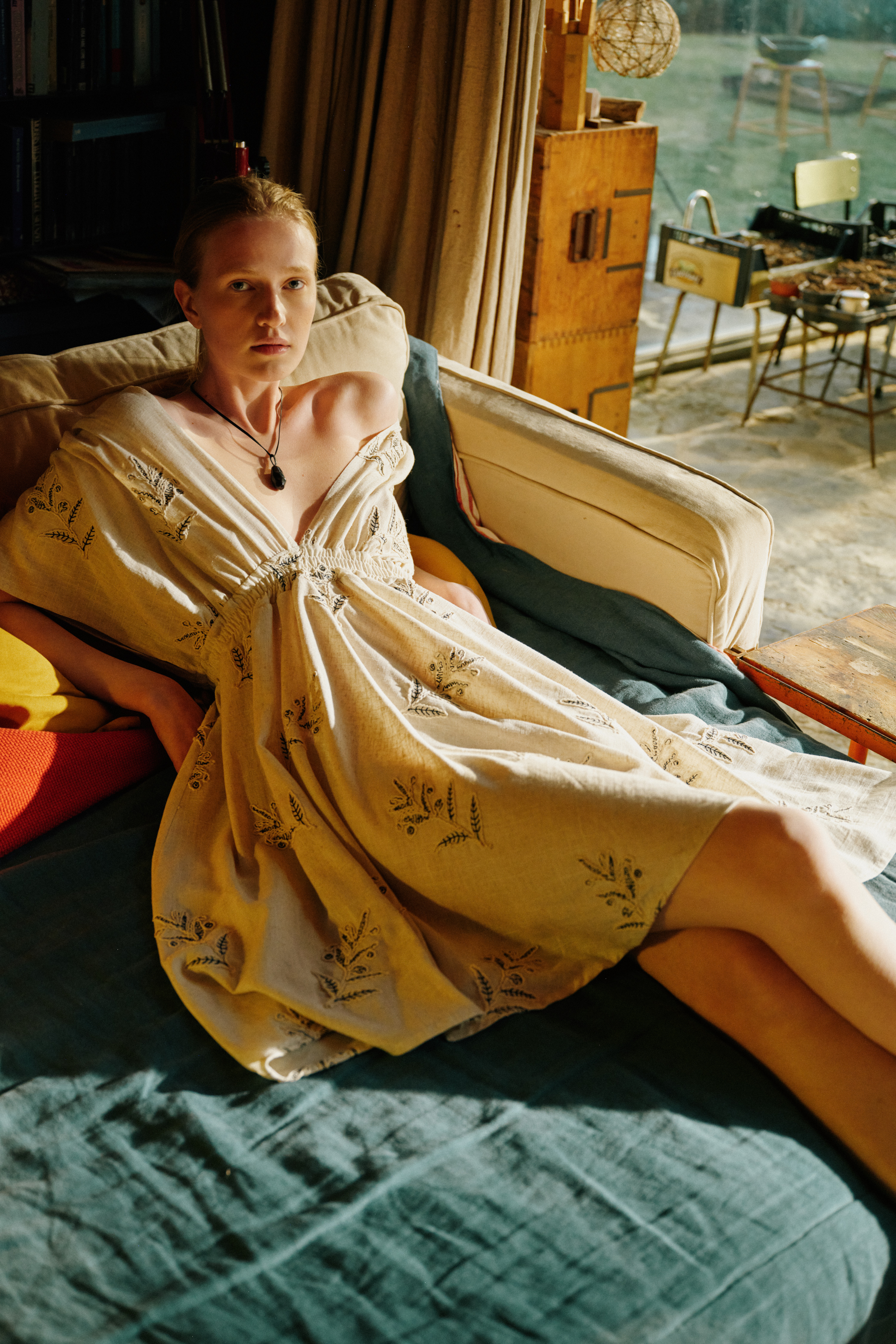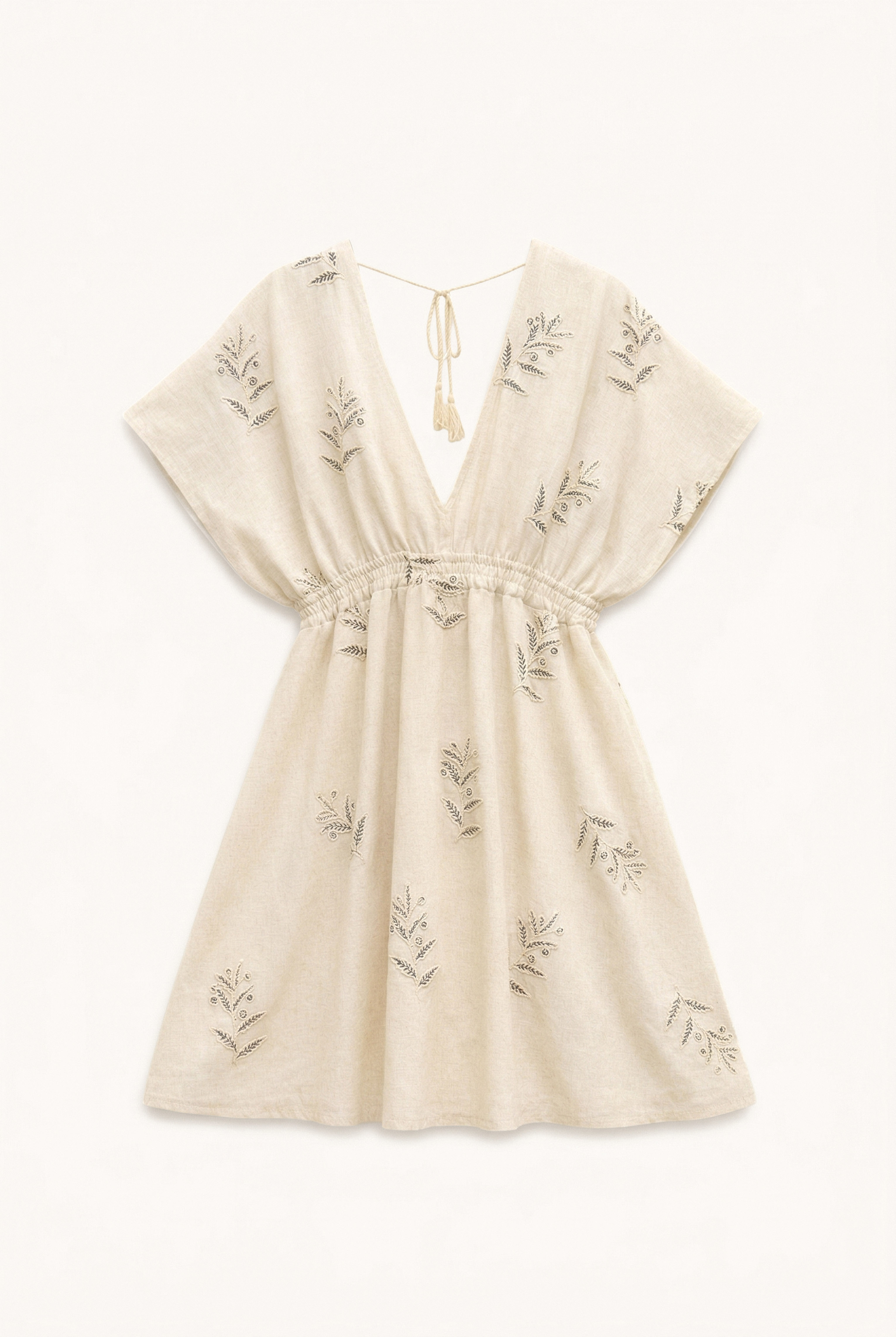 Long dress with floral embroidery in linen blend. Wide short sleeves. Deep V-neck. Open V-back detail with adjustable drawstring and tassels. Elasticated waist with gathered detail. Full skirt. Regular fit, available in size S/M, M/L.