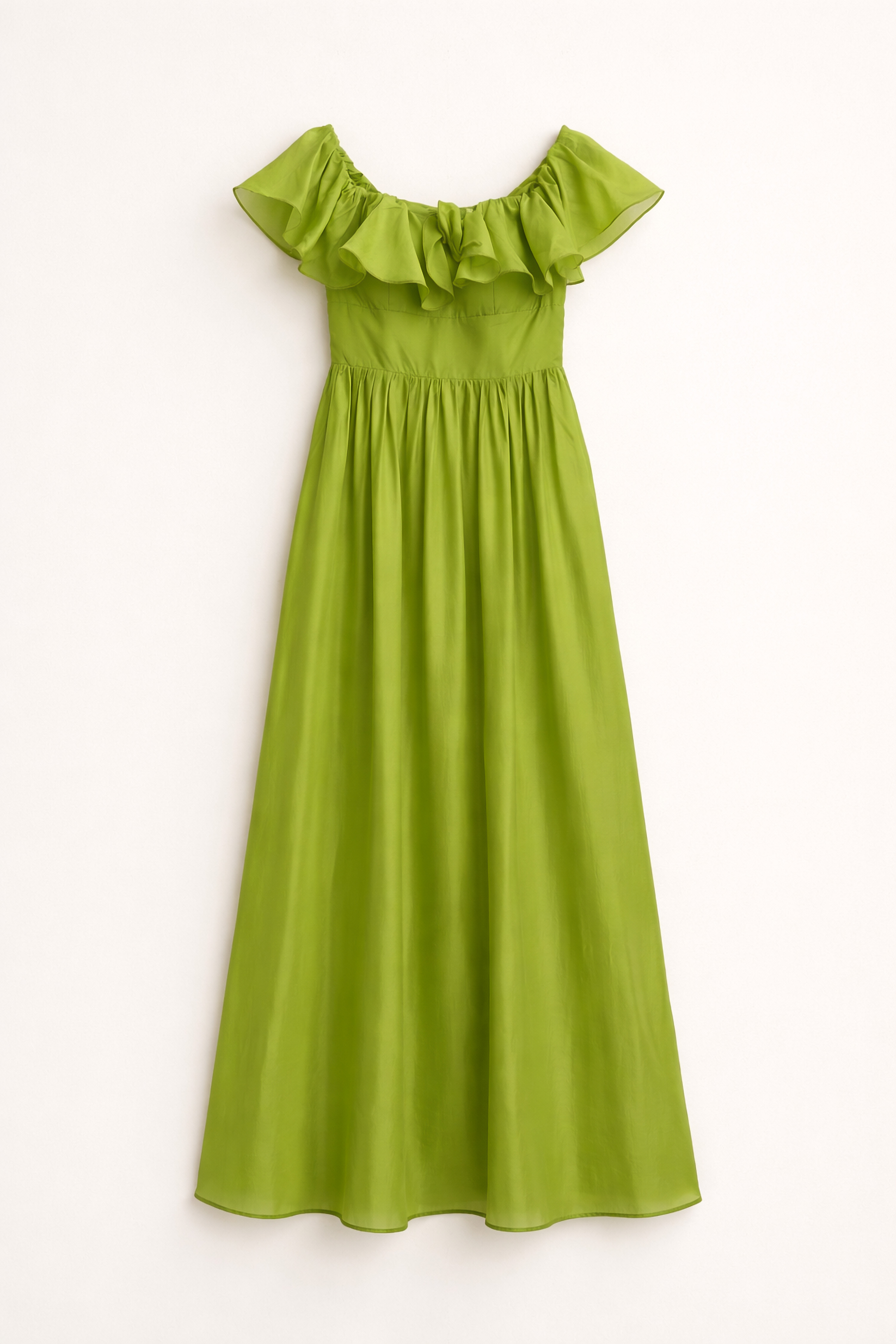 Long dress with wide off-the-shoulder neckline and ruffles.